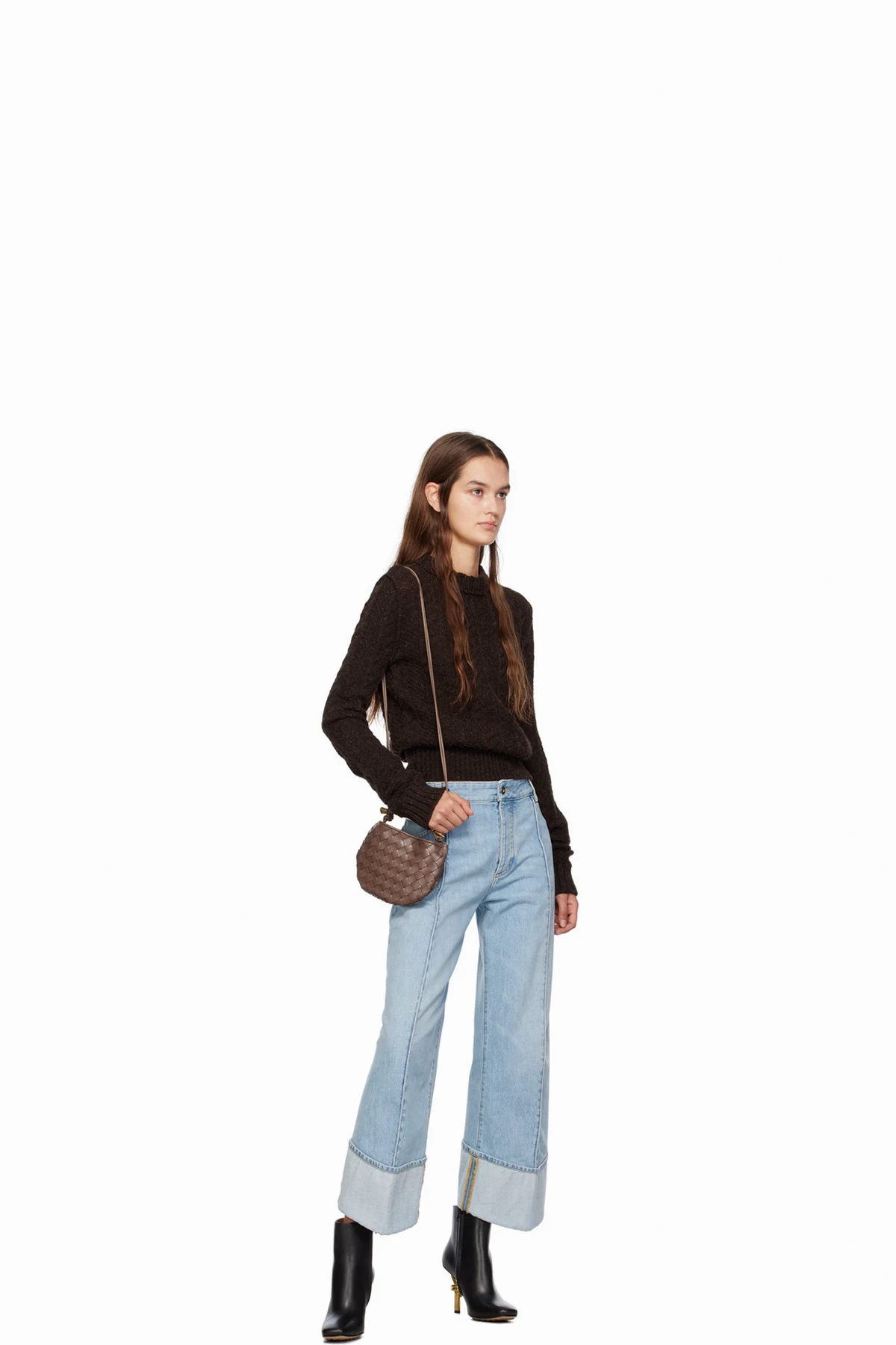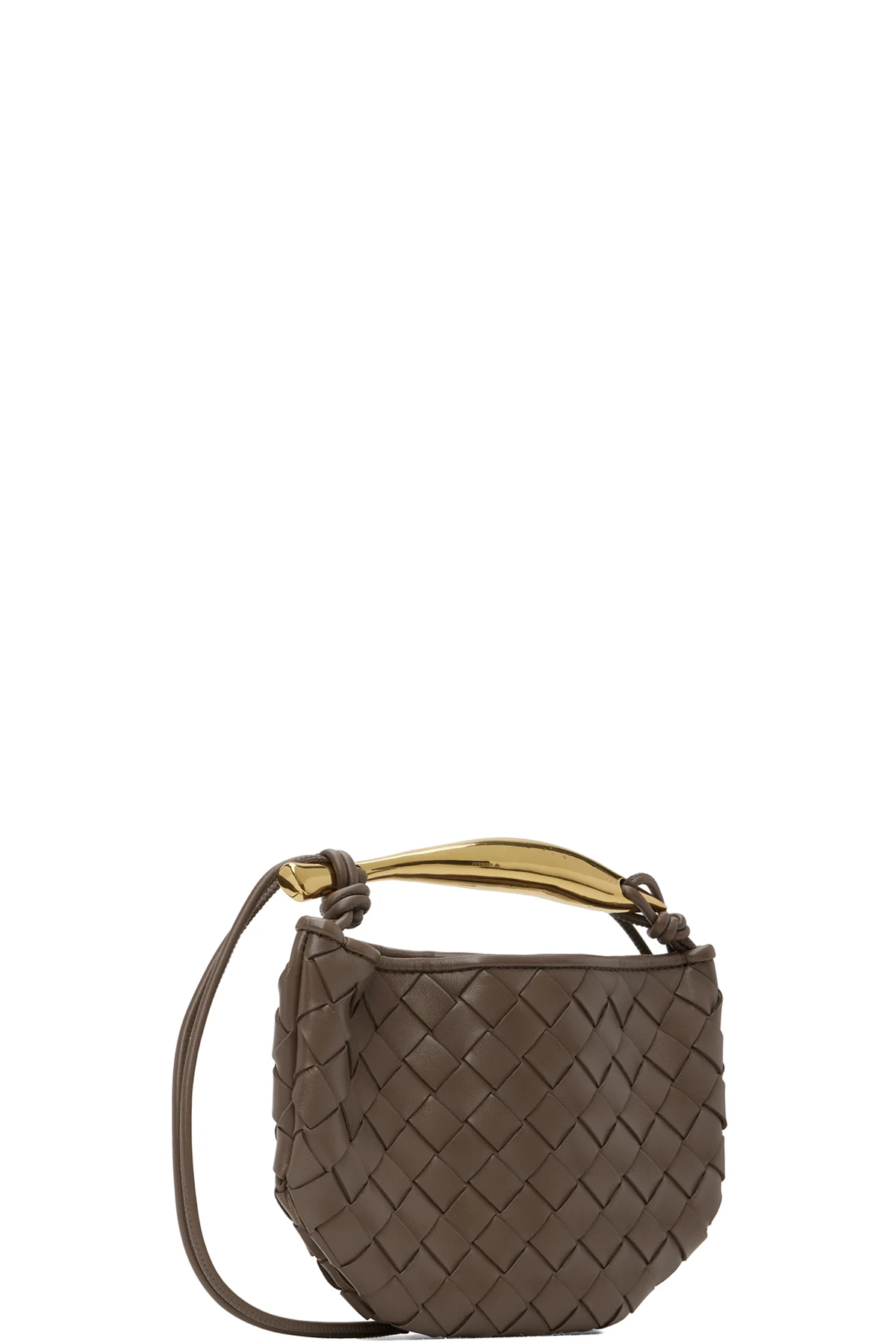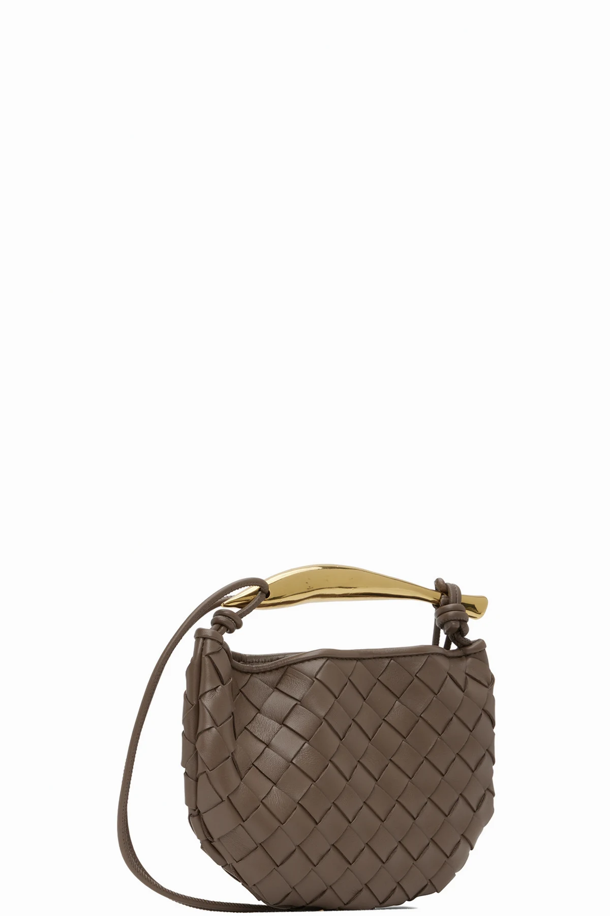 Intrecciato-woven buffed lambskin top handle bag in taupe.