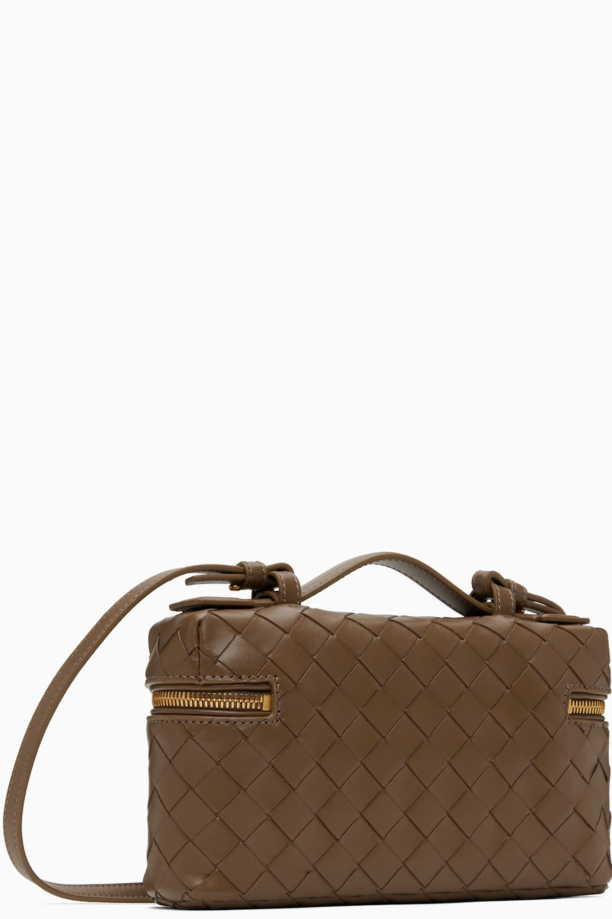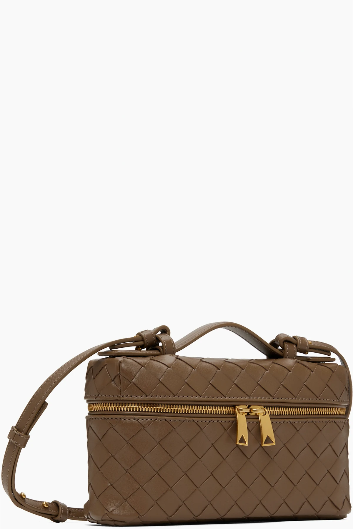 Intrecciato-woven grained calfskin top handle bag in taupe.