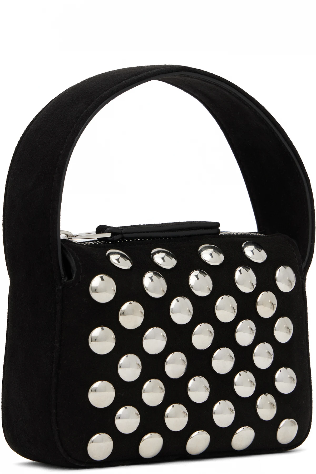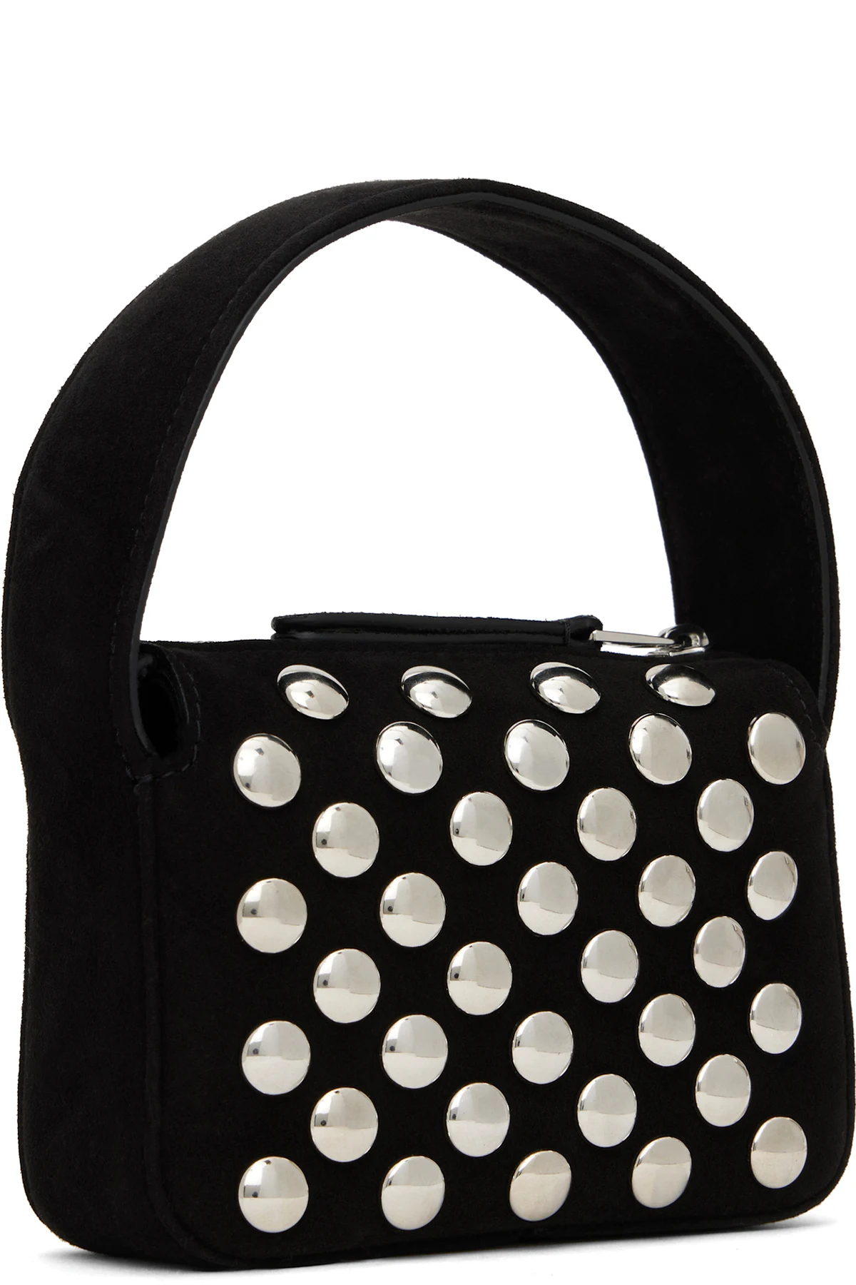 Calfskin suede top handle bag in black.