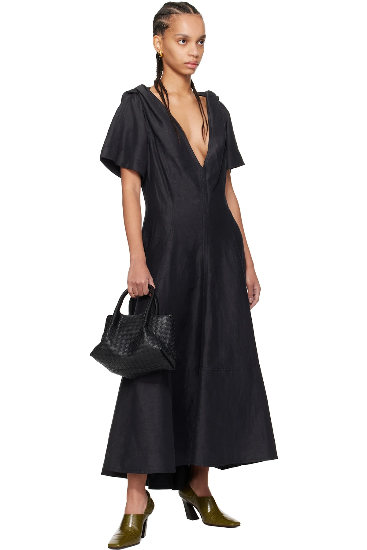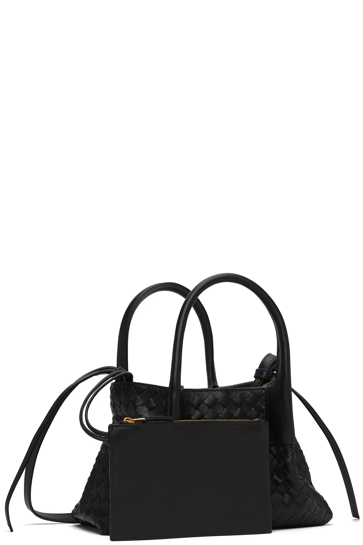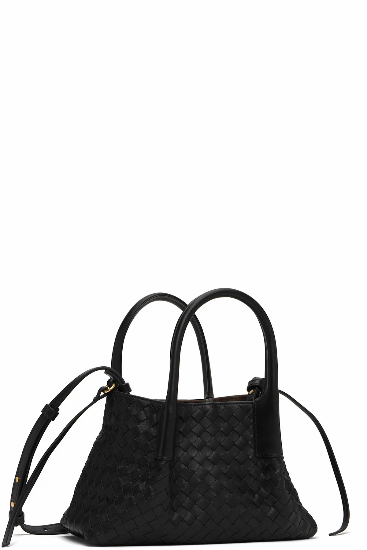Intrecciato-woven grained calfskin top handle bag in black.