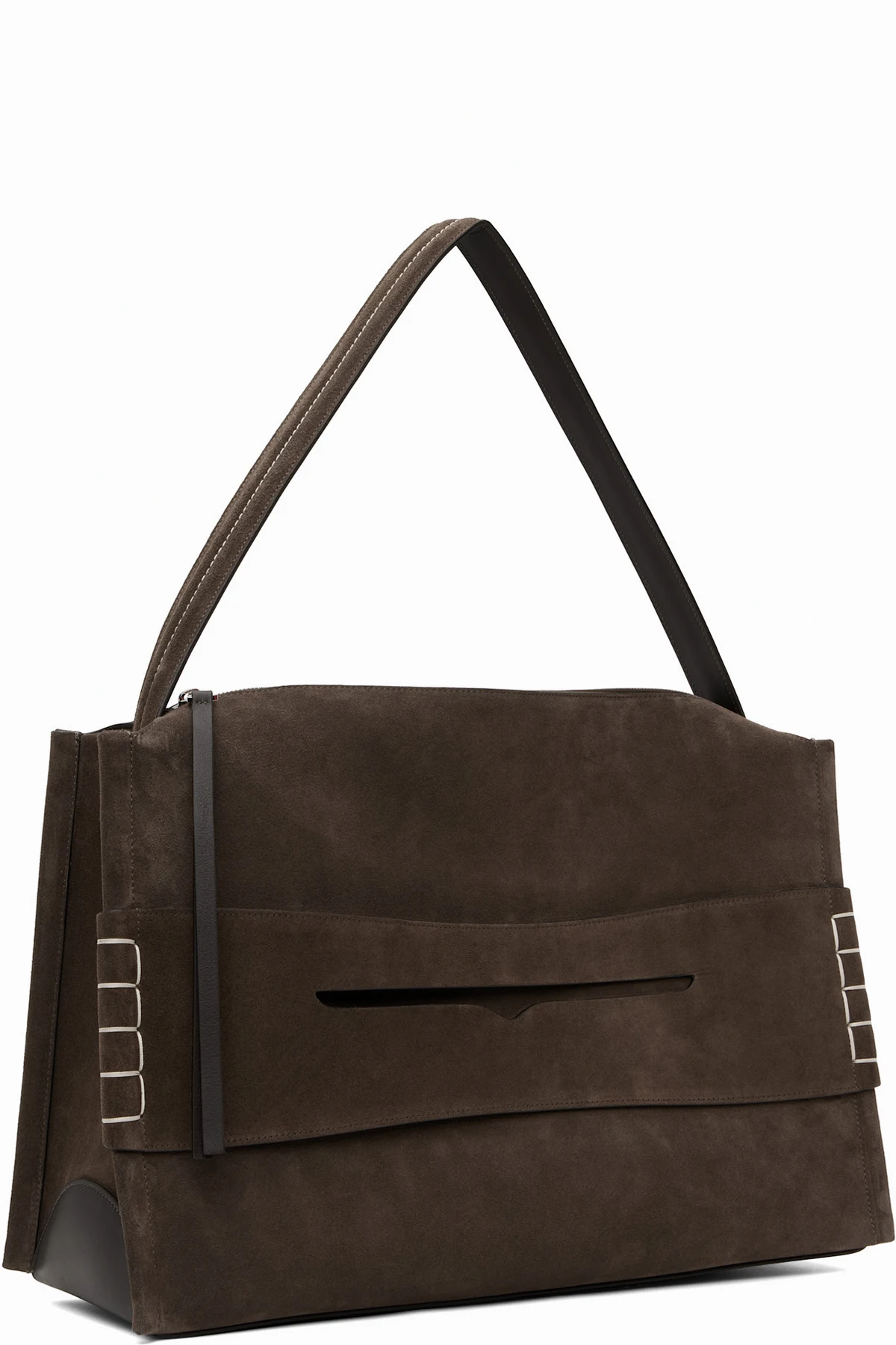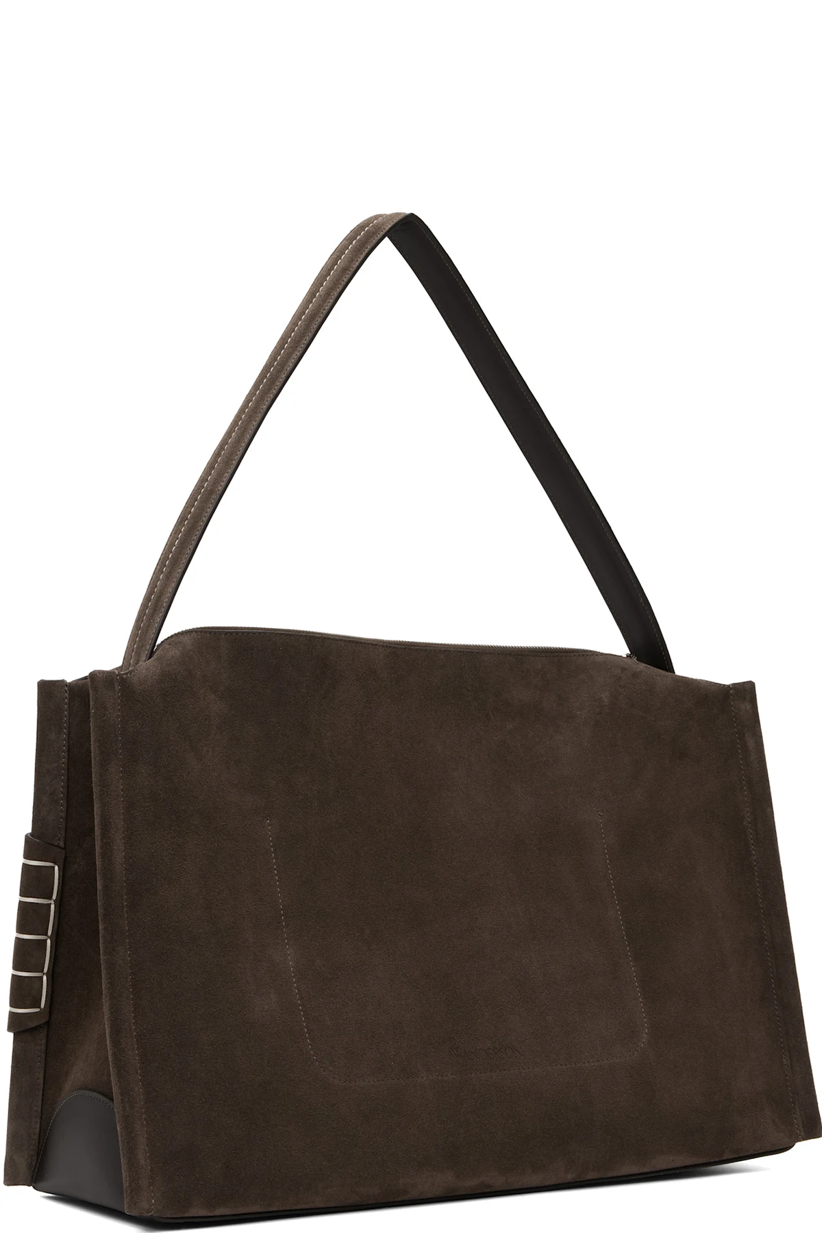 Calfskin suede top handle bag in brown.
