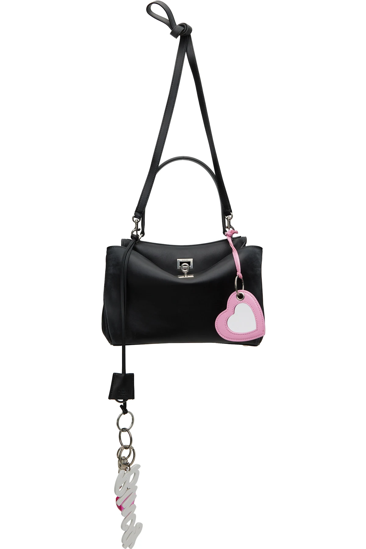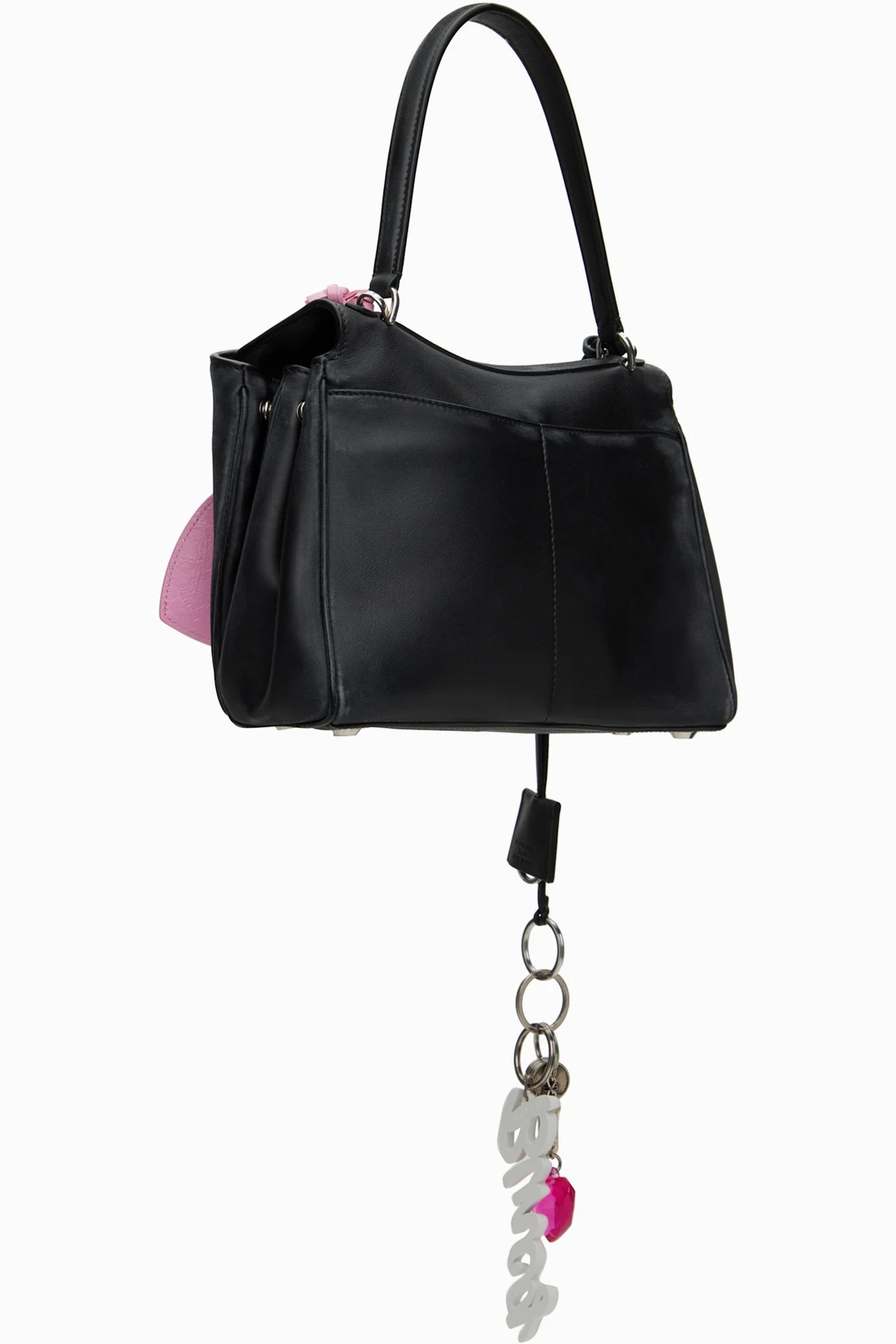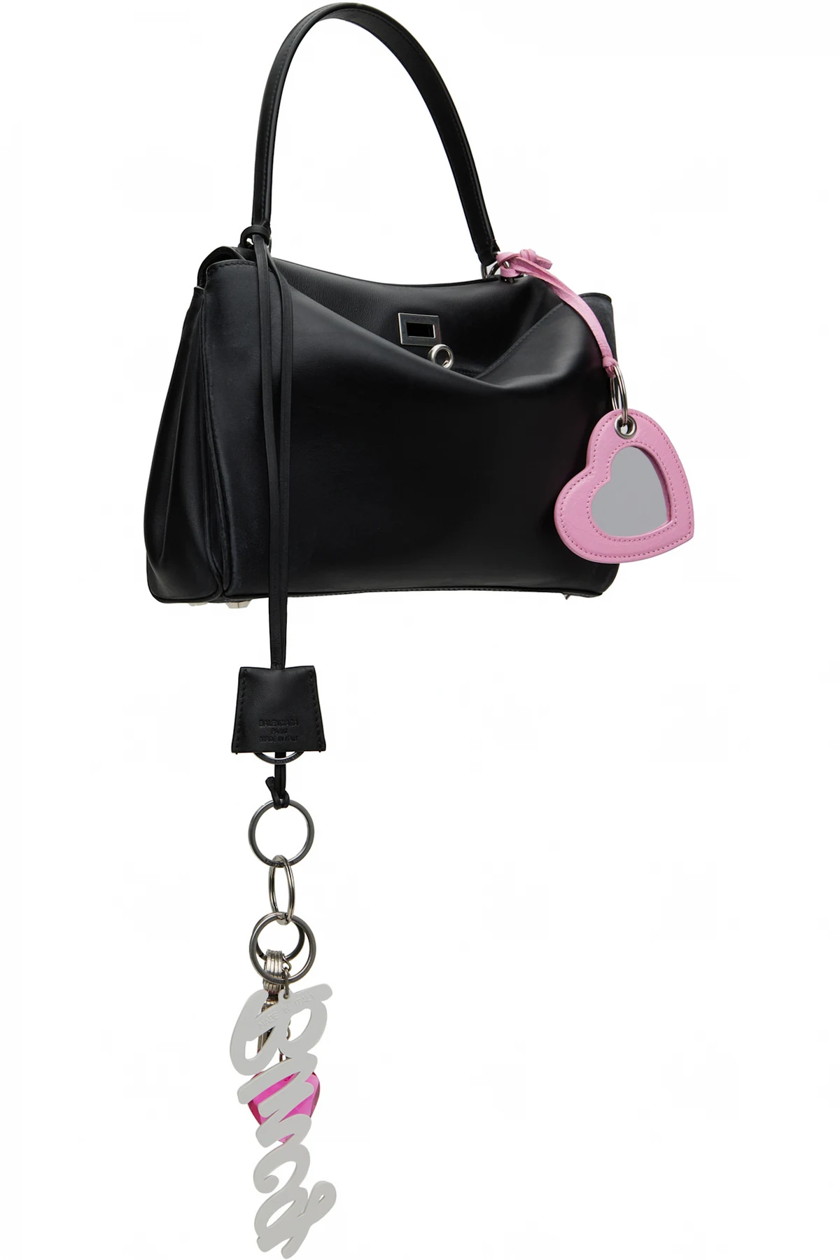 Smooth calfskin top handle bag in black. Detachable sheathed keyring, logo-engraved key charms, graphic charms, and mirror at strap.