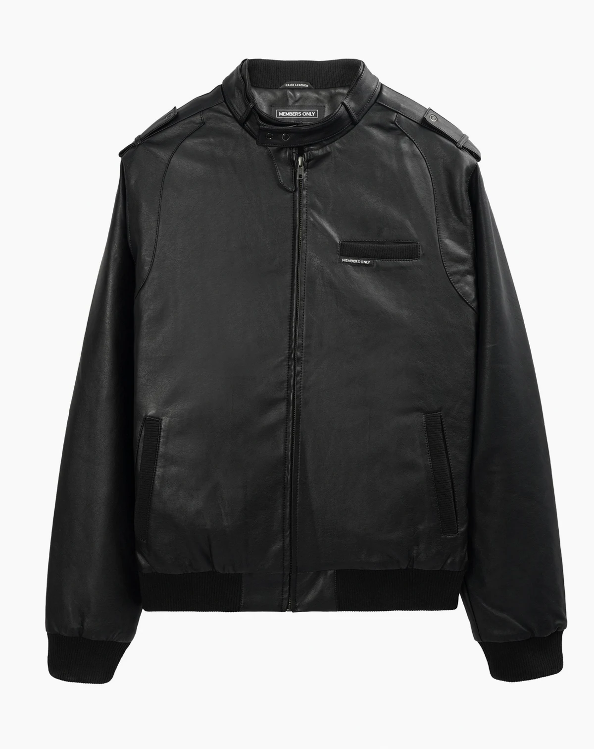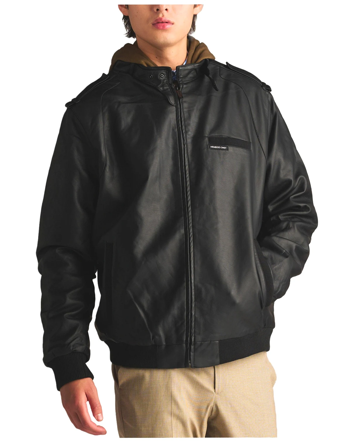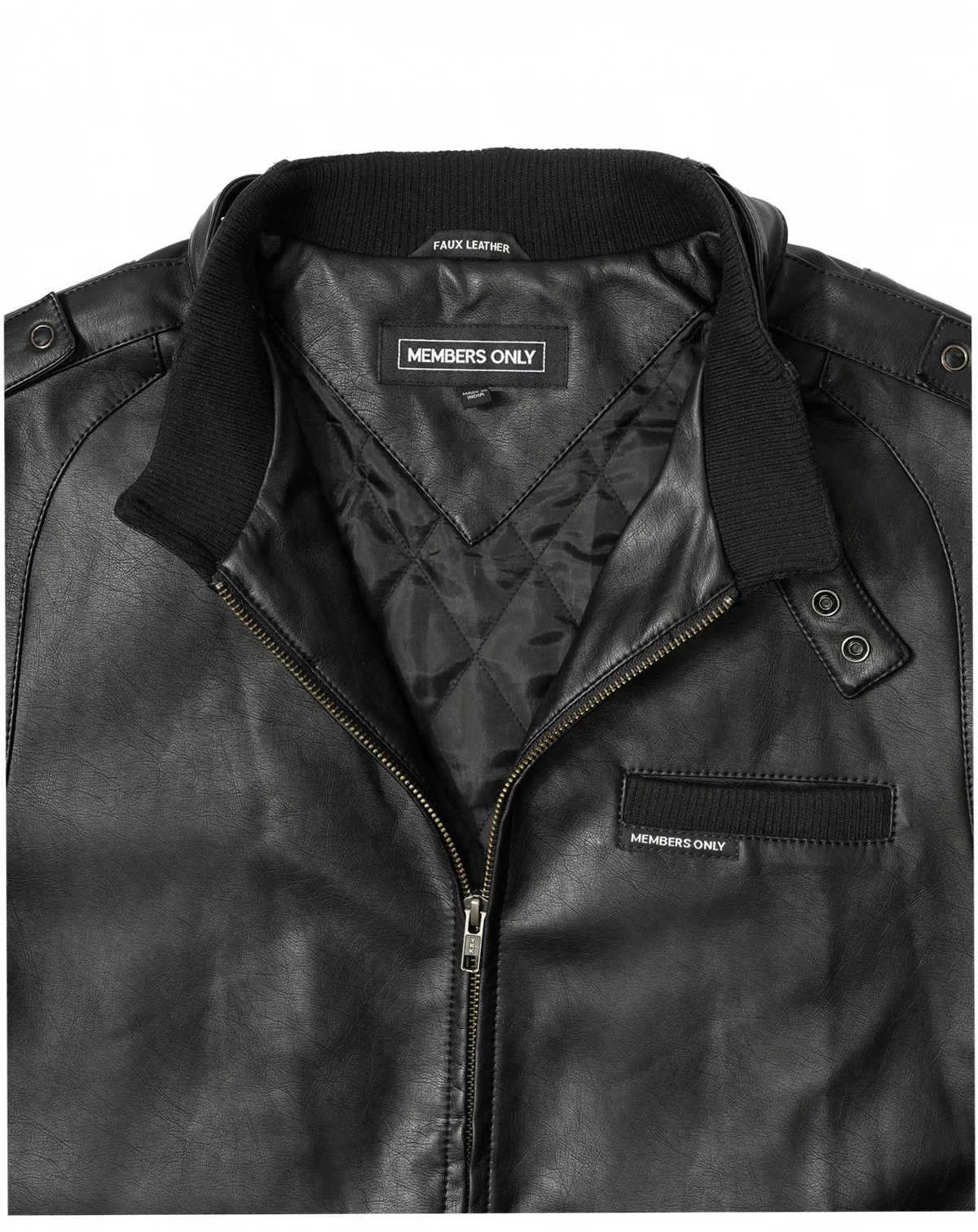Step up your style game with the Men's Faux Leather Iconic Racer Jacket. Crafted from soft, durable fabric with a diamond quilted interior and lightweight poly fill for added warmth, this jacket is perfect for winter, fall, and spring. Signature details like the throat latch, shoulder epaulettes, and sleek chest pocket with logo give it a fresh, modern vibe. Zip closure and multiple pockets make it as functional as it is stylish—perfect for any occasion.