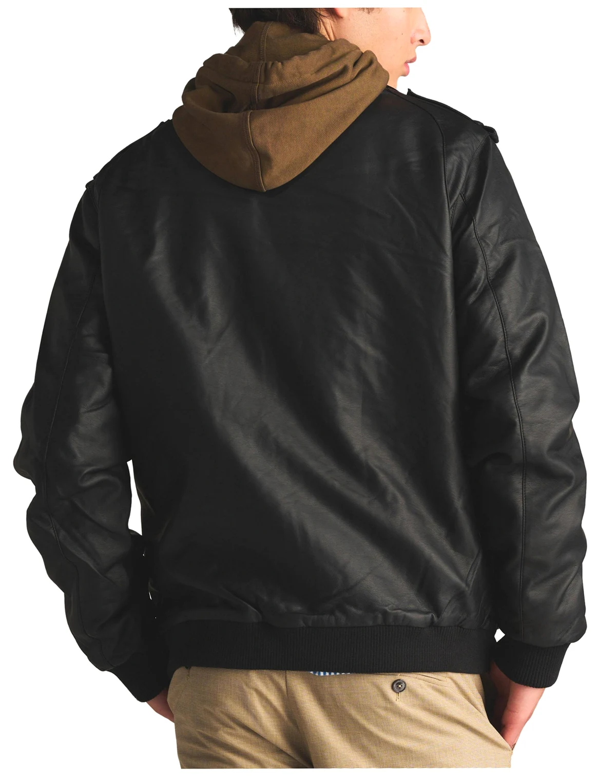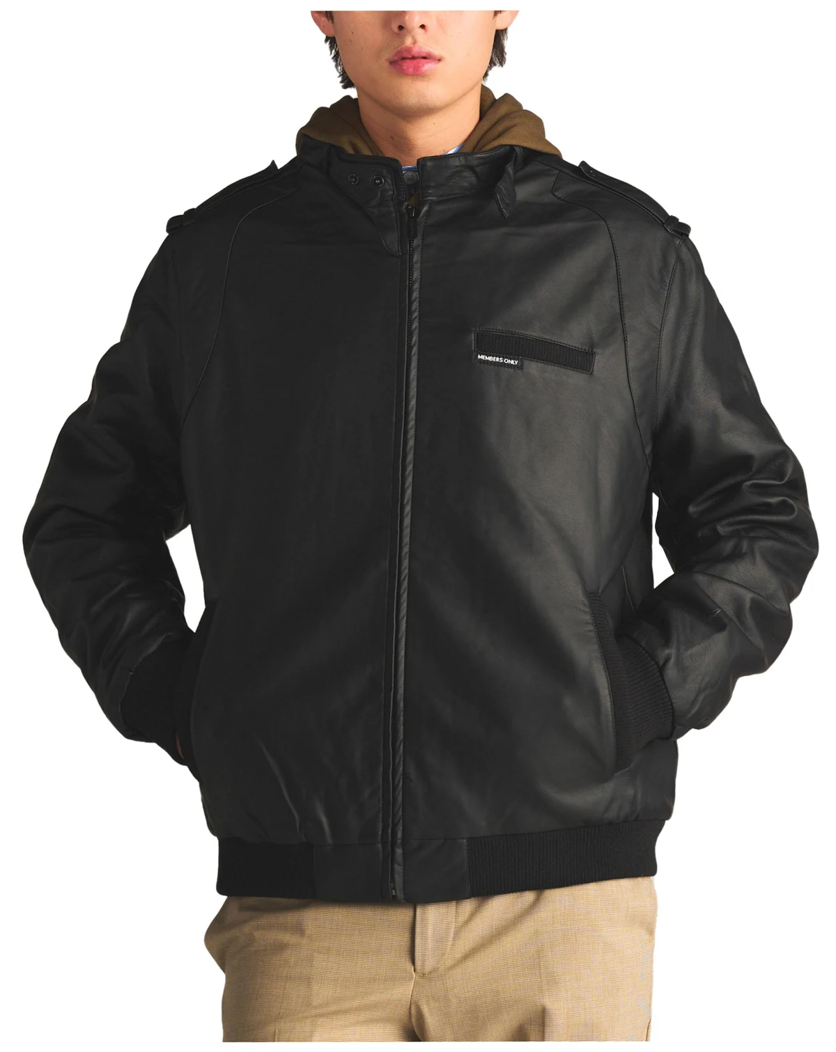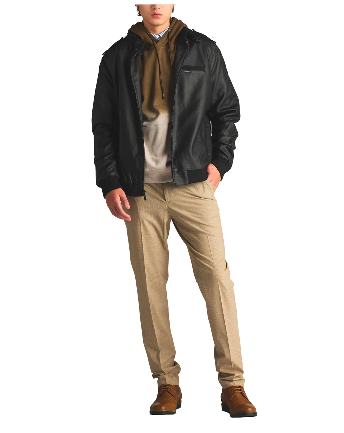 Step up your style game with the Men's Faux Leather Iconic Racer Jacket. Crafted from soft, durable fabric with a diamond quilted interior and lightweight poly fill for added warmth, this jacket is perfect for winter, fall, and spring. Signature details like the throat latch, shoulder epaulettes, and sleek chest pocket with logo give it a fresh, modern vibe. Zip closure and multiple pockets make it as functional as it is stylish—perfect for any occasion.