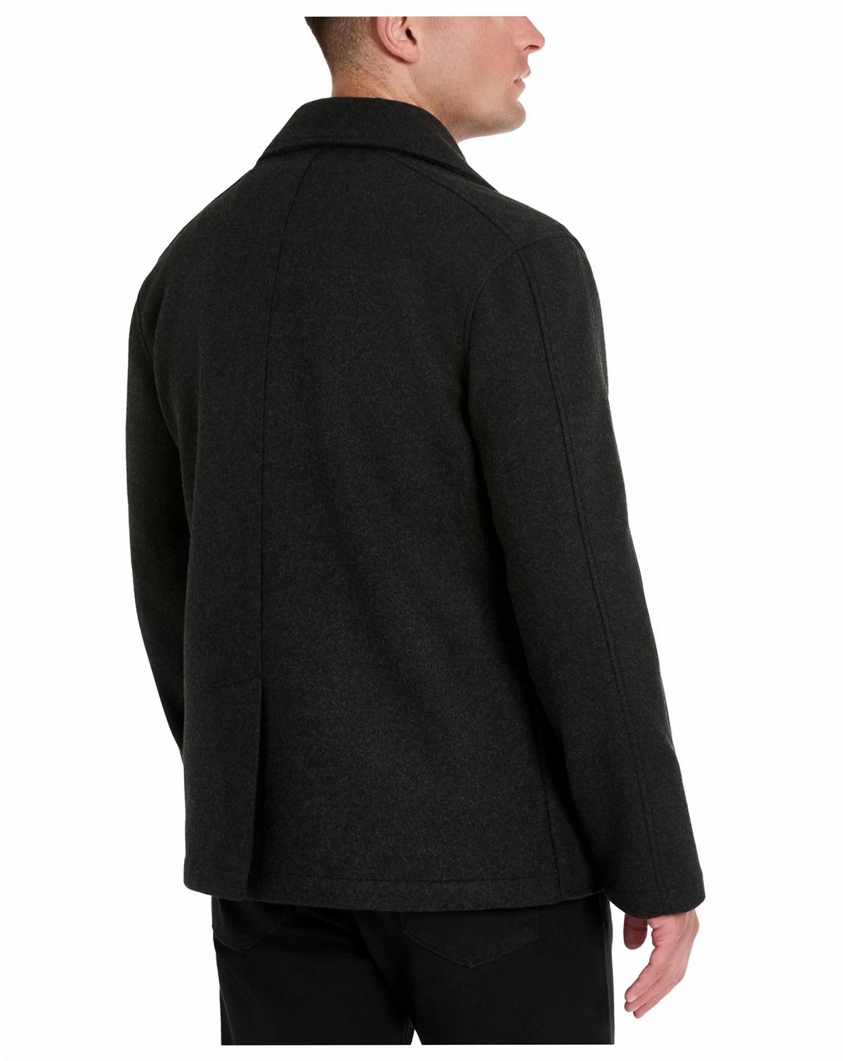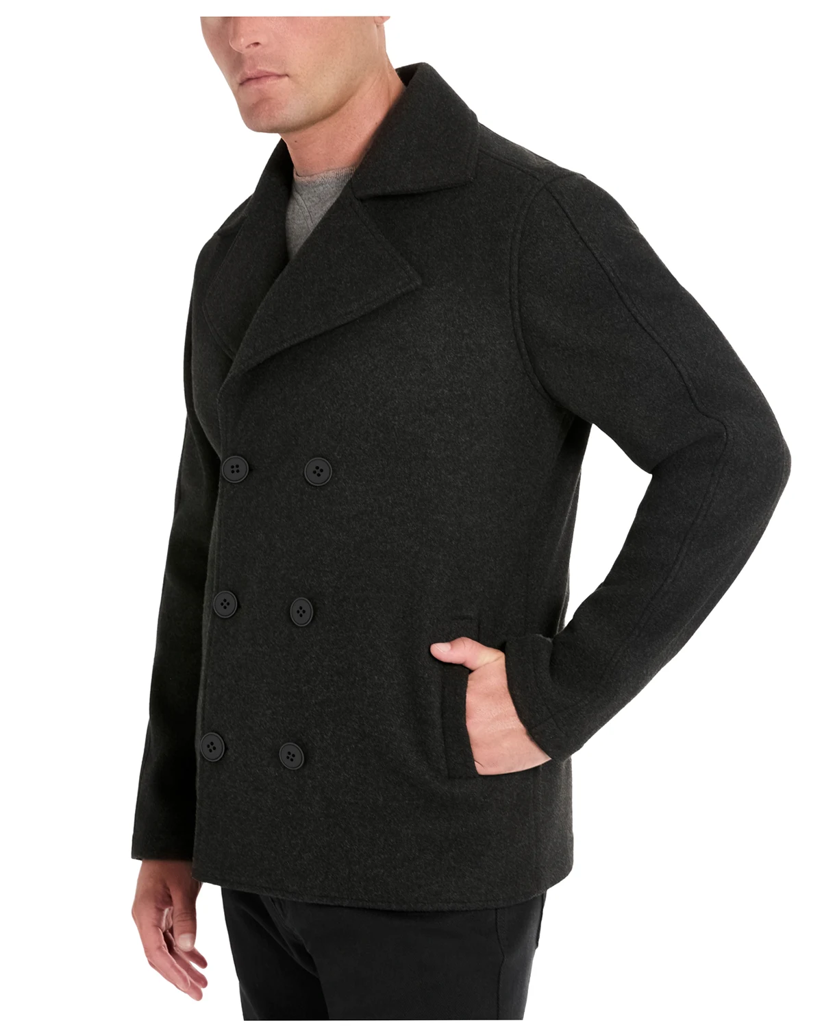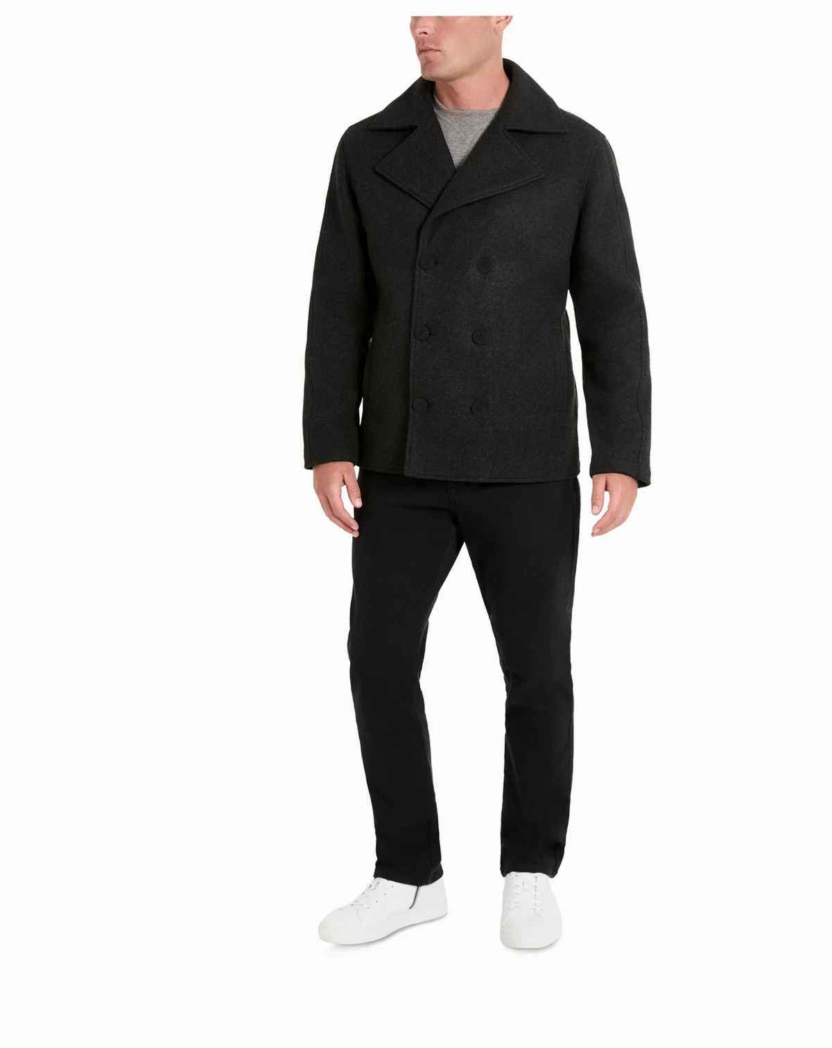 Designed for movement, Kenneth Cole's slim peacoat features four-way stretch fabric and classic double-breasted styling.