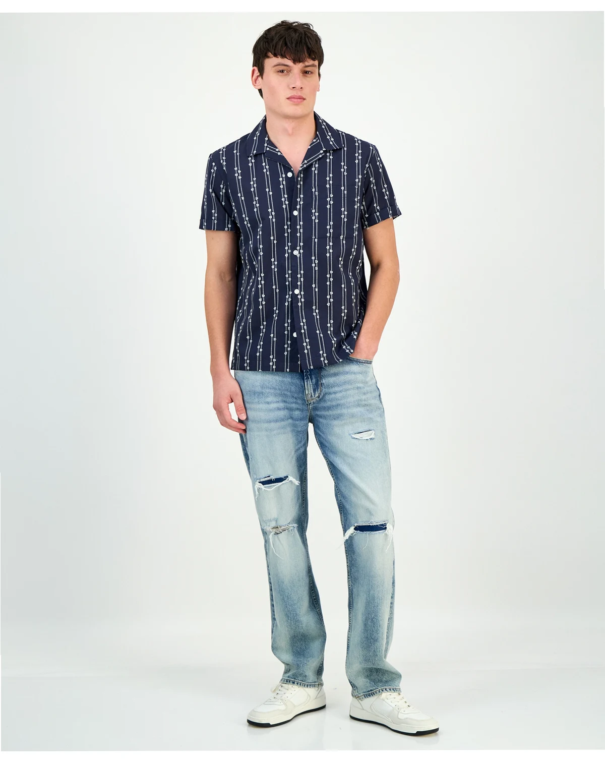 In a resort-ready style, this short sleeve camp shirt from Sun + Stone can be dressed up or down for maximum versatility.