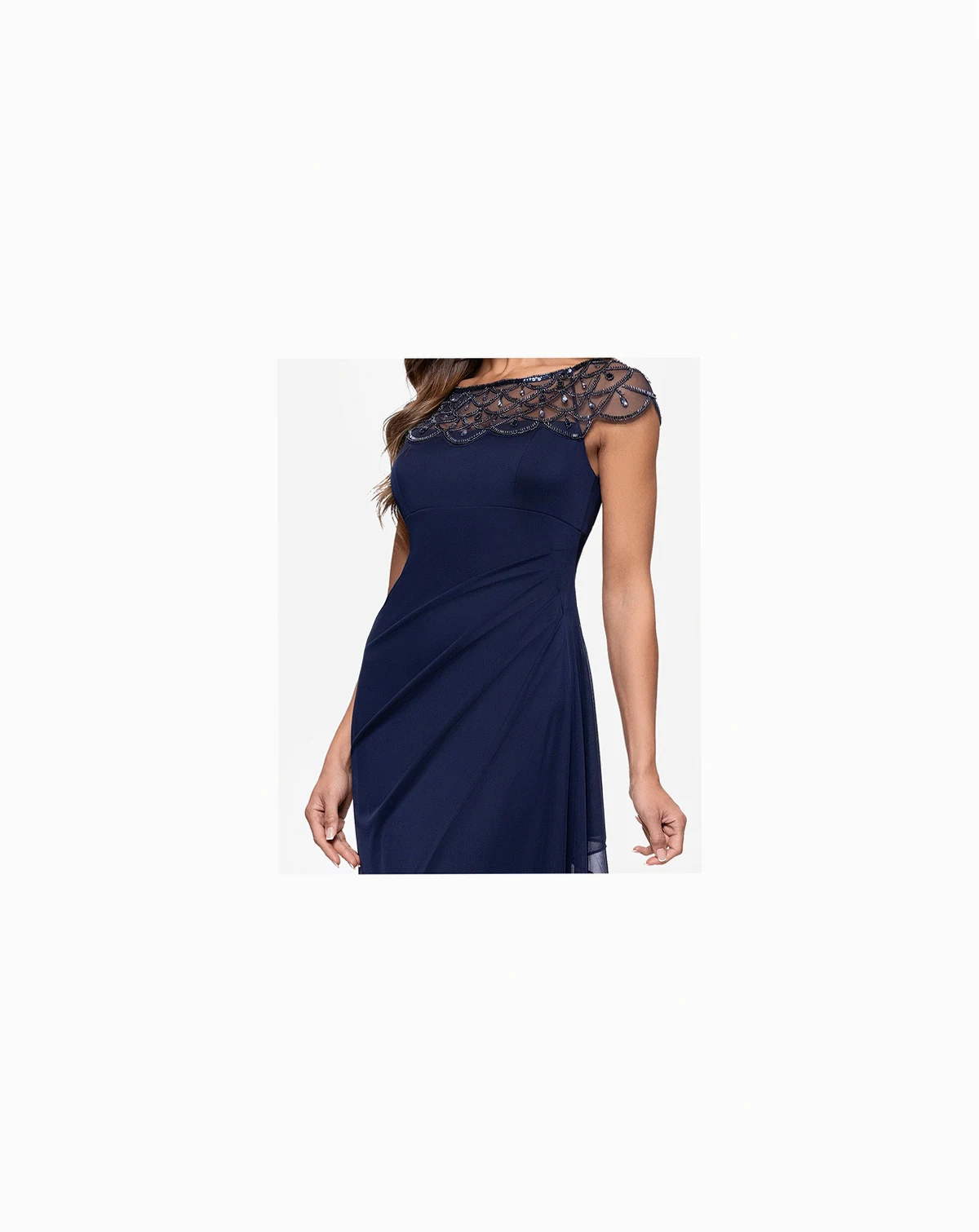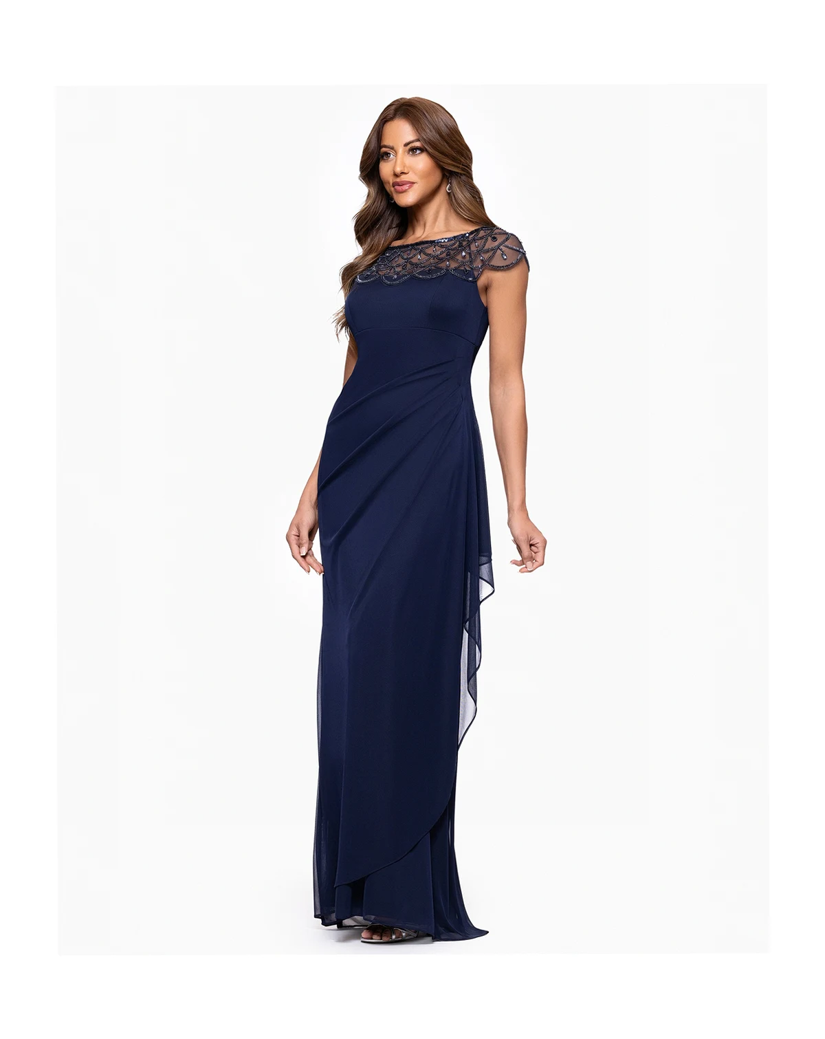 Amp up your elegance with this dress by XSCAPE, featuring a sophisticated boat neck and short sleeves. Its graceful sheath silhouette and long length make it a standout choice for celebratory occasions.