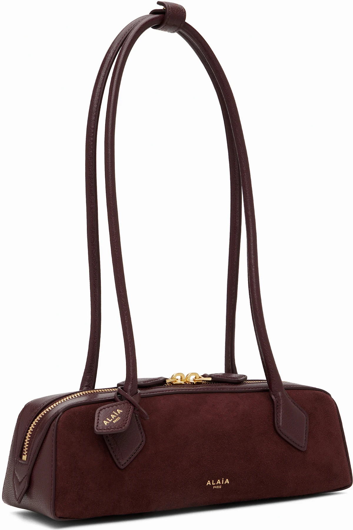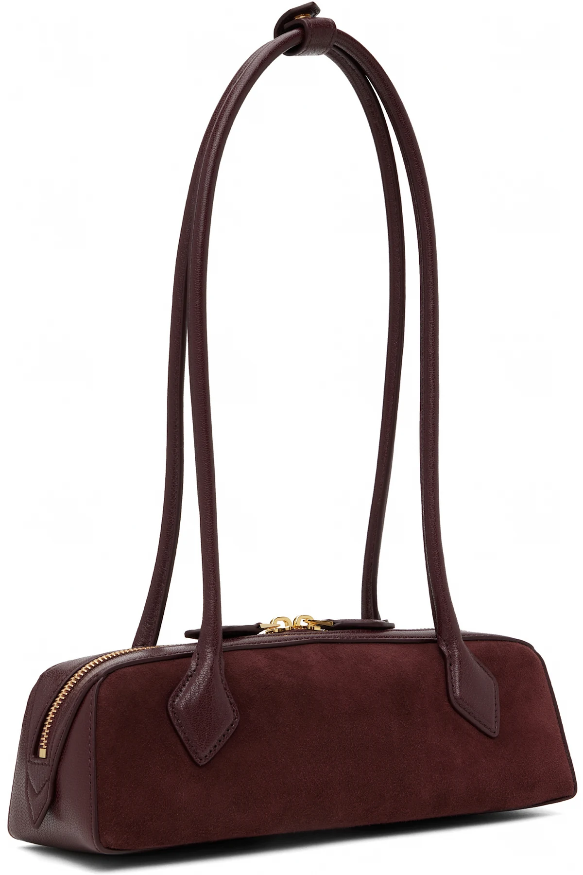 Grained goatskin and goatskin suede top handle bag in burgundy.