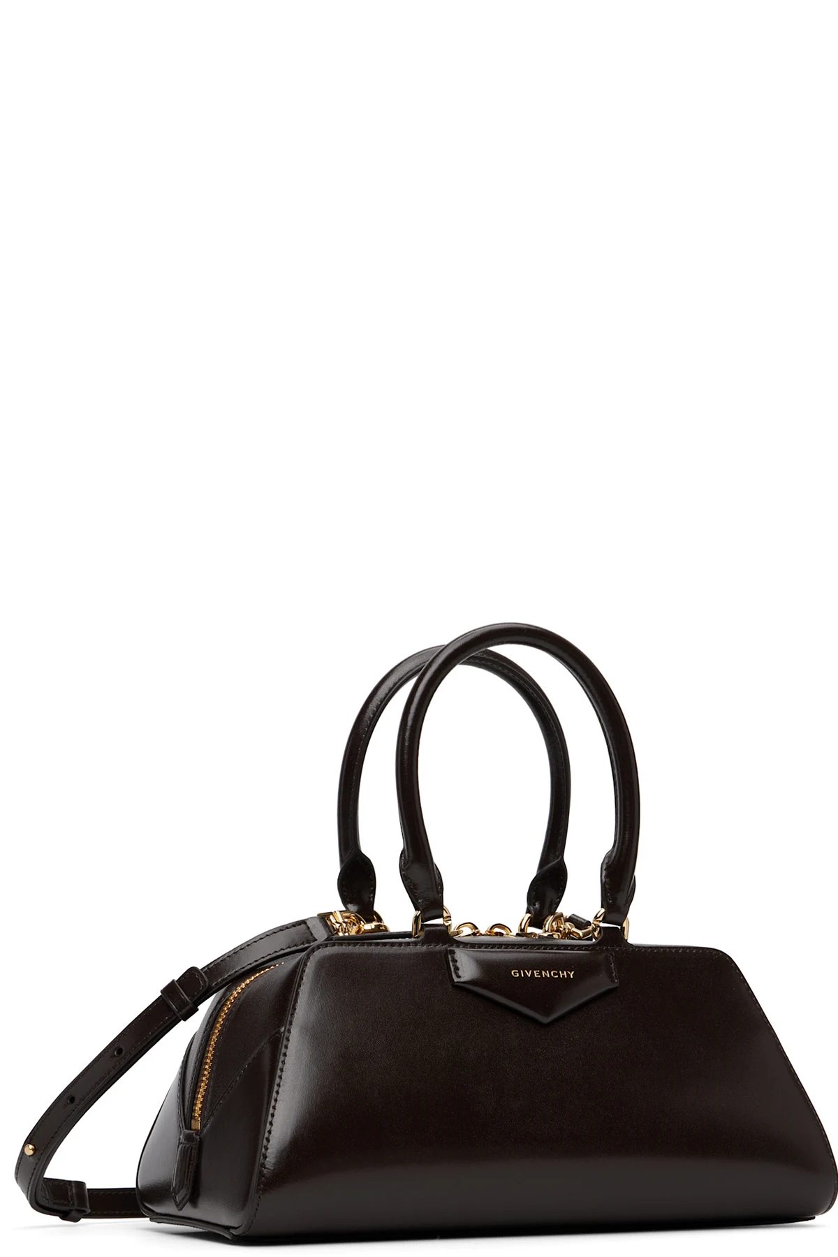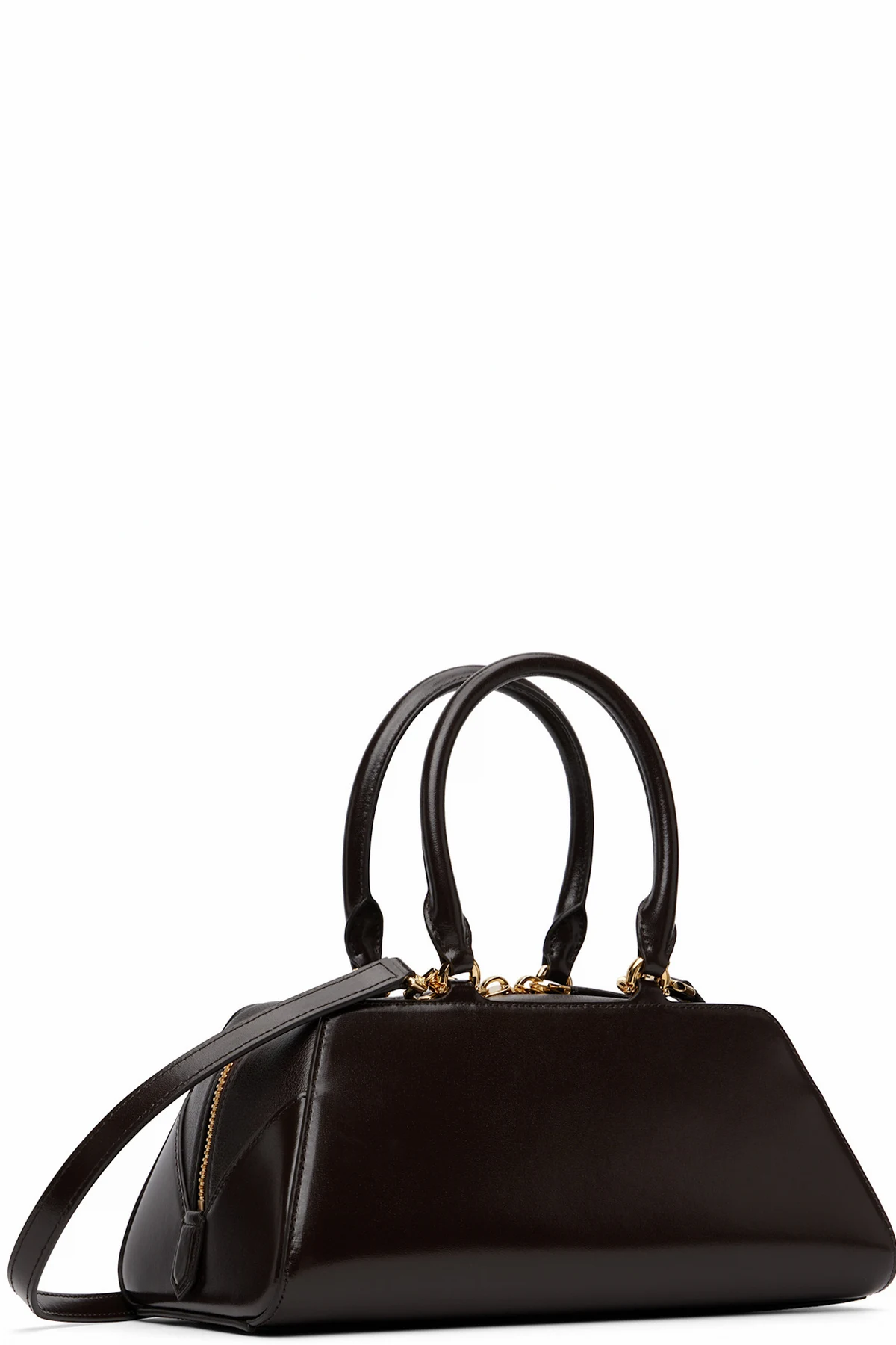 Polished box calfskin and pebble-grained buffalo leather top handle bag.