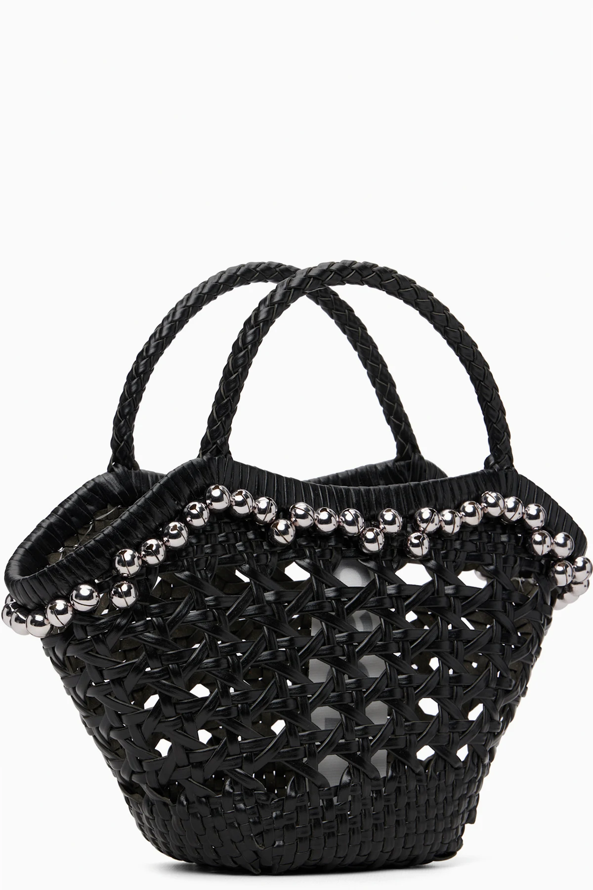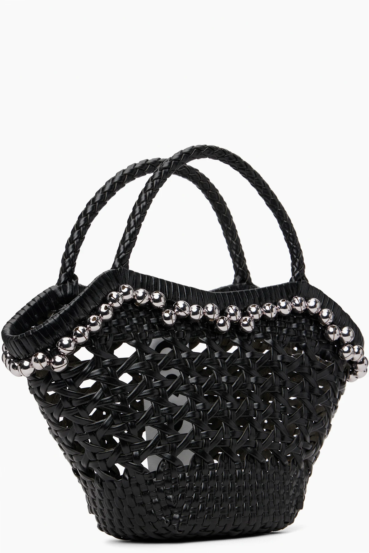 Basket-woven recycled leather top handle bag.