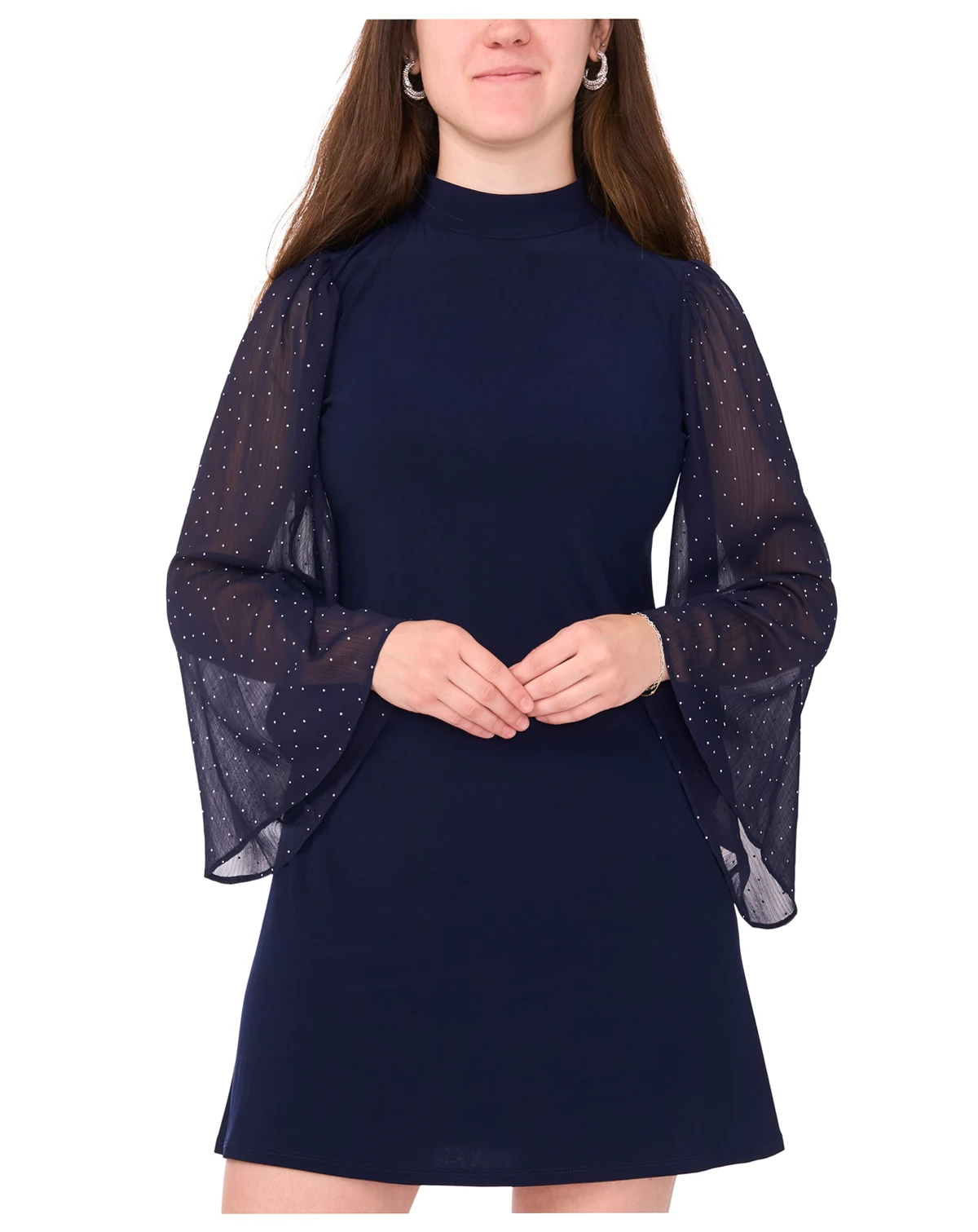 A stunning choice for cocktail nights and parties, this dress from MSK features a mock neckline, bell sleeves, and button-front detailing, finished with a loop-and-button closure for a flattering, knee-length fit.