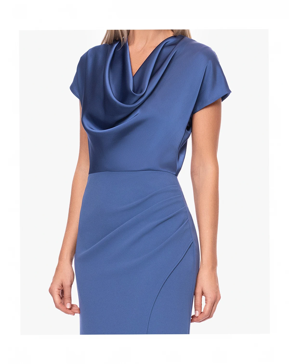 With modern sophistication, this Betsy & Adam long dress features a draped cowl neckline that softens the silhouette and adds visual depth. A center-back zipper provides clean structure, supporting confident wear for evening occasions.