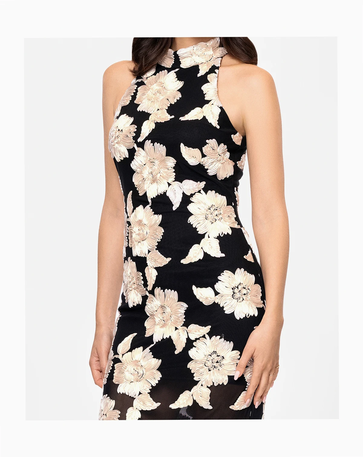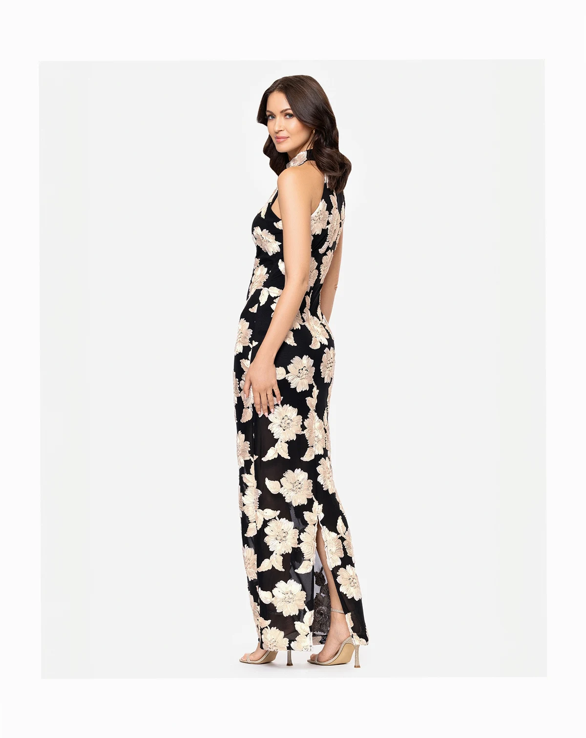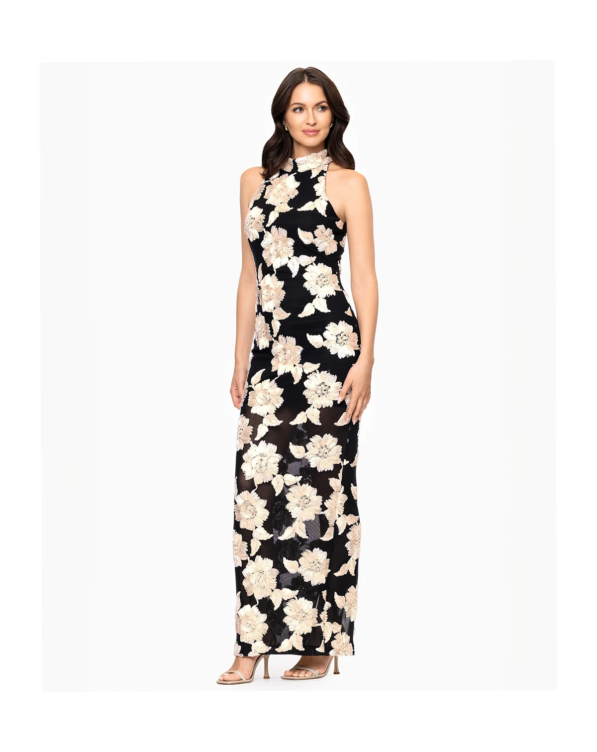 Adorn your look with intricate 3D embroidered flowers on this chic Betsy & Adam halter dress. The sleek sheath silhouette ensures a close, tailored fit that is both modern and elegant.