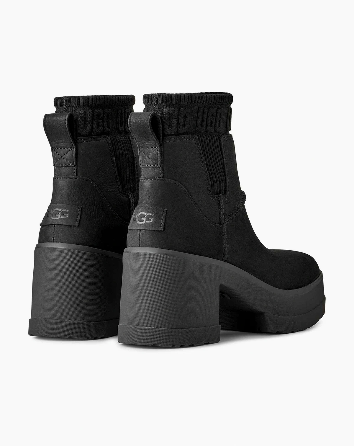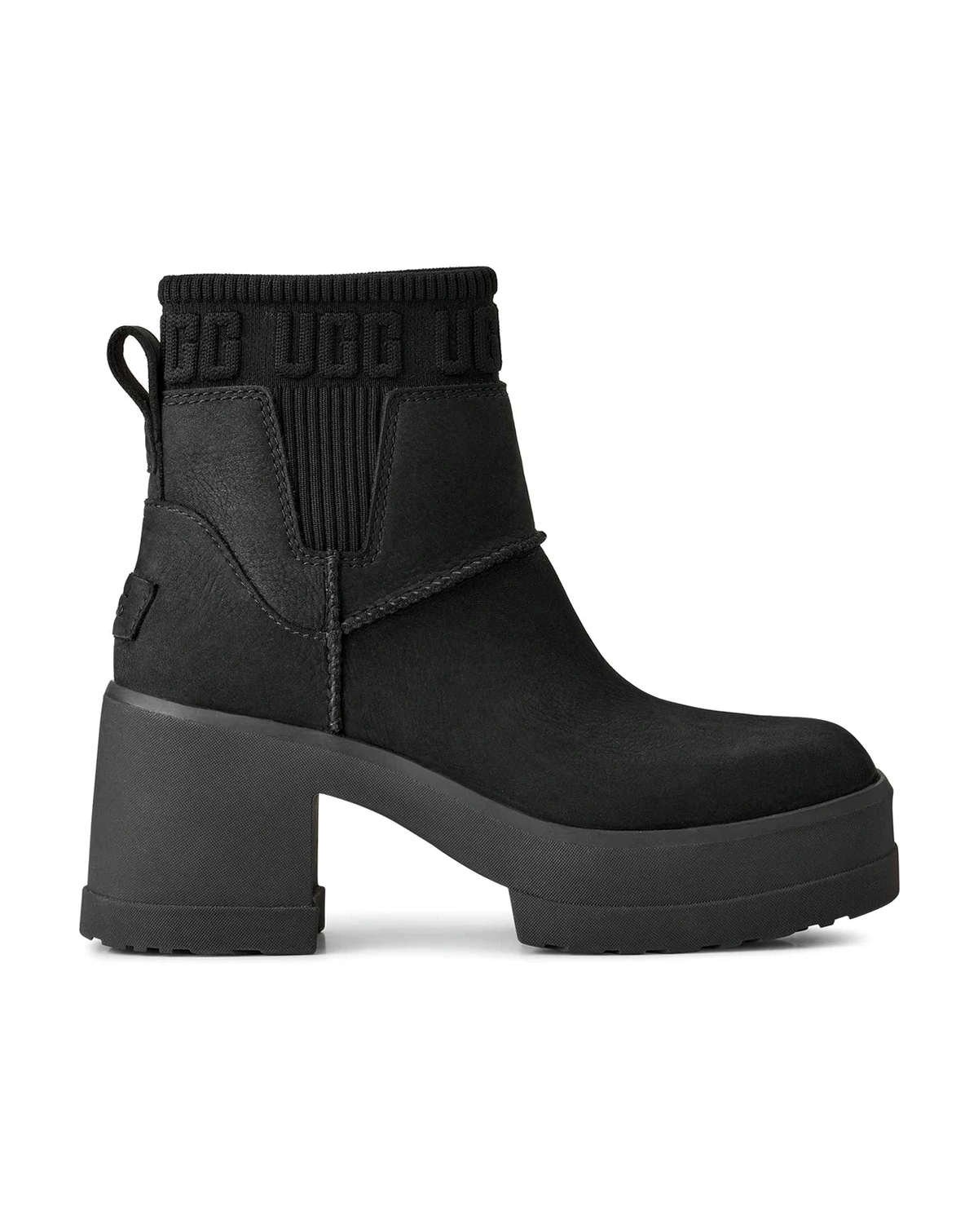 If you love our Brooklyn boot, you'll adore our Moxy Chelsea. It delivers the features you love about our Brooklyn like the chunky lug sole, Twin Seam details, and The Graphic UGG® Font knit gore, and adds a chic, square toe. The upper is crafted with water-resistant leather and lined with soft microfiber for wear-all-day comfort. Set upon a lightweight rubber outsole that adds 2" of height at the platform, and 3" at the heel.