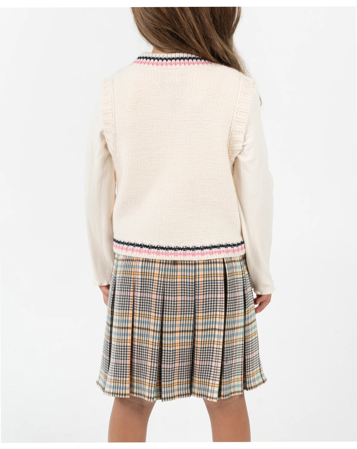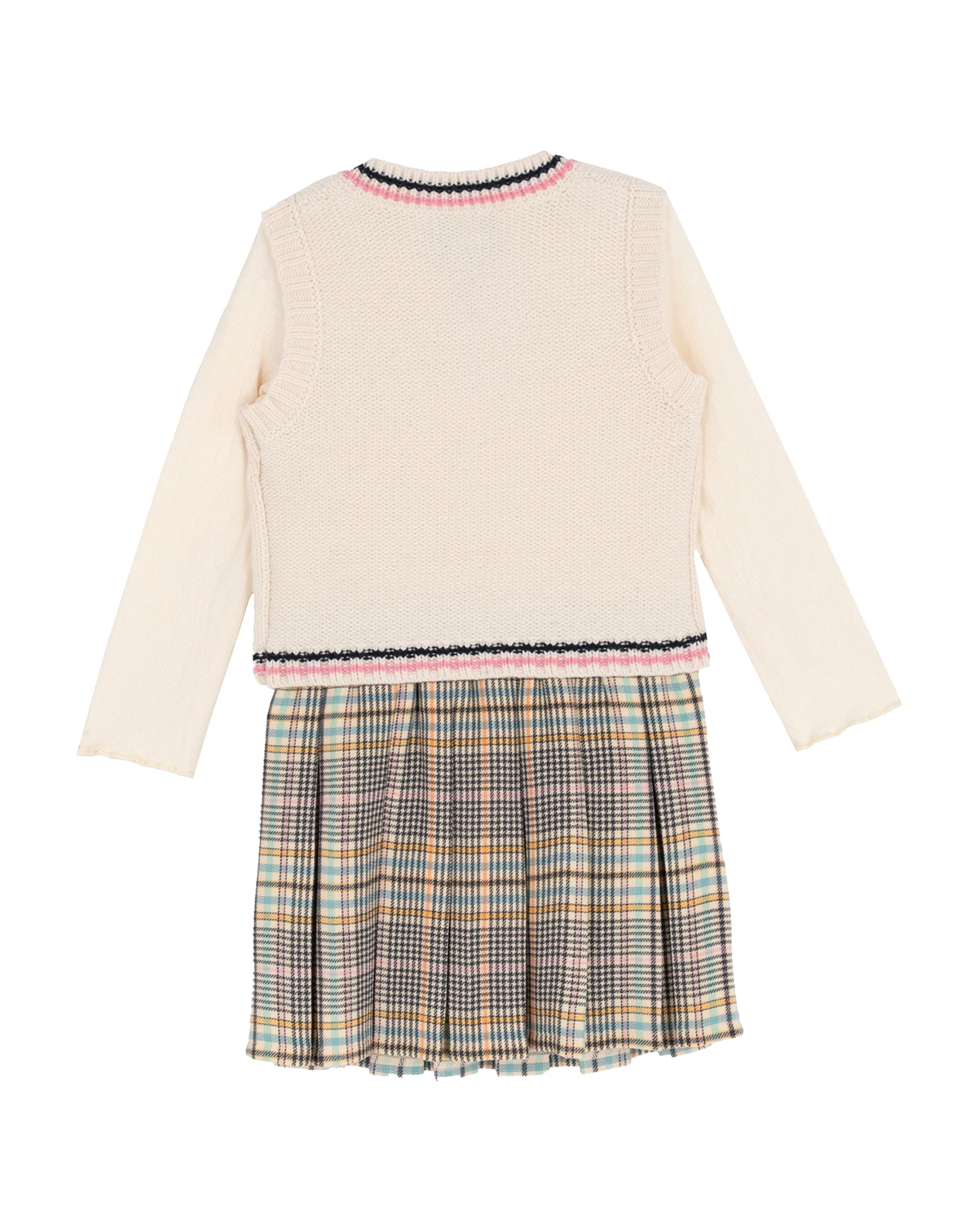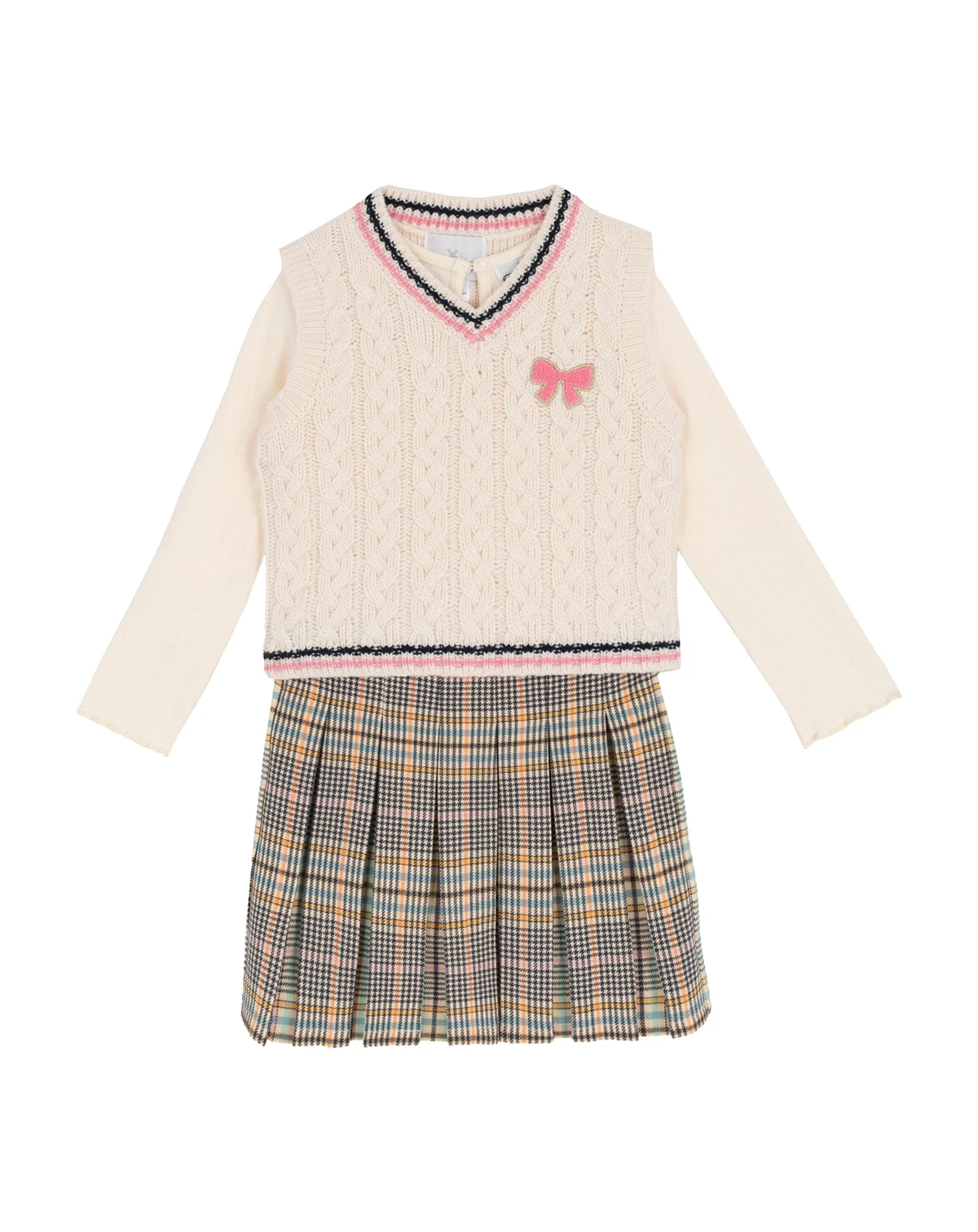 Perfectly preppy and cozy-chic, this 2-in-1 dress layers a rib knit top and classic plaid pleated skort with a removable cable-knit vest—topped with varsity-style stripes and a sweet bow for a classroom-ready outfit that's full of charm.