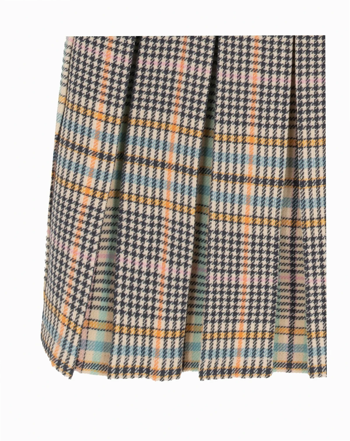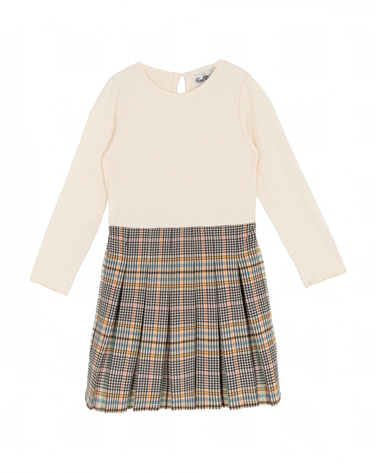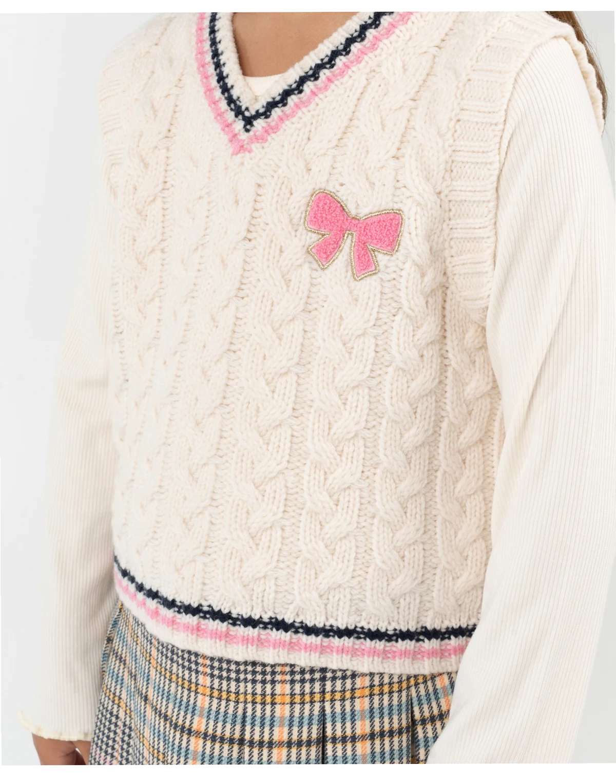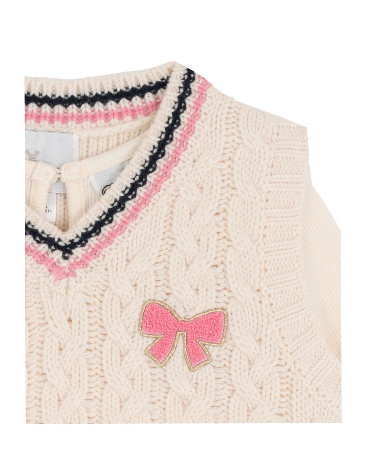 Perfectly preppy and cozy-chic, this 2-in-1 dress layers a rib knit top and classic plaid pleated skort with a removable cable-knit vest—topped with varsity-style stripes and a sweet bow for a classroom-ready outfit that's full of charm.