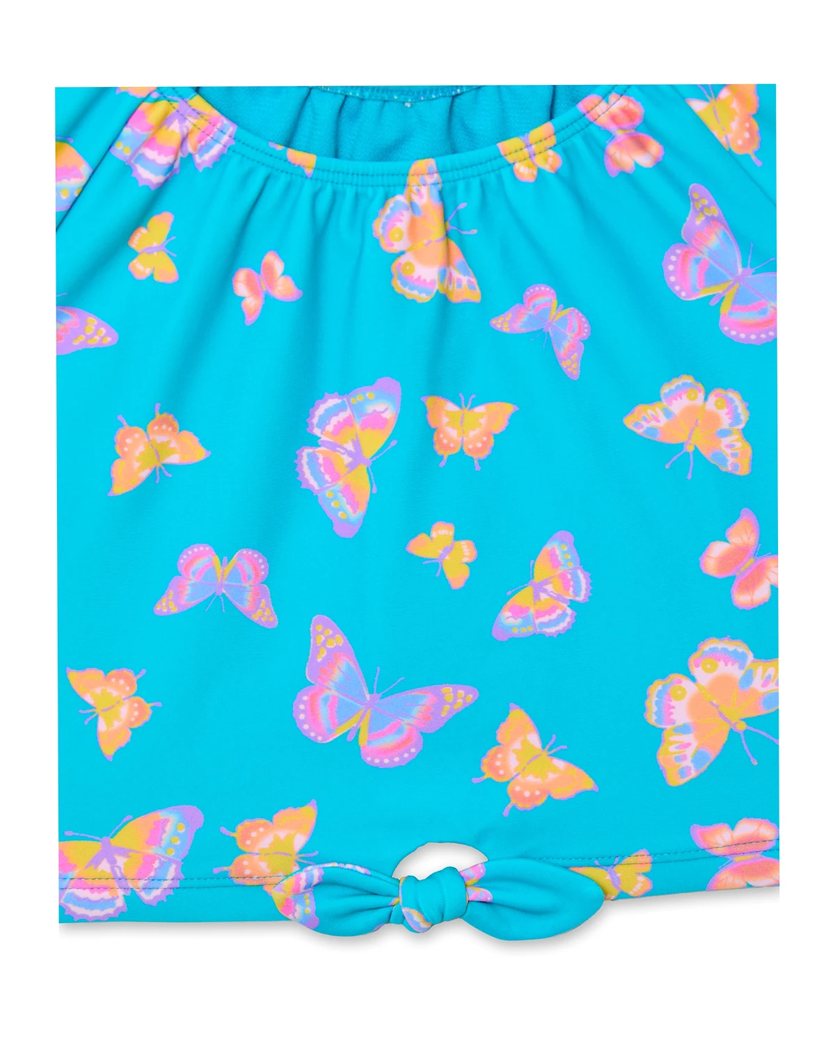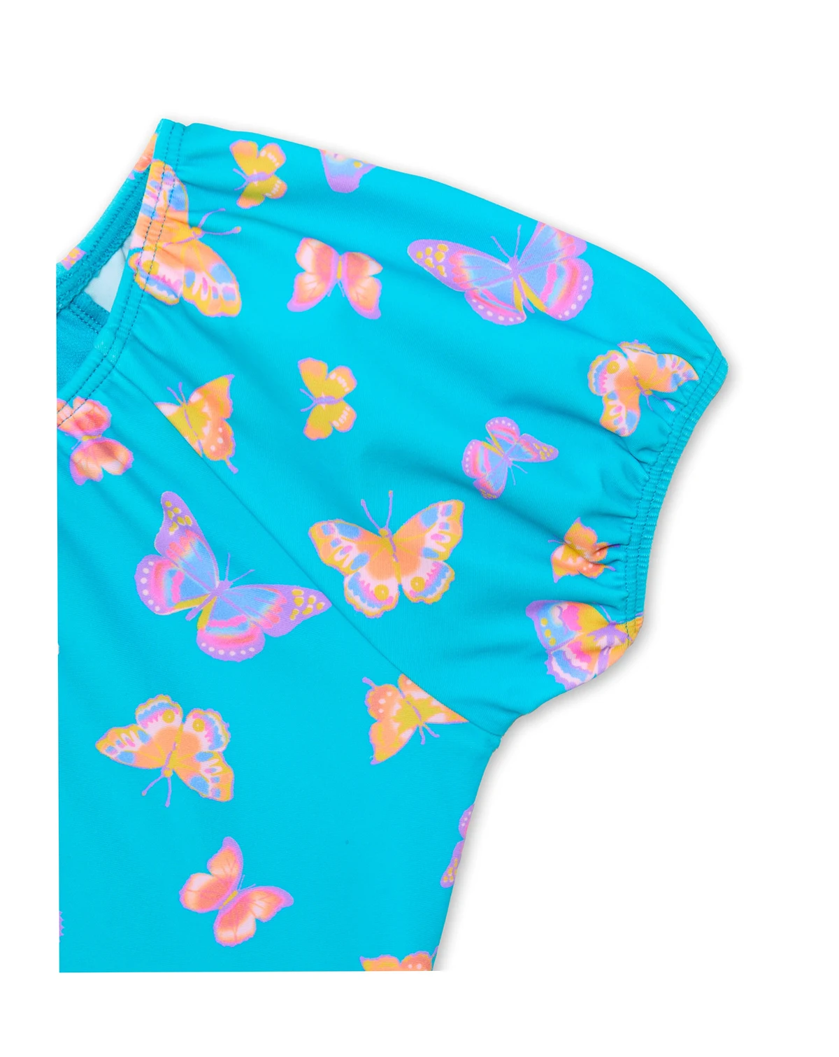 Protect with style in this puff-sleeve rashguard set from Angel Beach, featuring a colorful butterfly all-over print on the top. The set includes a solid hipster bottom, with both pieces fully lined.
