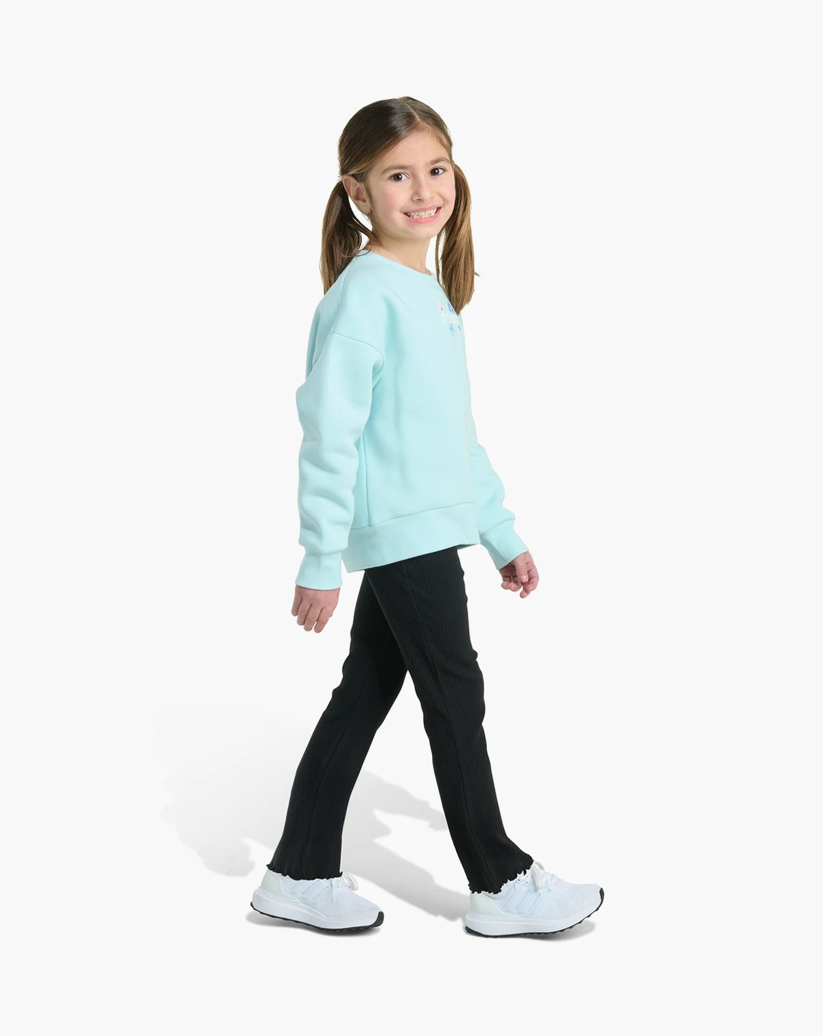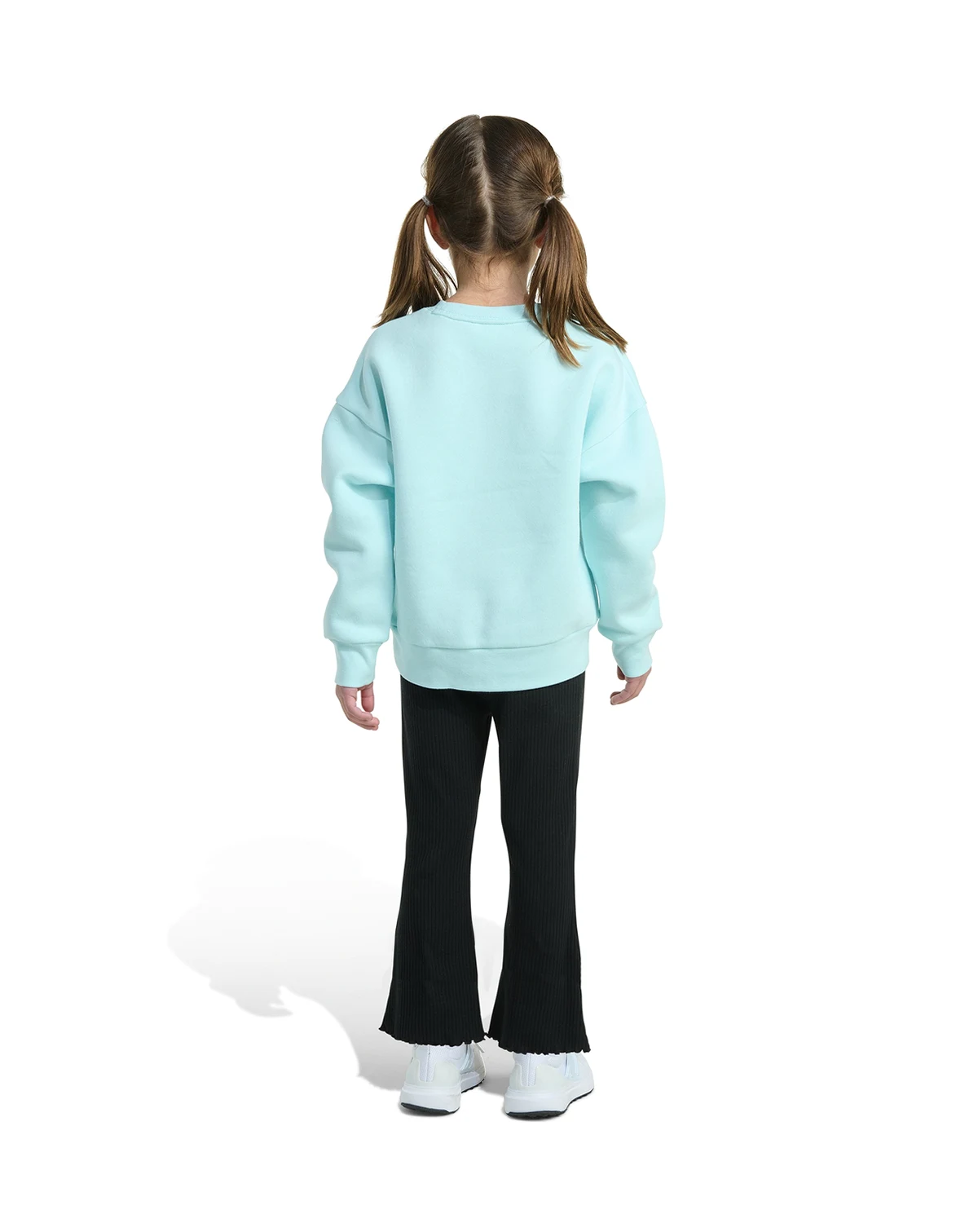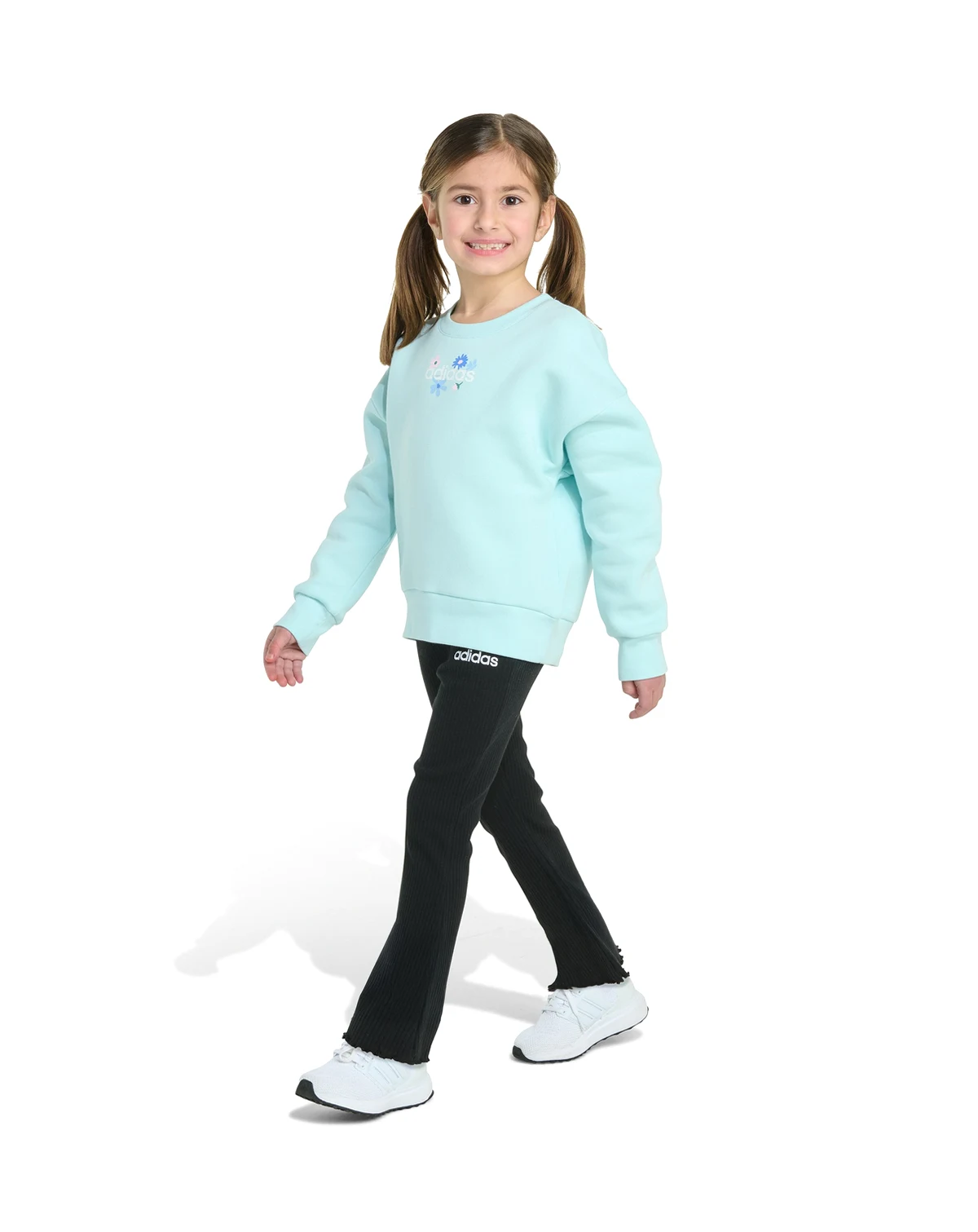 Florals, flared legs, and signature adidas details make this set a stylish blend of comfort and charm. The fleece sweatshirt offers extra warmth and coziness, designed with a ribbed crewneck, cuffs, and a snug, secure fit. The flare-leg pants are crafted from soft fabric and feature an elastic waistband for all-day use, finished with delicate lettuce-edge hems for a feminine touch.
