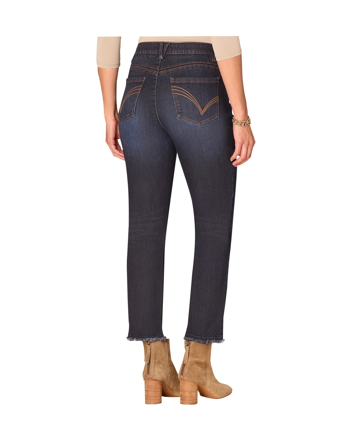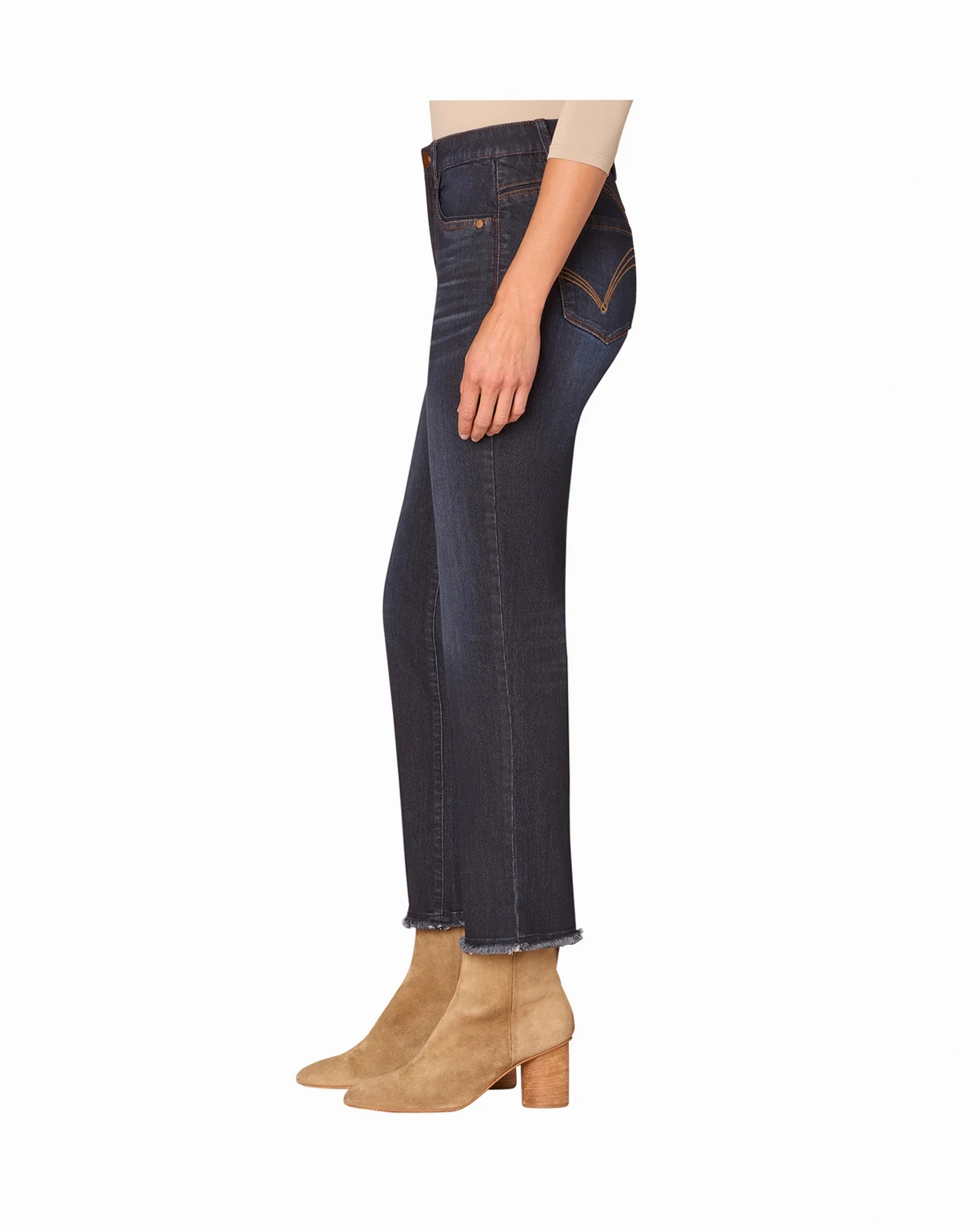 A slim straight leg and cascading detail define these Democracy high-rise 'Ab' Solution jeans, finished with a clean fray hem. Two front and back pockets, zip fly with button closure, and an elastic waistband with mesh panels provide a secure fit and targeted shaping.