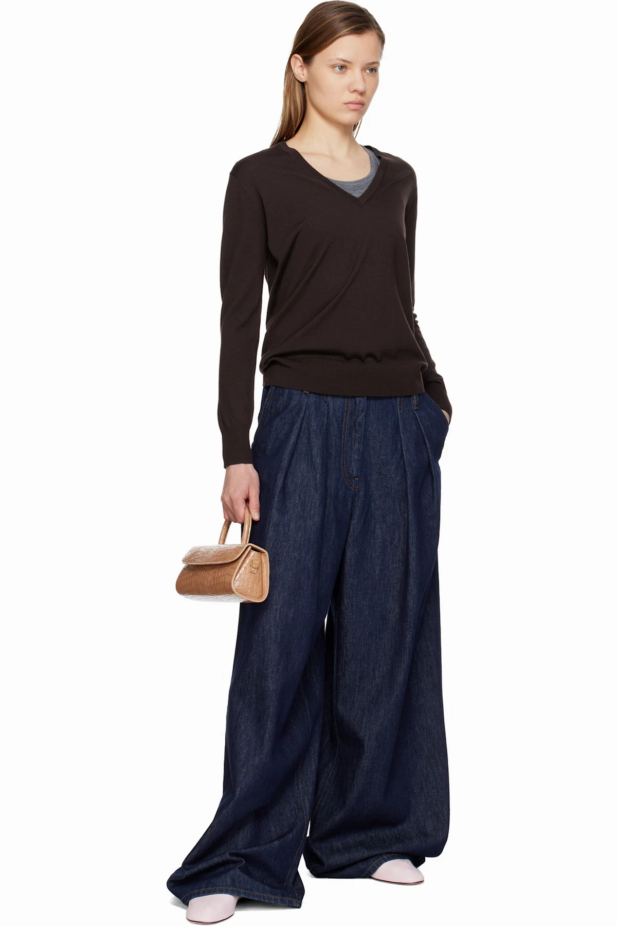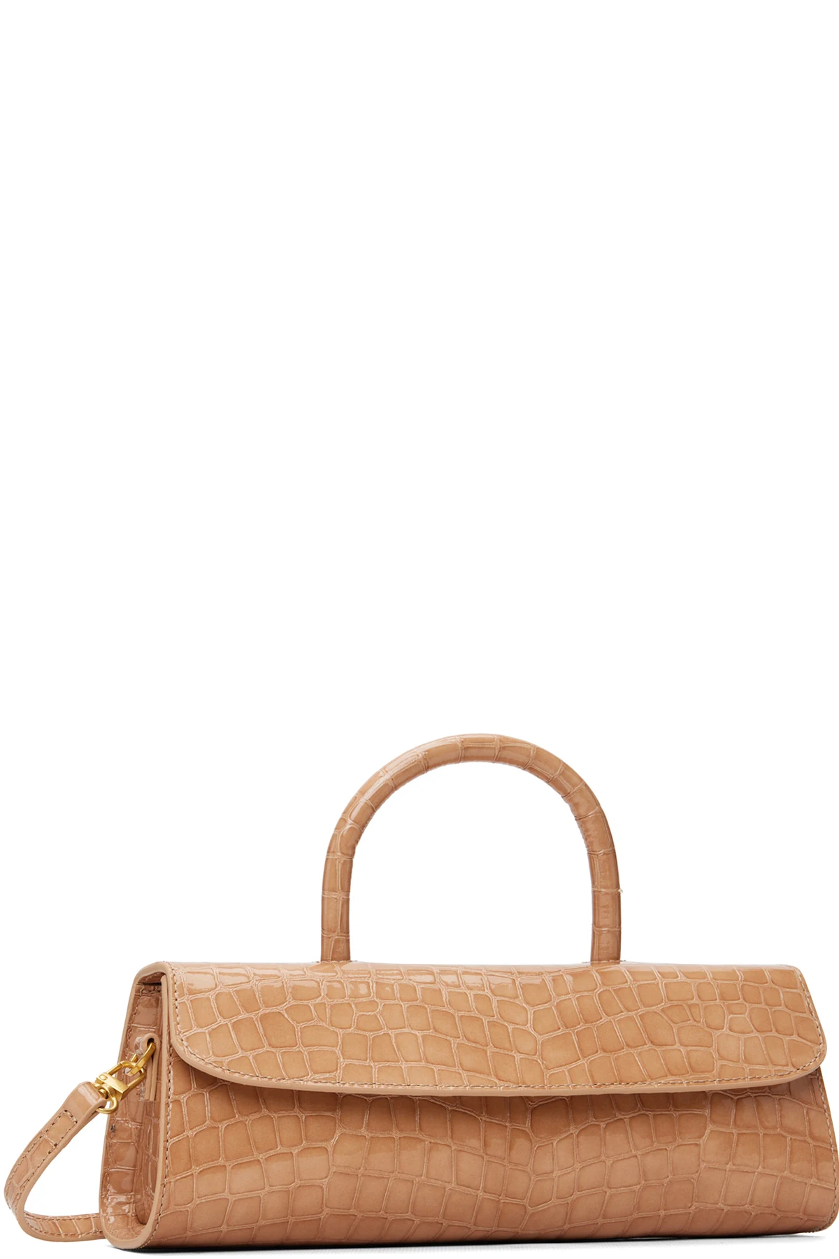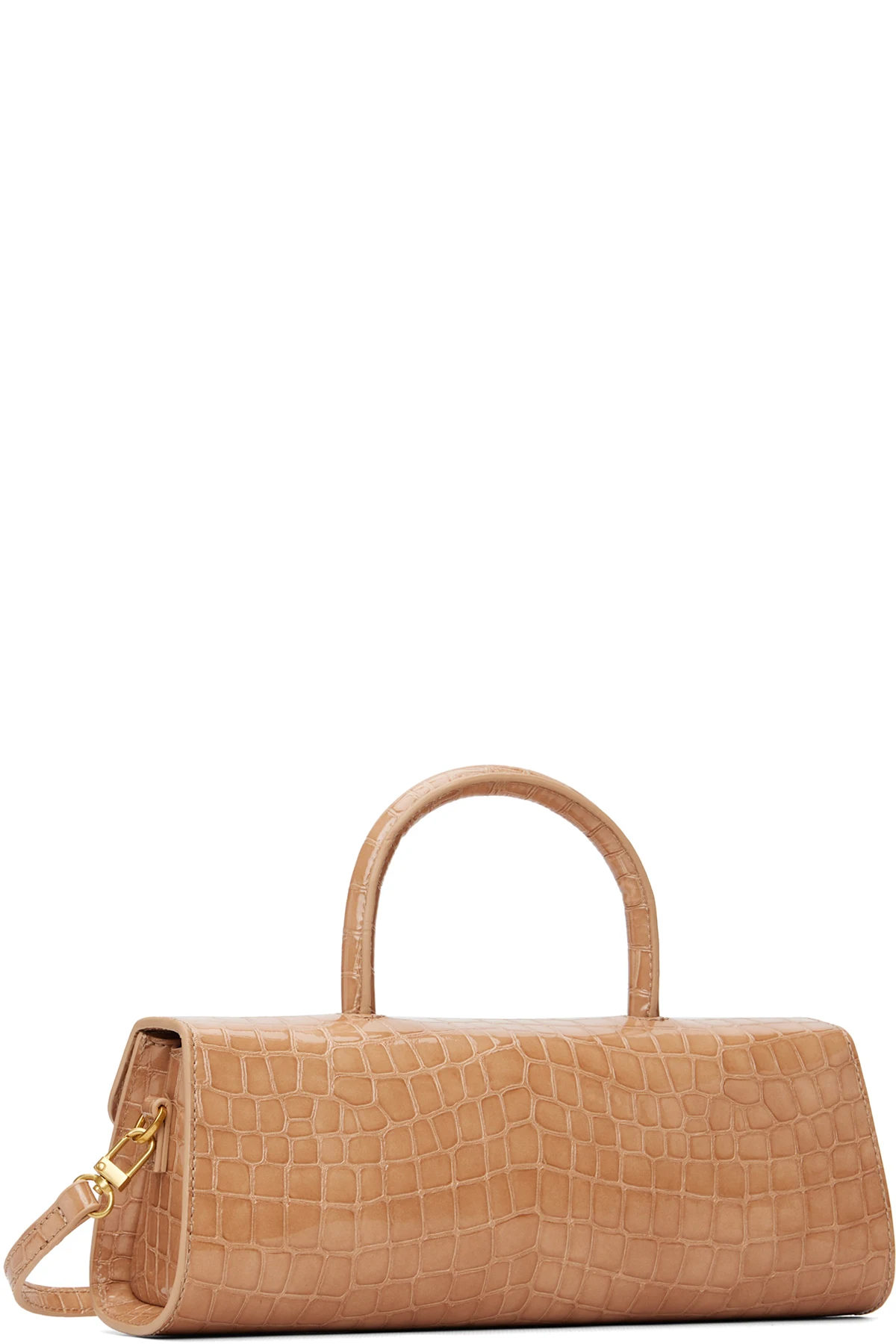 Croc-embossed patent leather top handle bag.