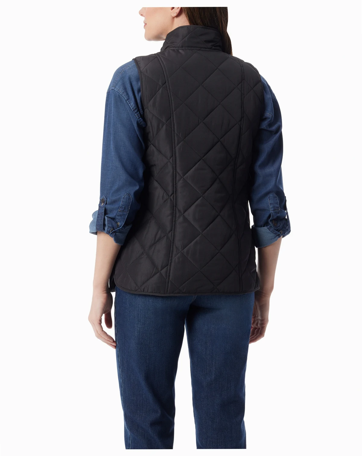 Add a touch of timeless charm to your wardrobe with this Gloria Vanderbilt jacket, featuring elegant diamond quilting and a sleek sleeveless cut. It offers cozy style without the bulk, while two front flap pockets provide practicality and a hint of vintage flair.
