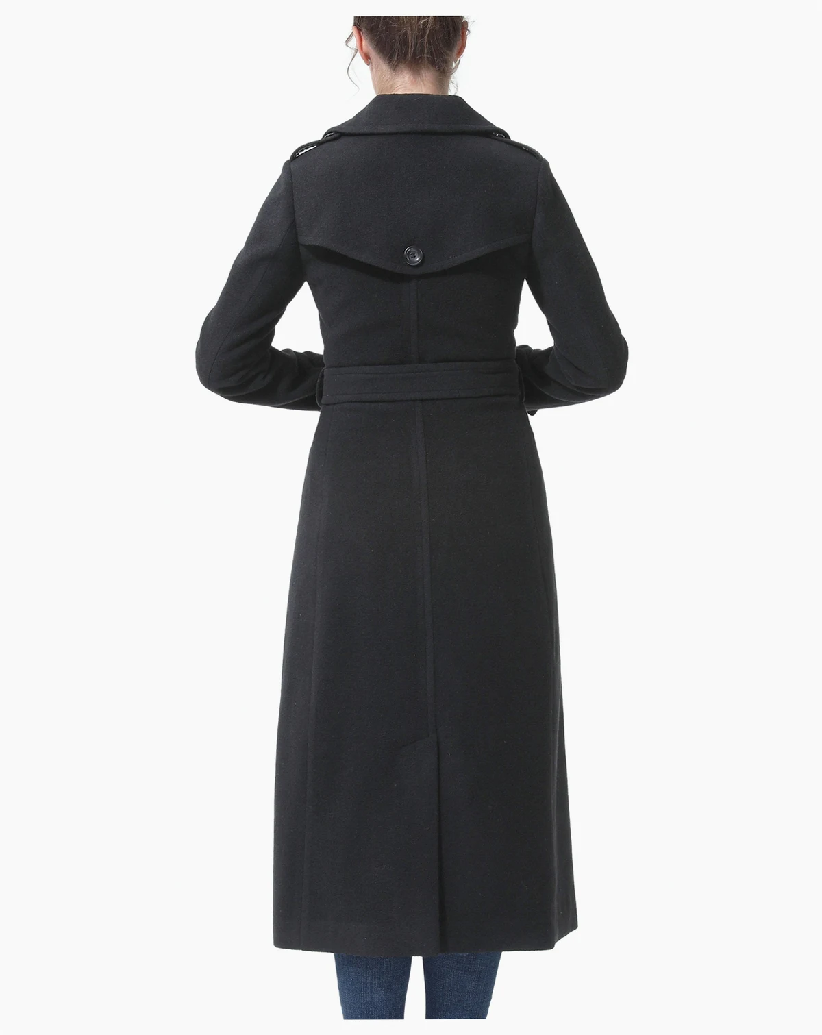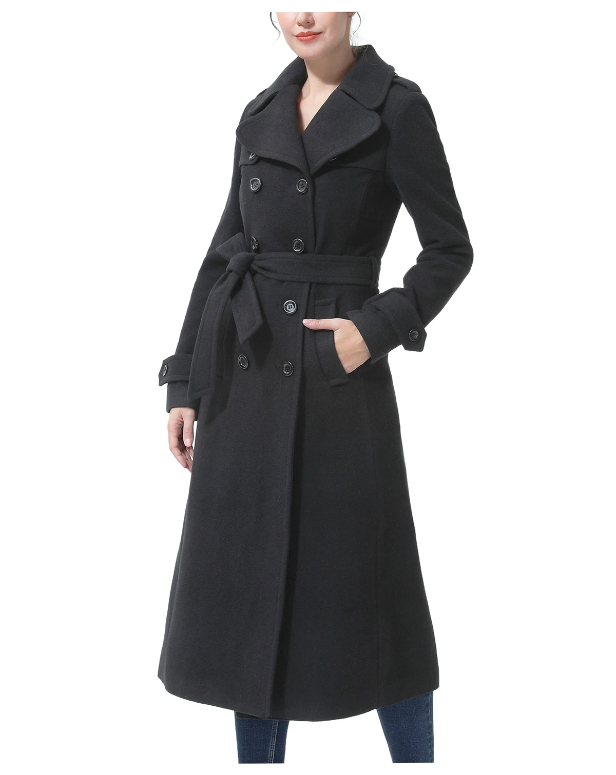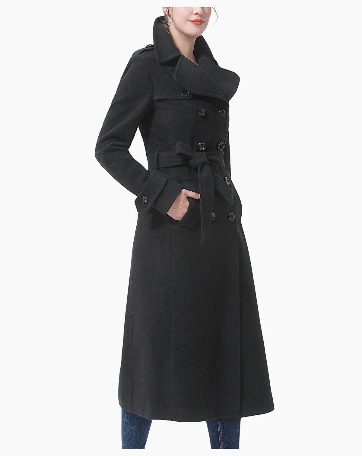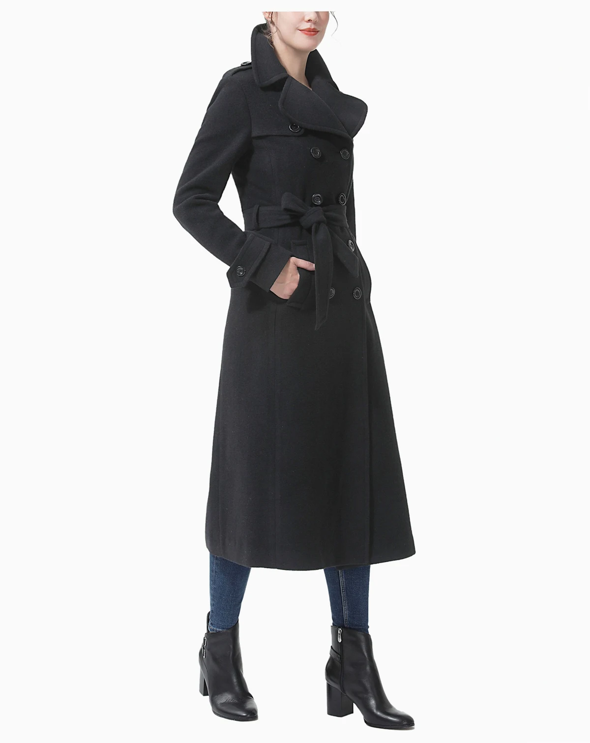This double-breasted trench coat reimagines a classic design with modern touches, including large rounded lapels, shoulder epaulets, and a left gun flap detail. A removable belt enhances the silhouette, offering a sleek and contoured fit.