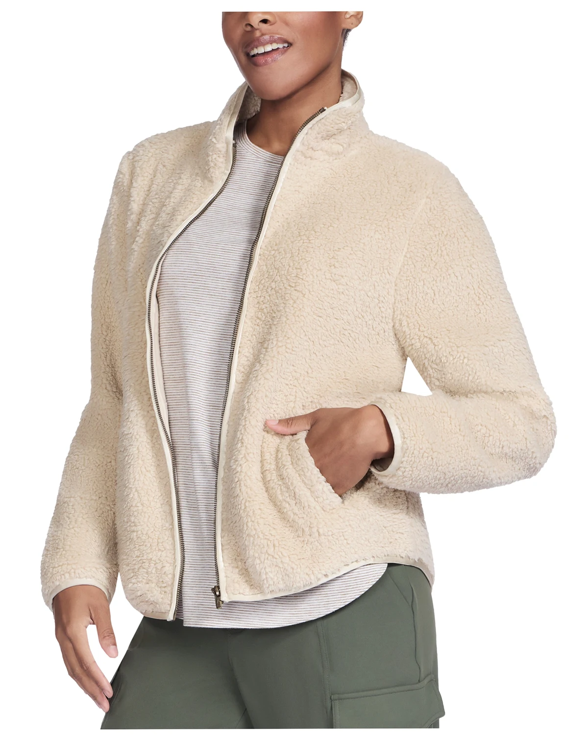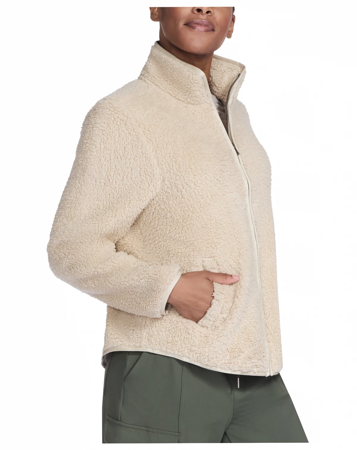 Snuggle into plush perfection with this Skechers jacket, an oversized fleece layer featuring a full-zip mock neck and welt hand pockets. The elastic trim on the sleeve cuffs offer a comfy, secure fit.