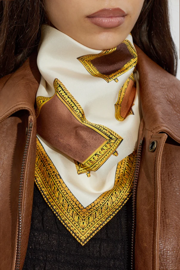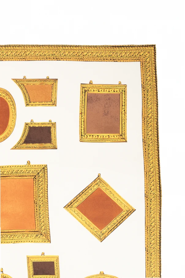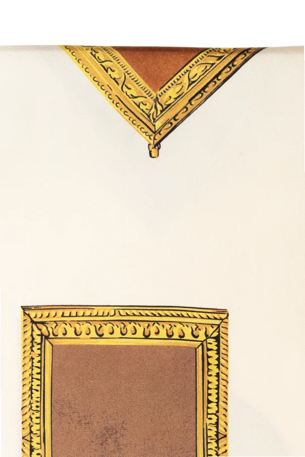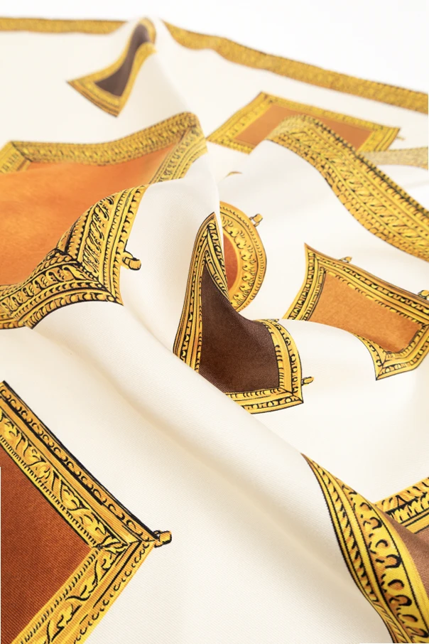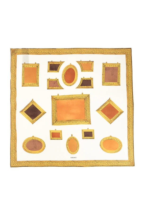 Discover timeless elegance with this exquisite silk scarf from Versace’s exclusive collection. Meticulously crafted from luxurious silk, the scarf boasts a refined, square silhouette synonymous with high-end accessories. The lavish print is distinguished by a sophisticated array of picture frames—rectangular, rhombus, and oval—artfully rendered across the fabric in a harmonious multicolor palette dominated by opulent gold, lustrous brown, radiant copper, and warm beige, all set against a sublime backdrop of off-white or ivory.