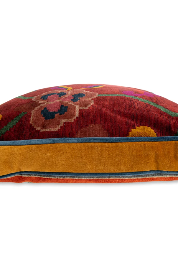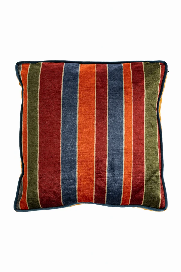Elevate your living space with the exquisite Floral and Striped Accent Pillow by Etro Home . Featuring a timeless square silhouette, this pillow is a testament to sophisticated design and impeccable craftsmanship. On one side, vibrant florals in shades of red, pink, yellow, blue, and green intertwine in a dynamic, eclectic pattern; the reverse reveals bold vertical stripes in navy, olive, brick, and orange tones, offering a striking contrast that captures an artful spirit.