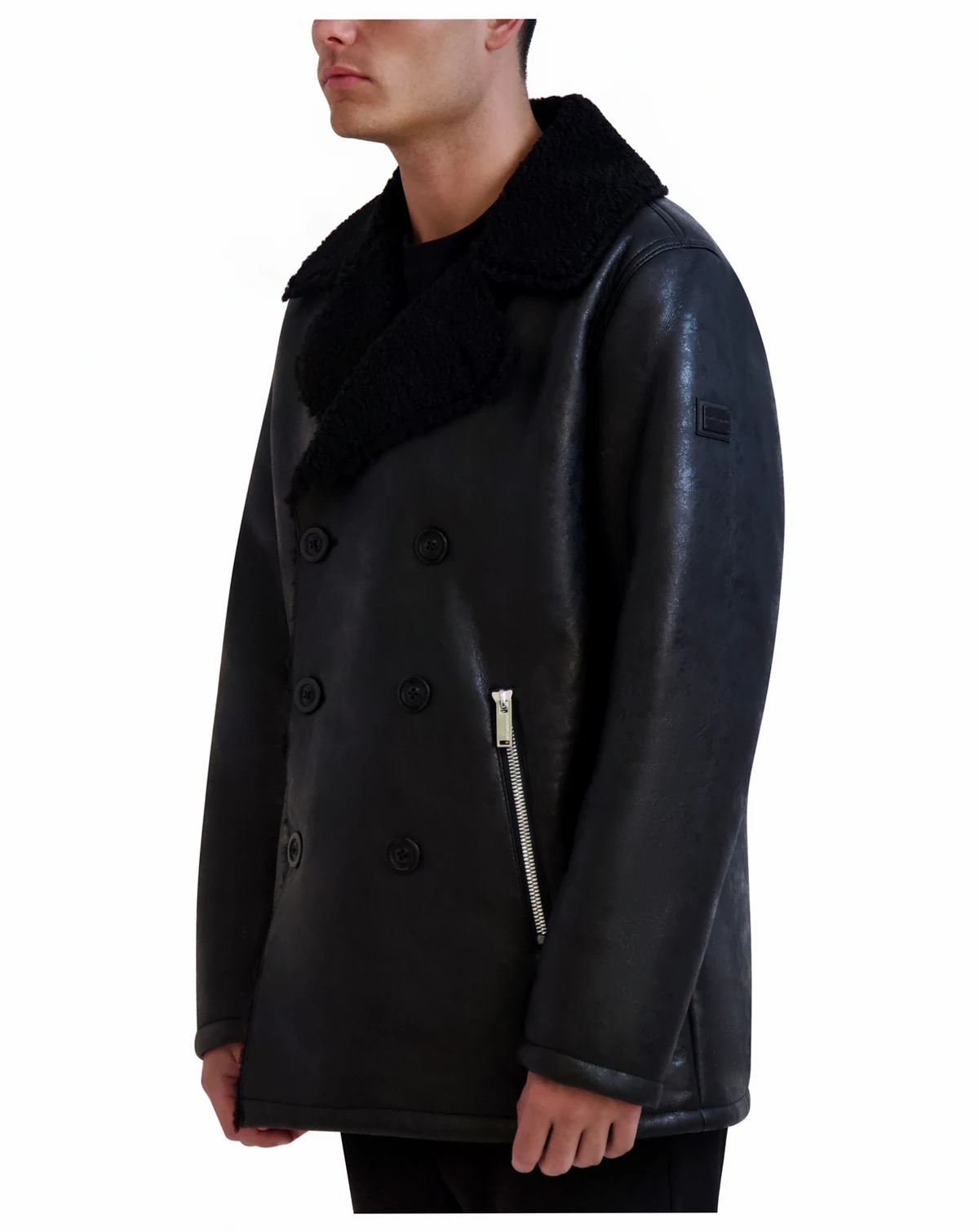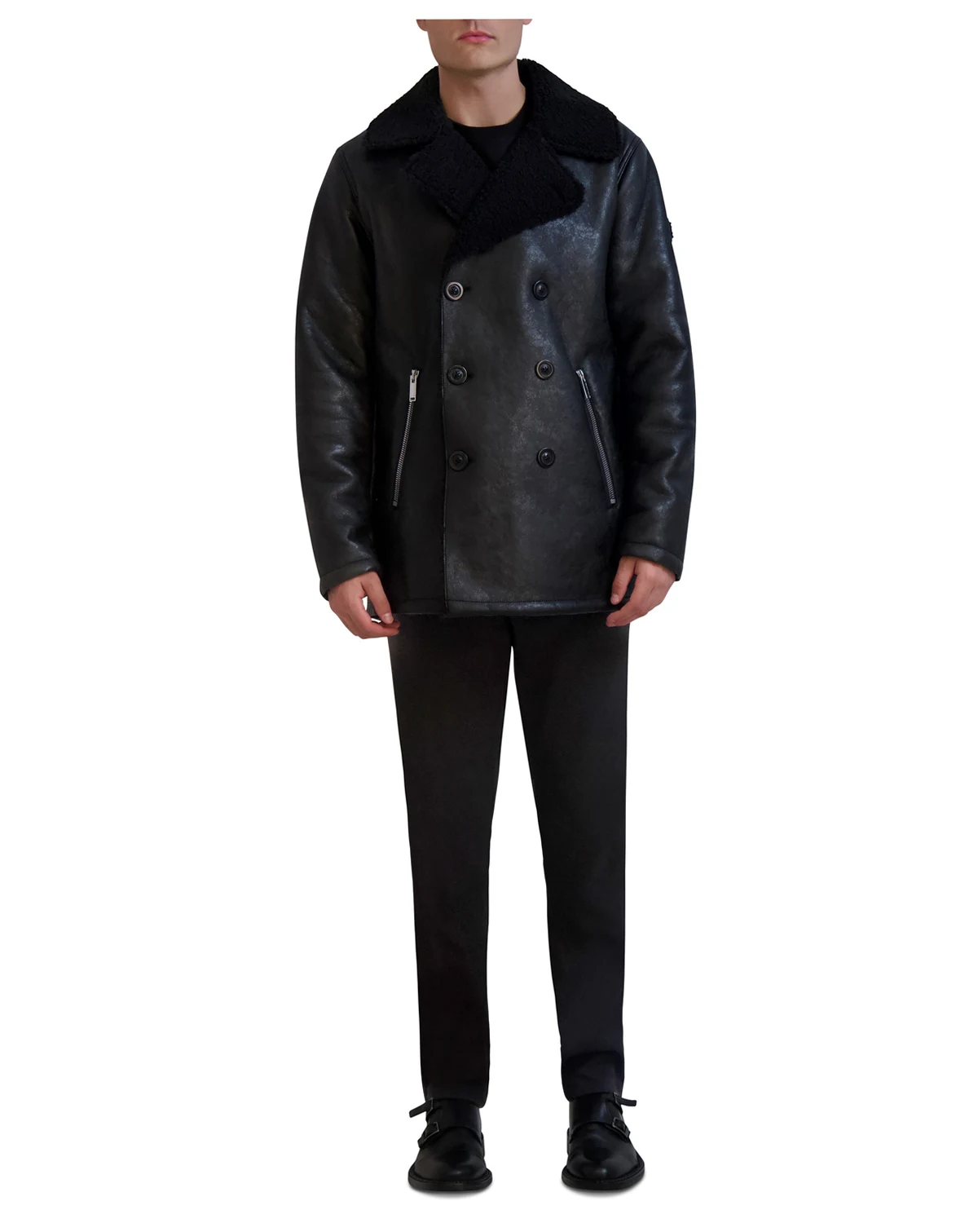 A faux-shearling lapel makes a chic and bold statement on this double-breasted coat from Karl Lagerfeld.