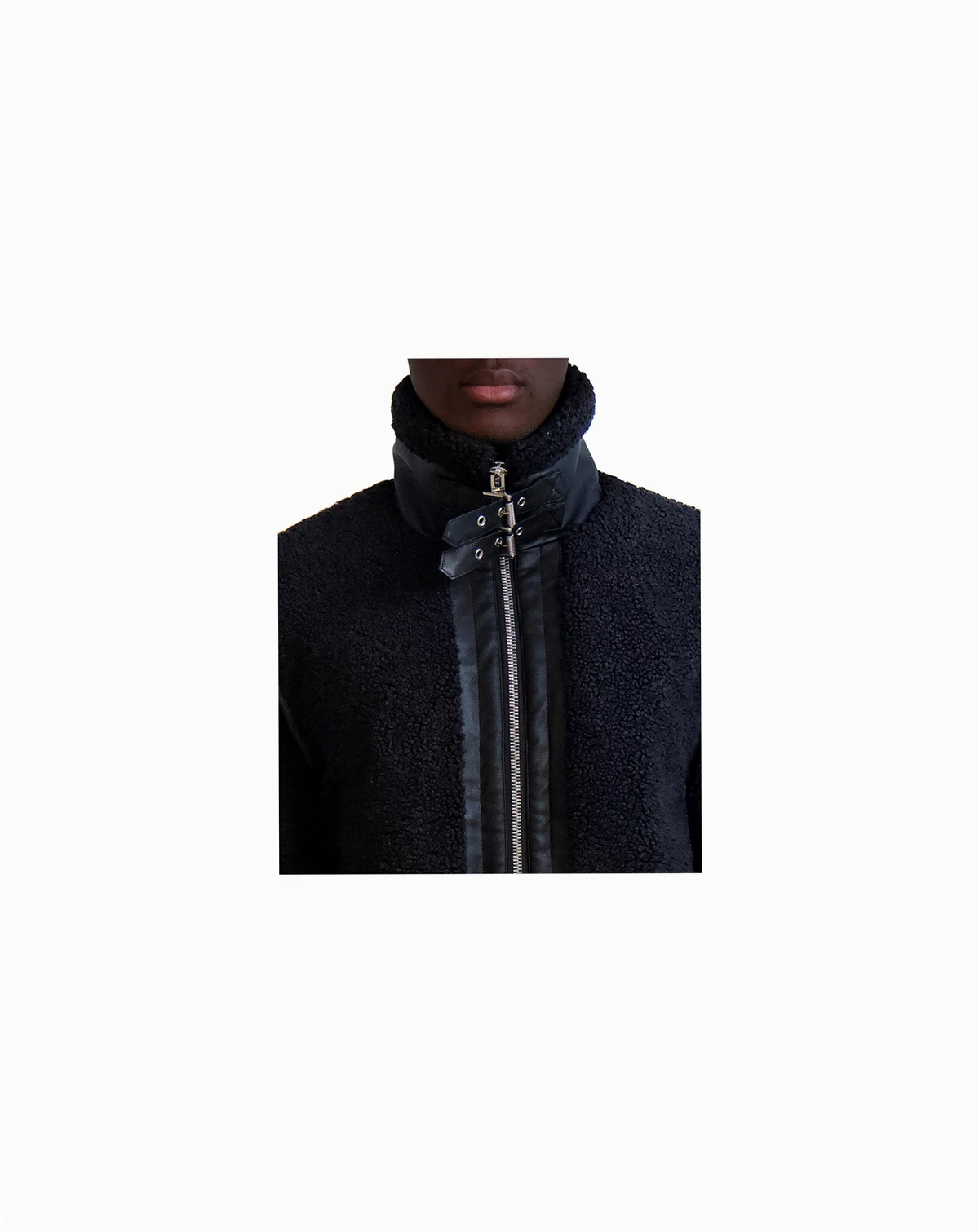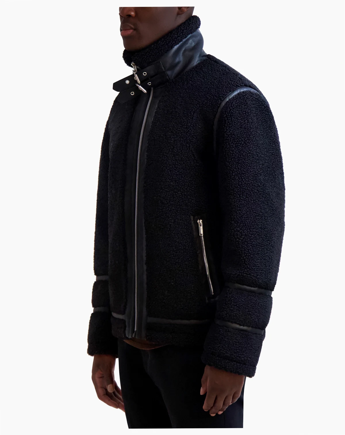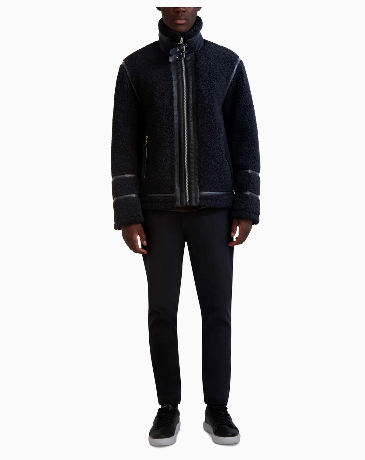 Soft in fluffy fleece, this Karl Lagerfeld jacket gets a fresh edge from a buckle at the collar and sleek faux-leather trim.