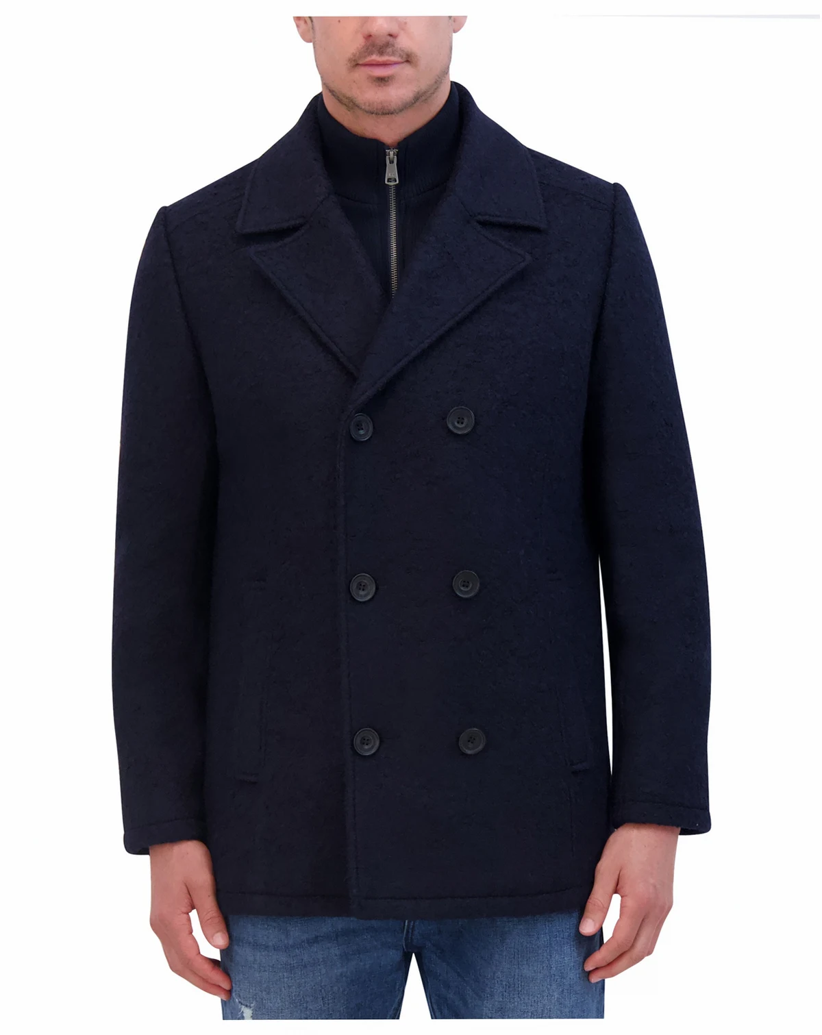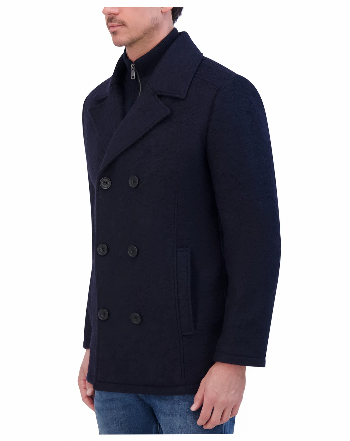 A set-in bib provides an additional layer of comfort on this classic-meets modern double-breasted wool-blend peacoat from Kenneth Cole.