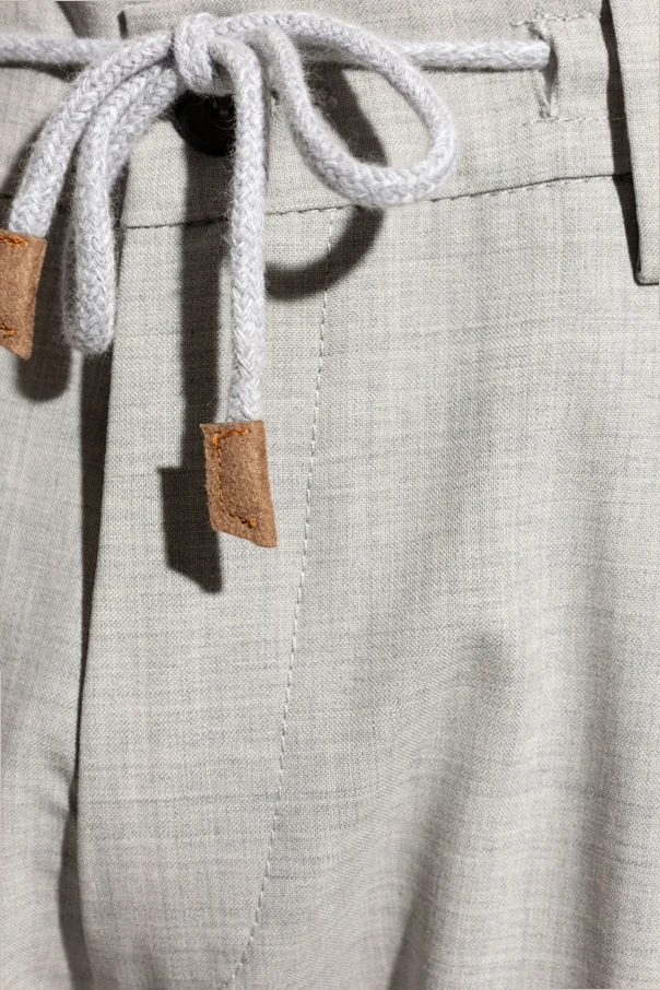The tapered legs offer a contemporary silhouette, making them an ideal choice for formal settings. A delicate drawstring, adorned with leather accents, graces the waistband, imbuing these pants with a modern touch, while the traditional button closure ensures a secure fit.