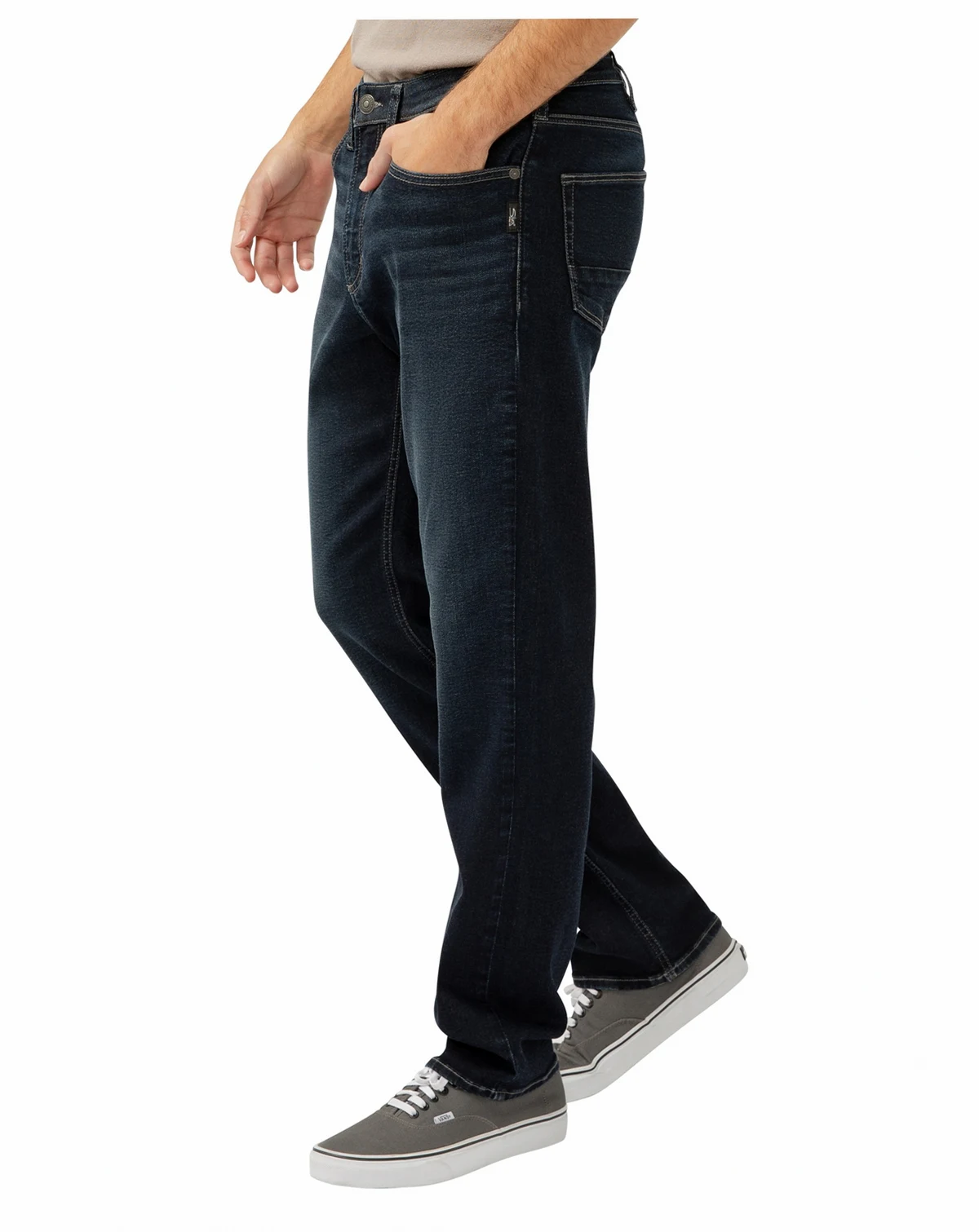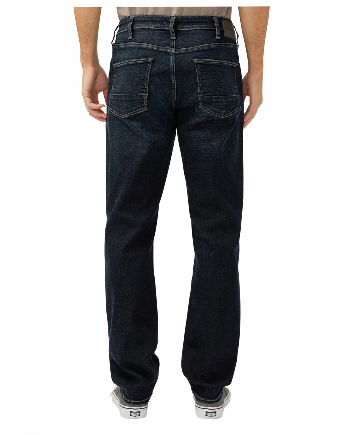 Machine washable; Desk to Dinner straight leg jeans with a dark indigo wash and a clean finish.