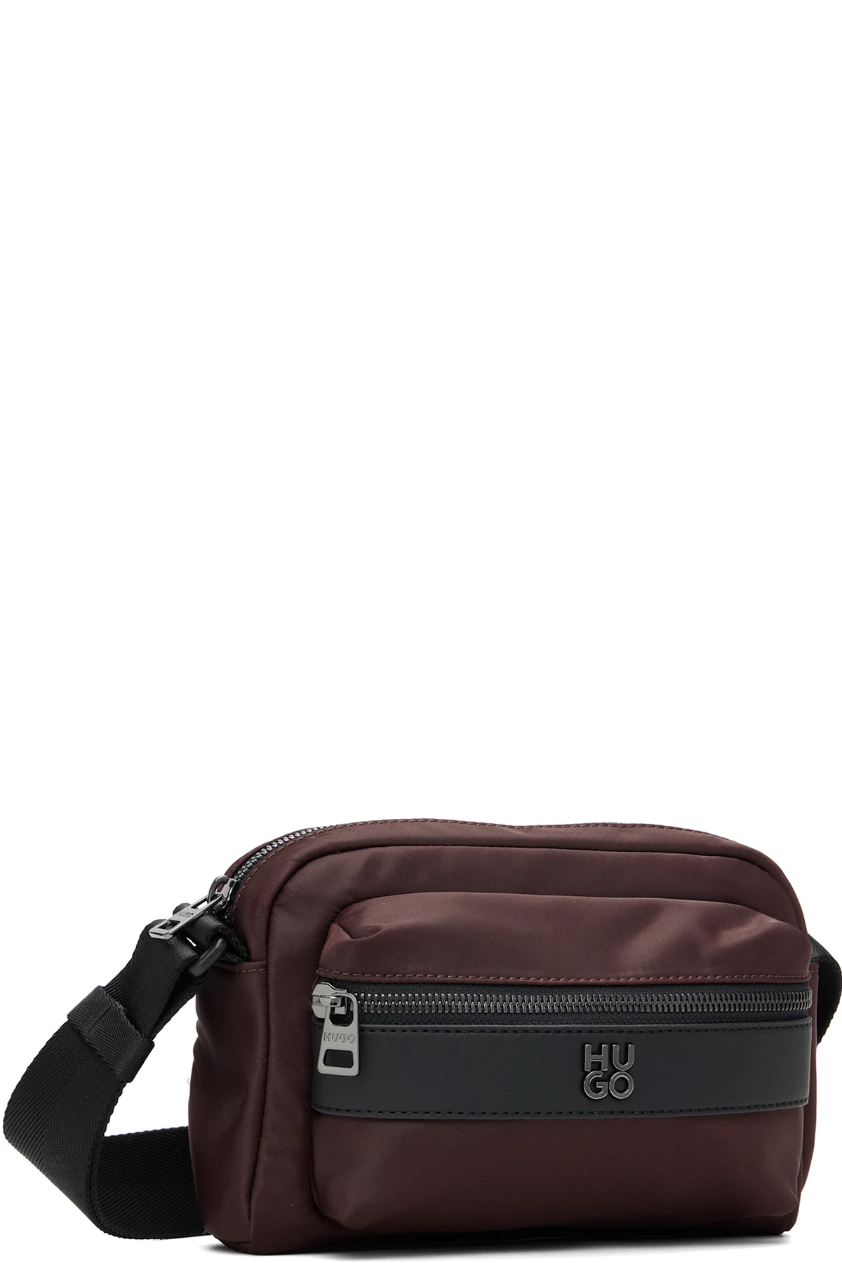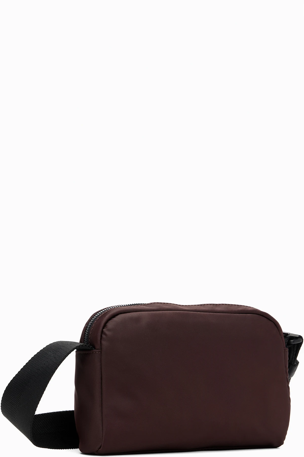· Zip pocket, logo hardware, and buffed faux-leather trim at face