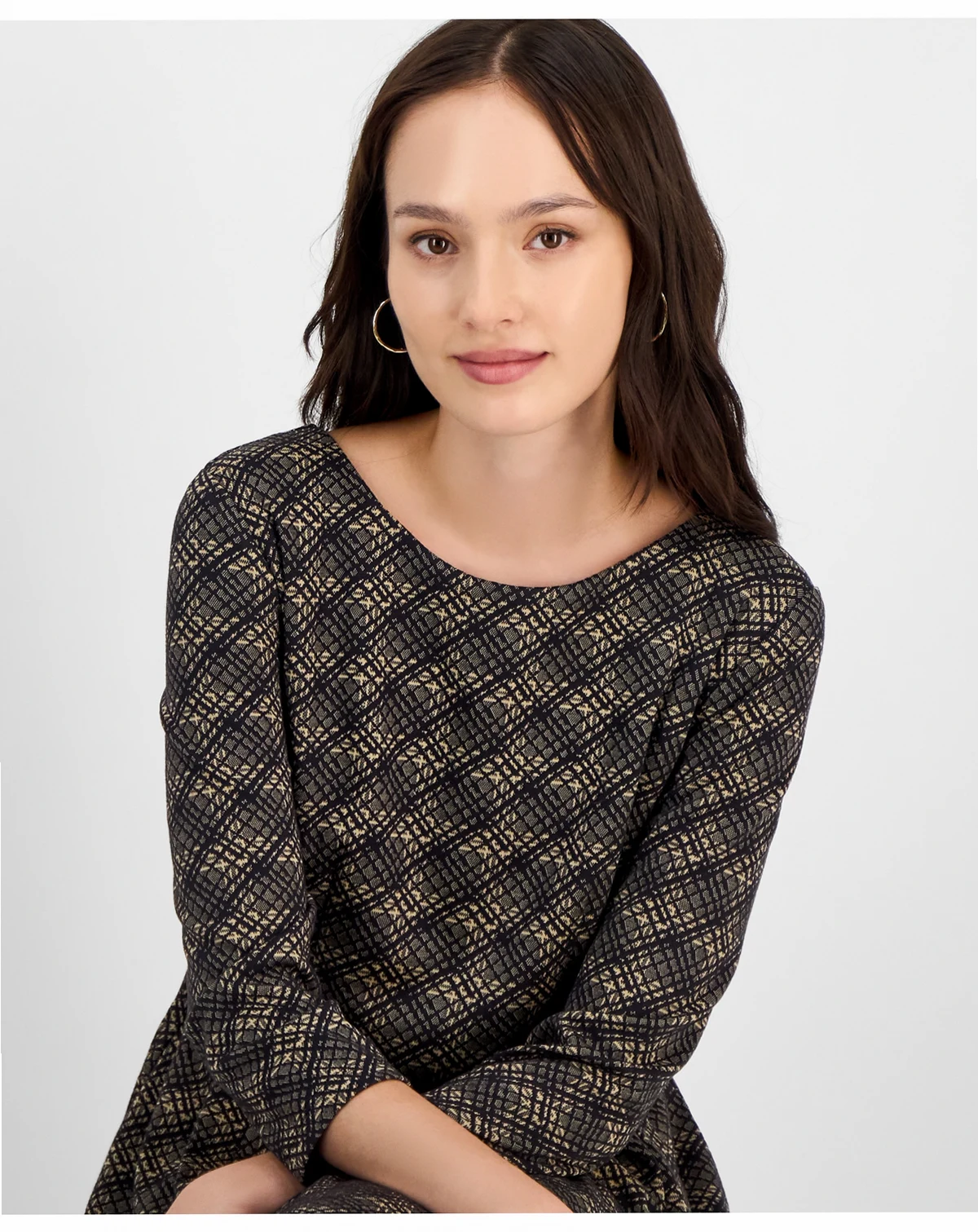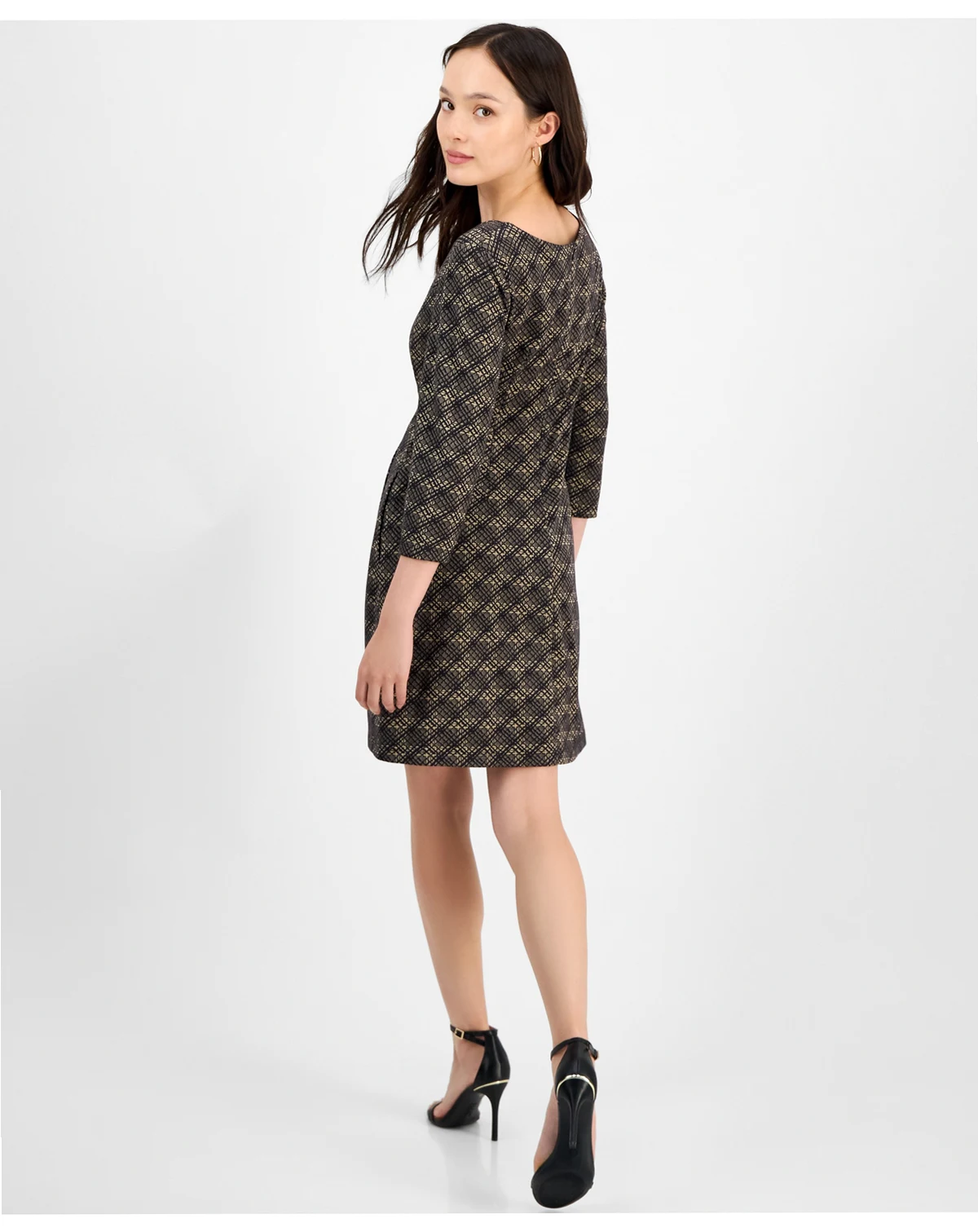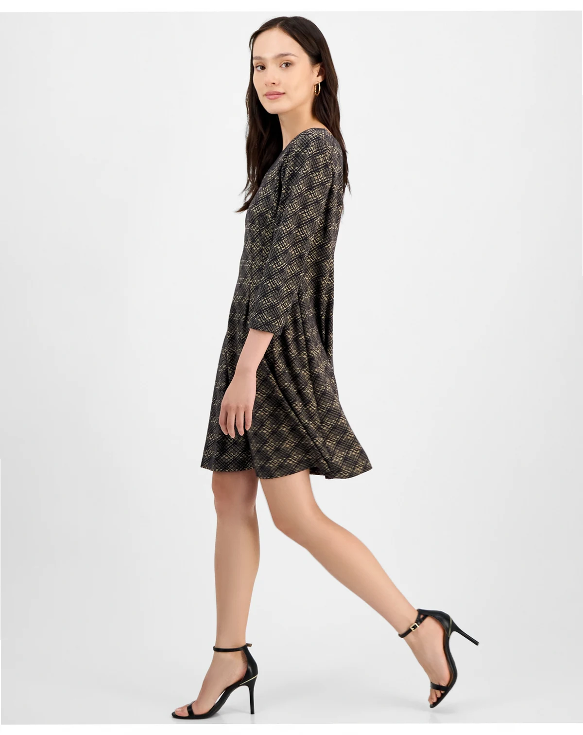 A polished print lends a timeless feel to this fit & flare look by Connected, designed for the petite frame, a tucked style at the waist adds a form finessing finish.