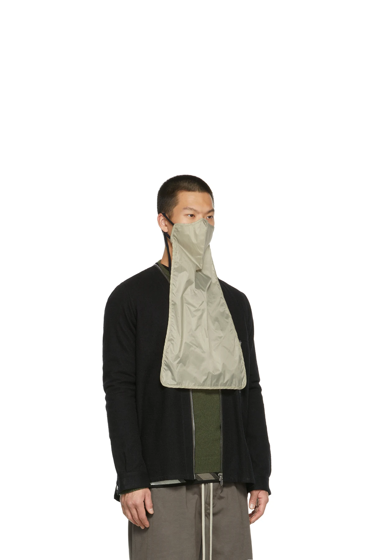 Nylon satin mask in grey. Cotton twill lining in white. Self-tie fastening at back. Approx. 8" length x 9" height.