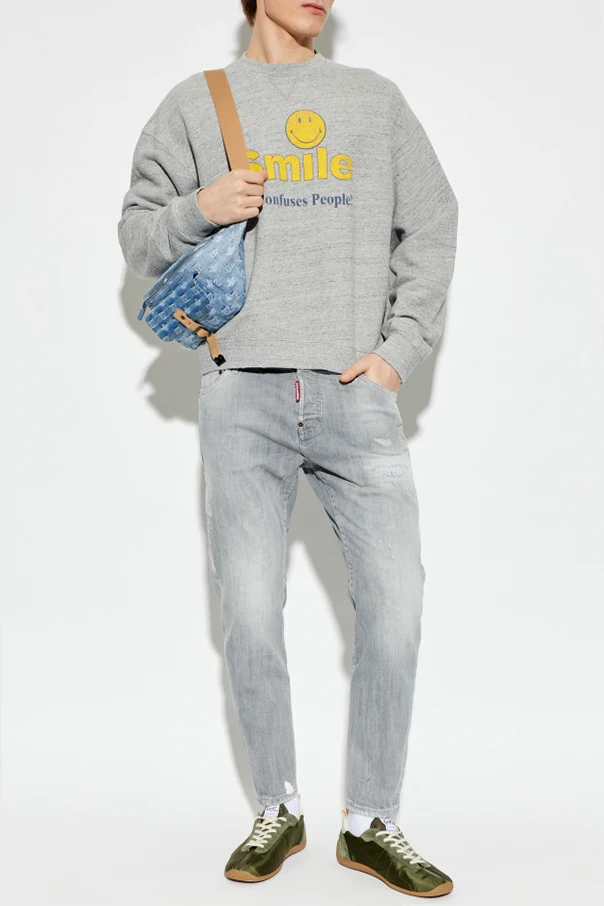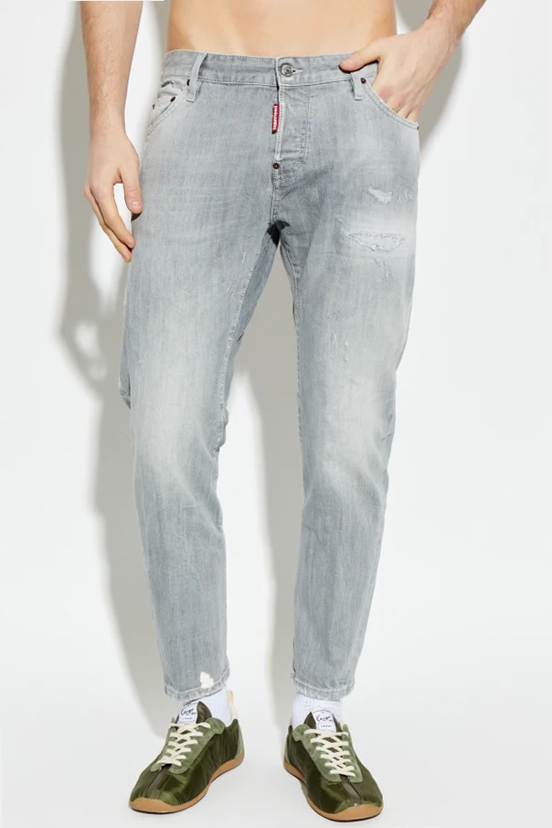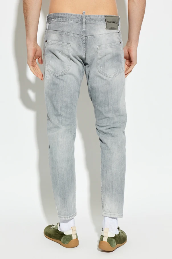 The light gray wash is artfully distressed, with tasteful fading and gentle abrasions near the pockets and hem, lending a modern, distinguished character. Distinctive touches include a visible red designer tag adorned with the DSQUARED2 logo at the fly and a classic branded leather patch at the back, underscoring the garment's heritage and exclusivity.