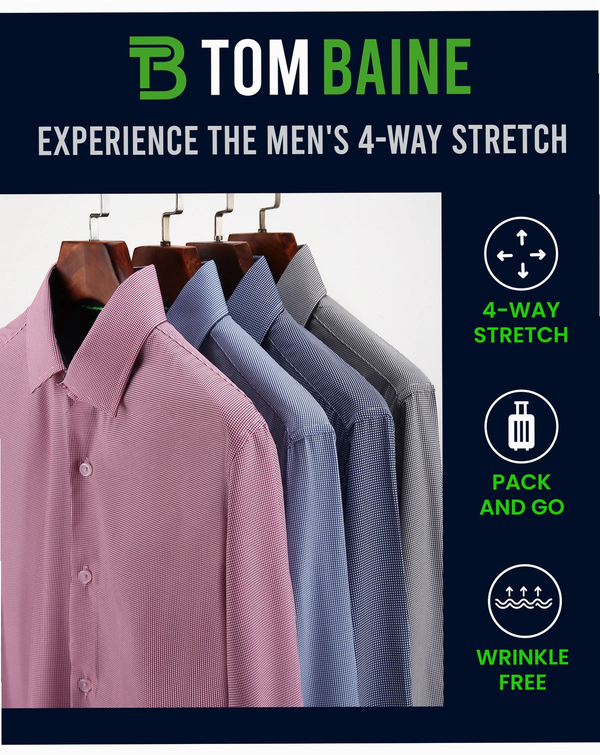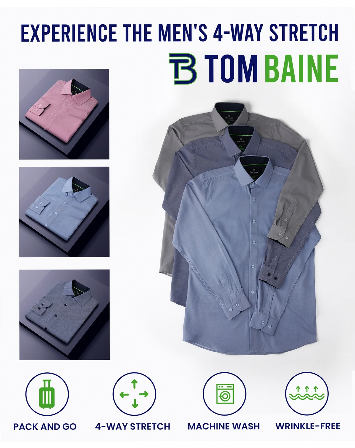 Tom Baine has made a performance fabric from yarn which is soft to the touch, light weight and provides ultimate comfort. This performance easy care fabric is wrinkle free, quick drying and machine washable.
