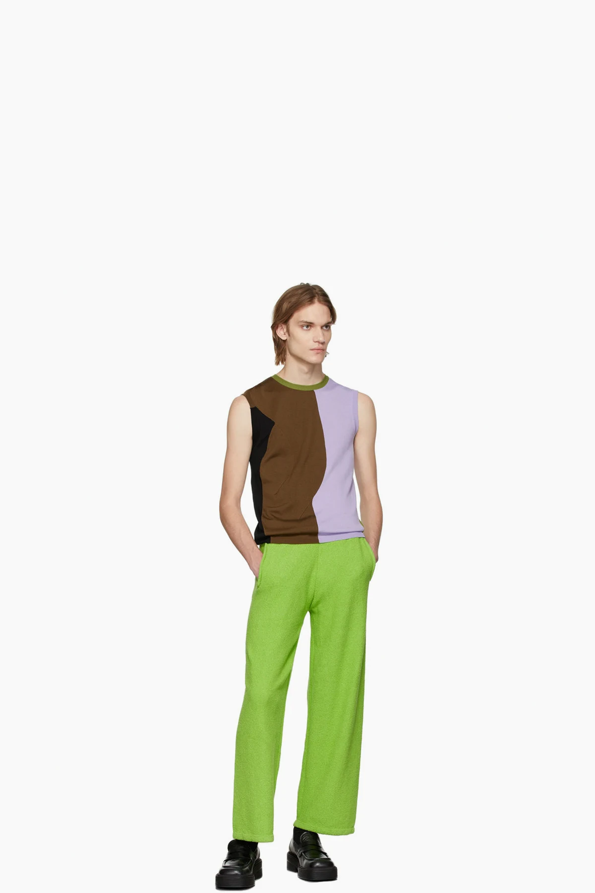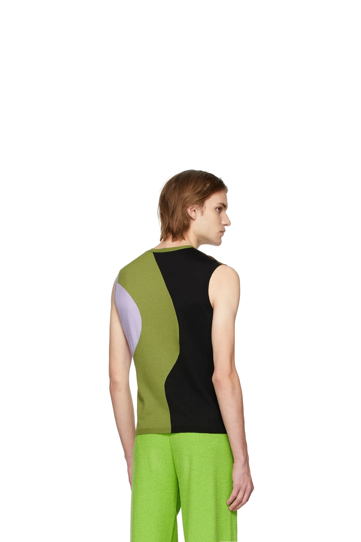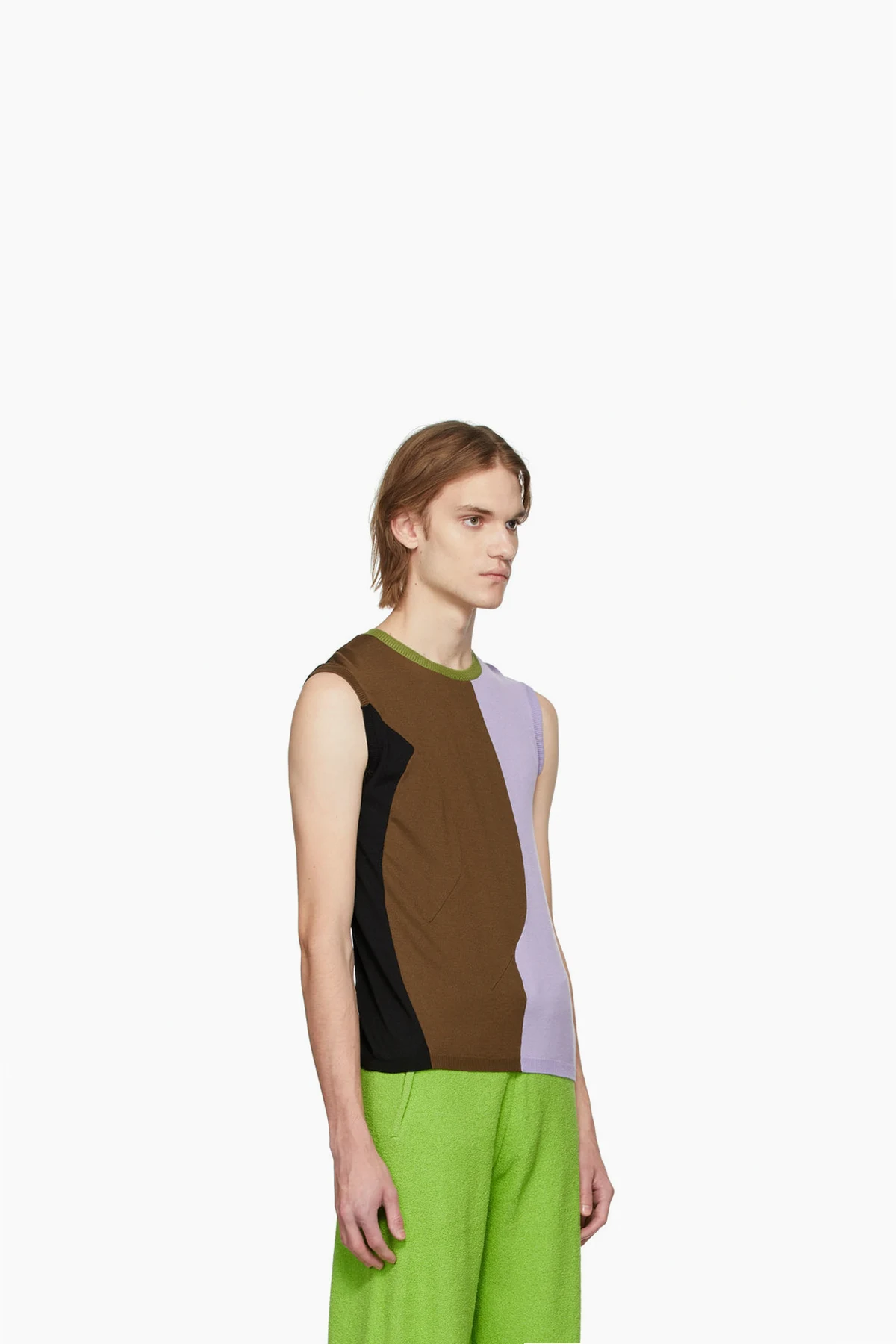 Sleeveless knit wool tank top colorblocked in multicolor. Rib knit crewneck collar, armscyes, and hem.