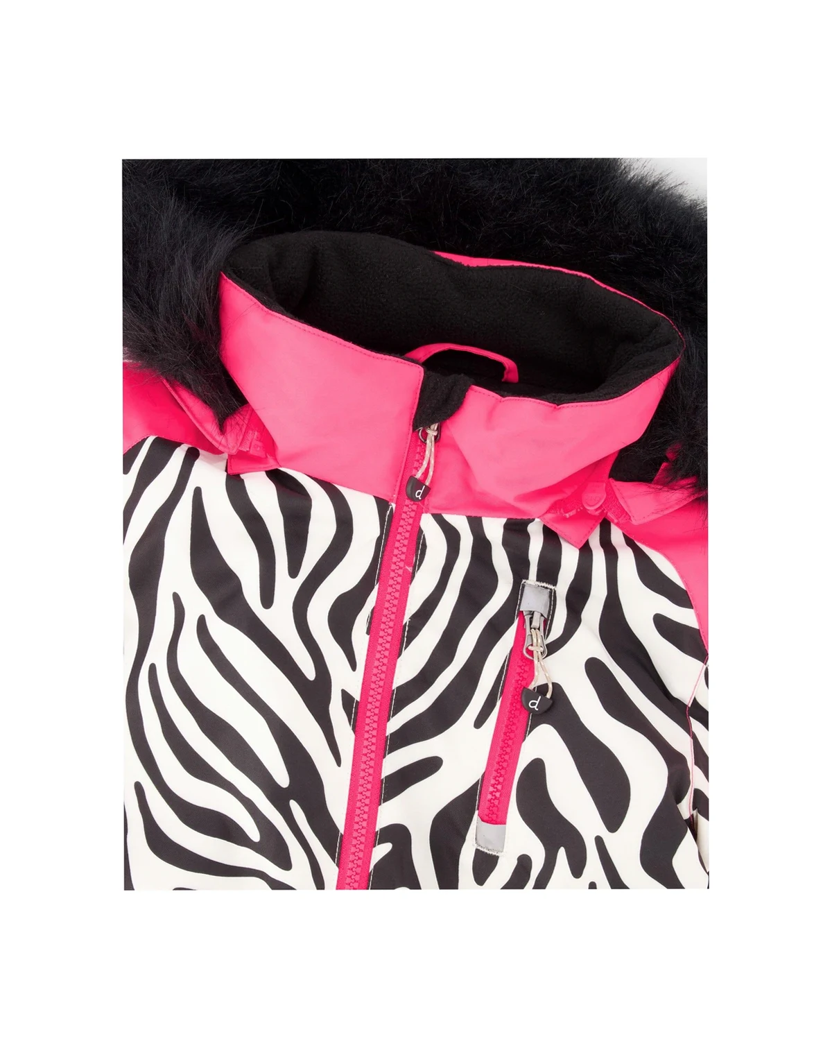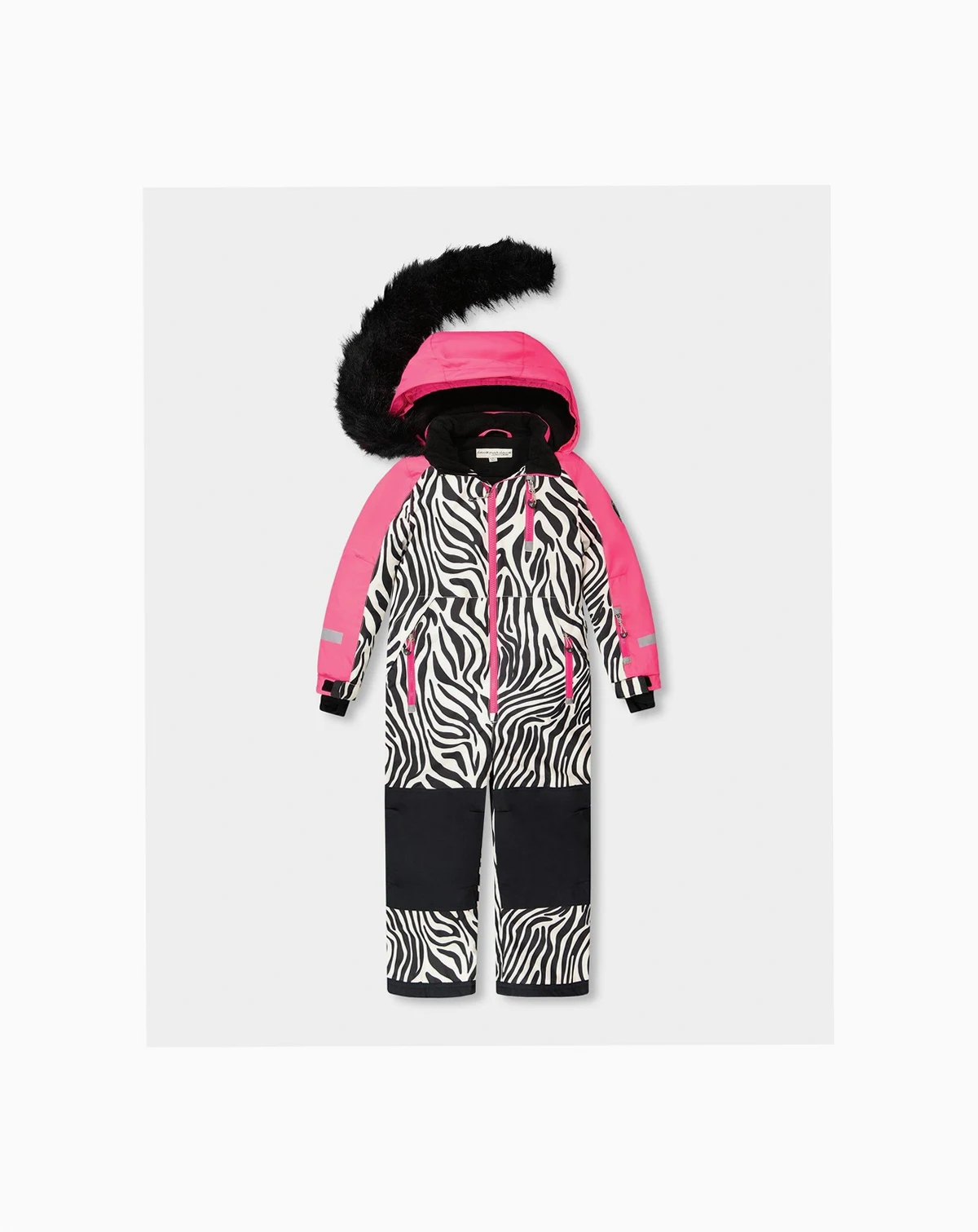 Every moment on the mountain is warmer and drier with our one-piece PLAY ski suit in zebra print. Designed for maximum comfort and improved performance, this snowsuit features articulated knees and sleeves, adjustable hems and sleeves to accommodate growing kids, a detachable hood, and Cordura-reinforced panels for long-lasting durability. Elastic cuffs, snow guards, a wind flap, and a chin guard keep the elements out, while a waterproof coating and dirt-repellent finish keep little skiers and snowboarders clean and dry.