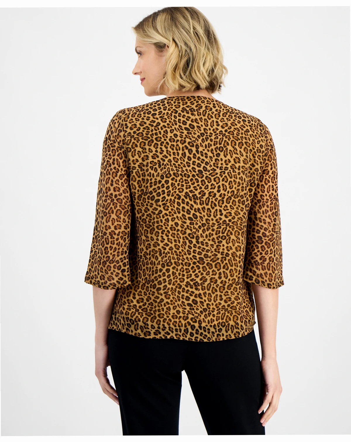 An intriguing update for your favorite separates, this JM Collection top elevates a cheetah print with sparkling trim. Sheer, flutter sleeves lend elegant flow.