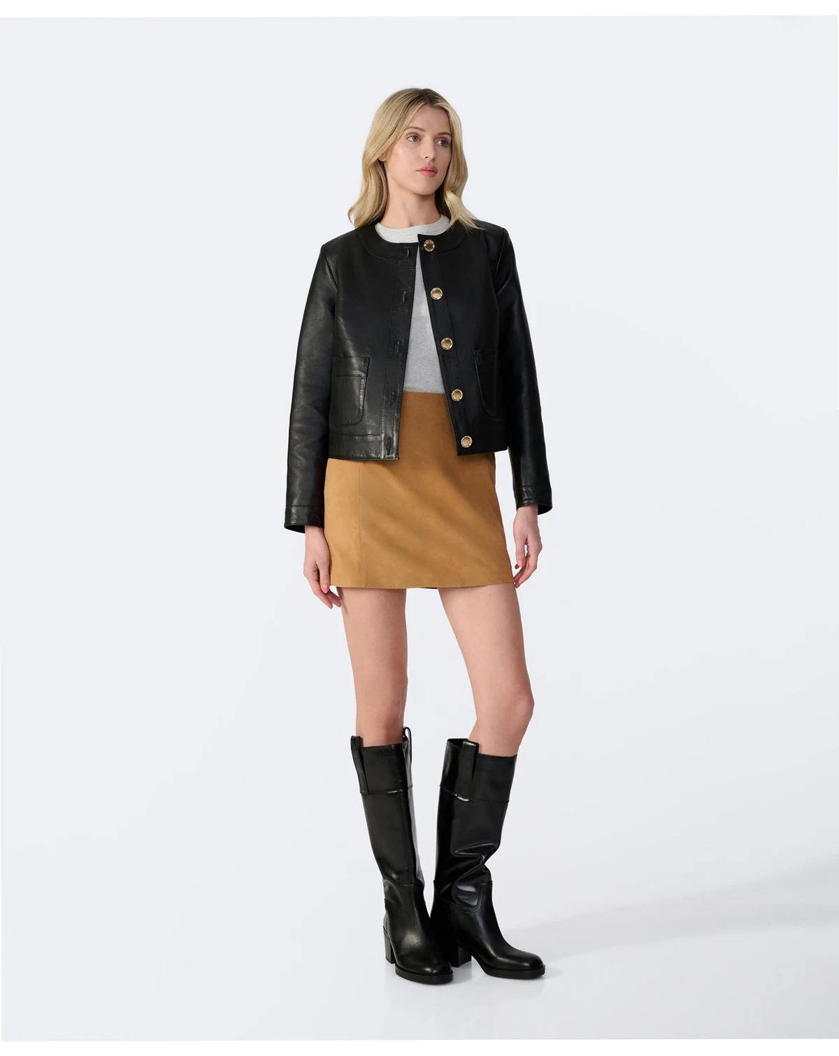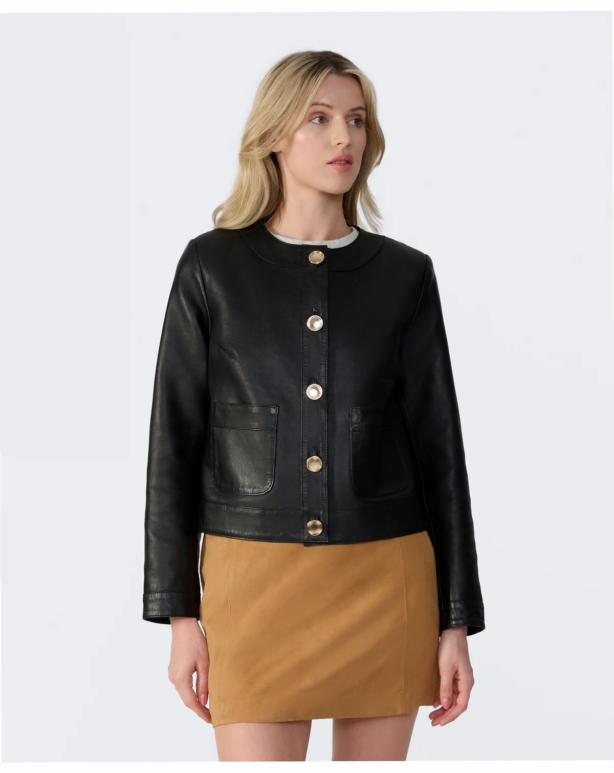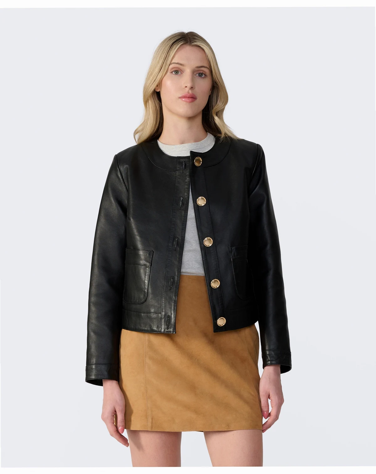 Crafted from genuine premium British leather, this jacket offers a lightweight layer with a breezy silhouette and a flattering, collarless neckline. The classic black brings a breath of fresh air to any outfit, ideal for brunch dates, gallery strolls, or springtime soirees.