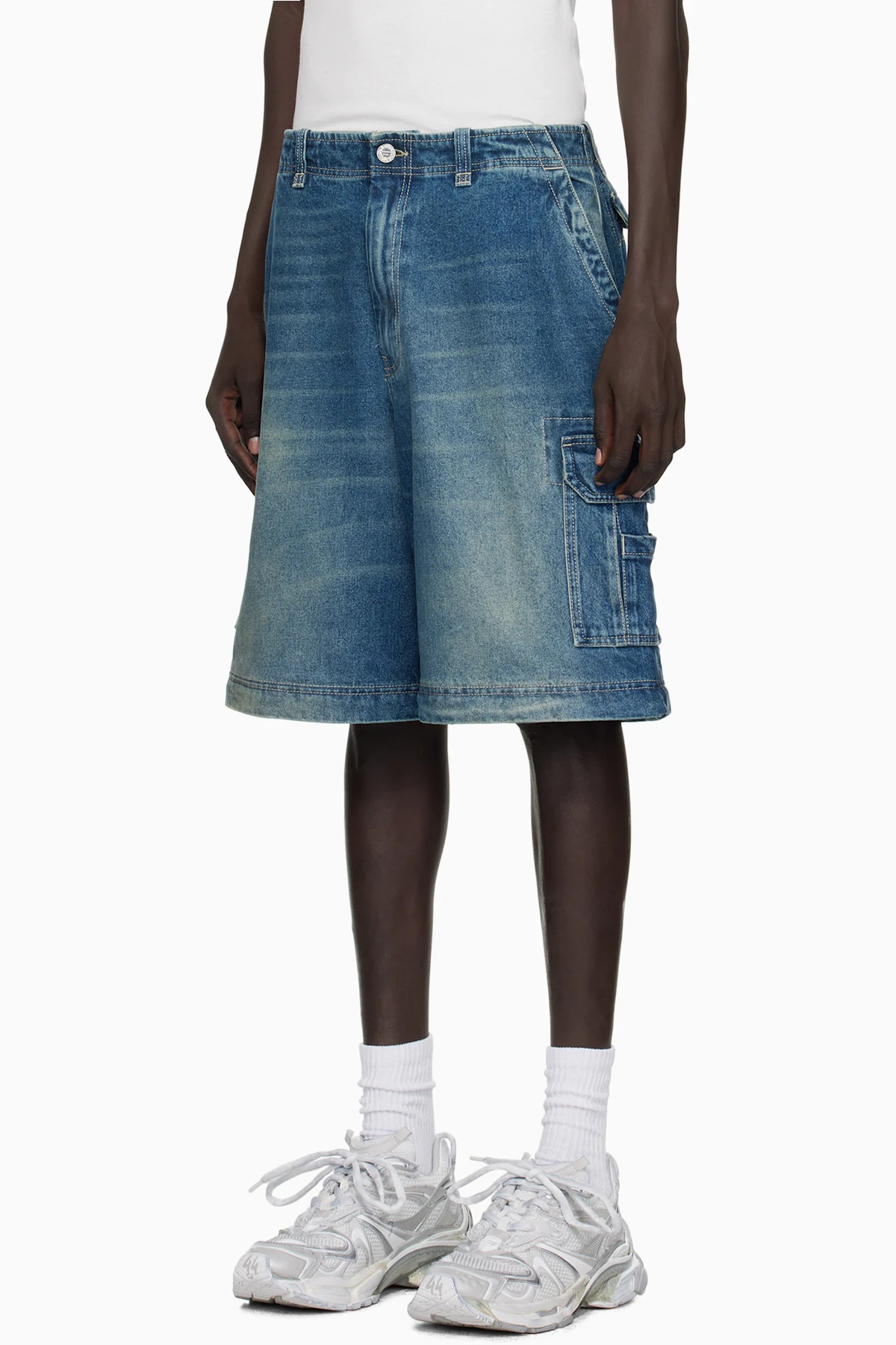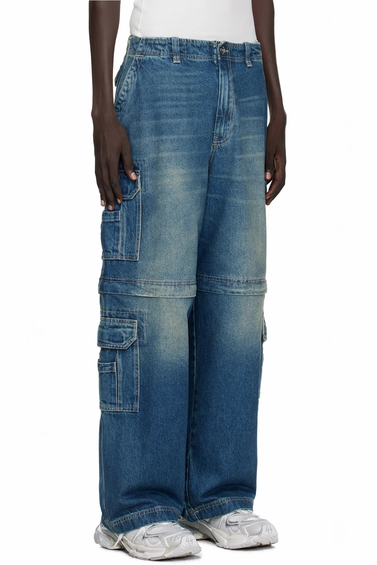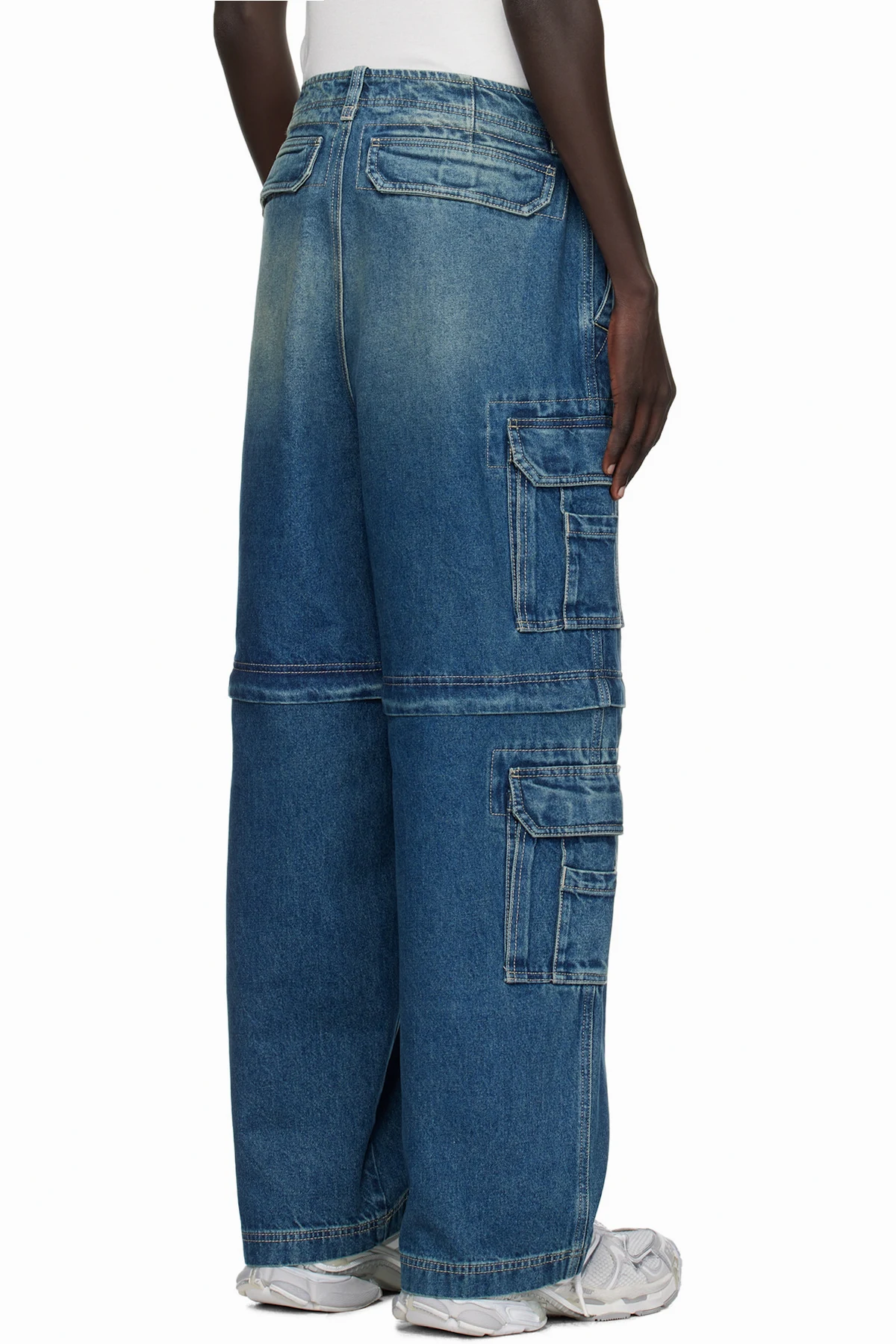 Non-stretch denim cargo pants.