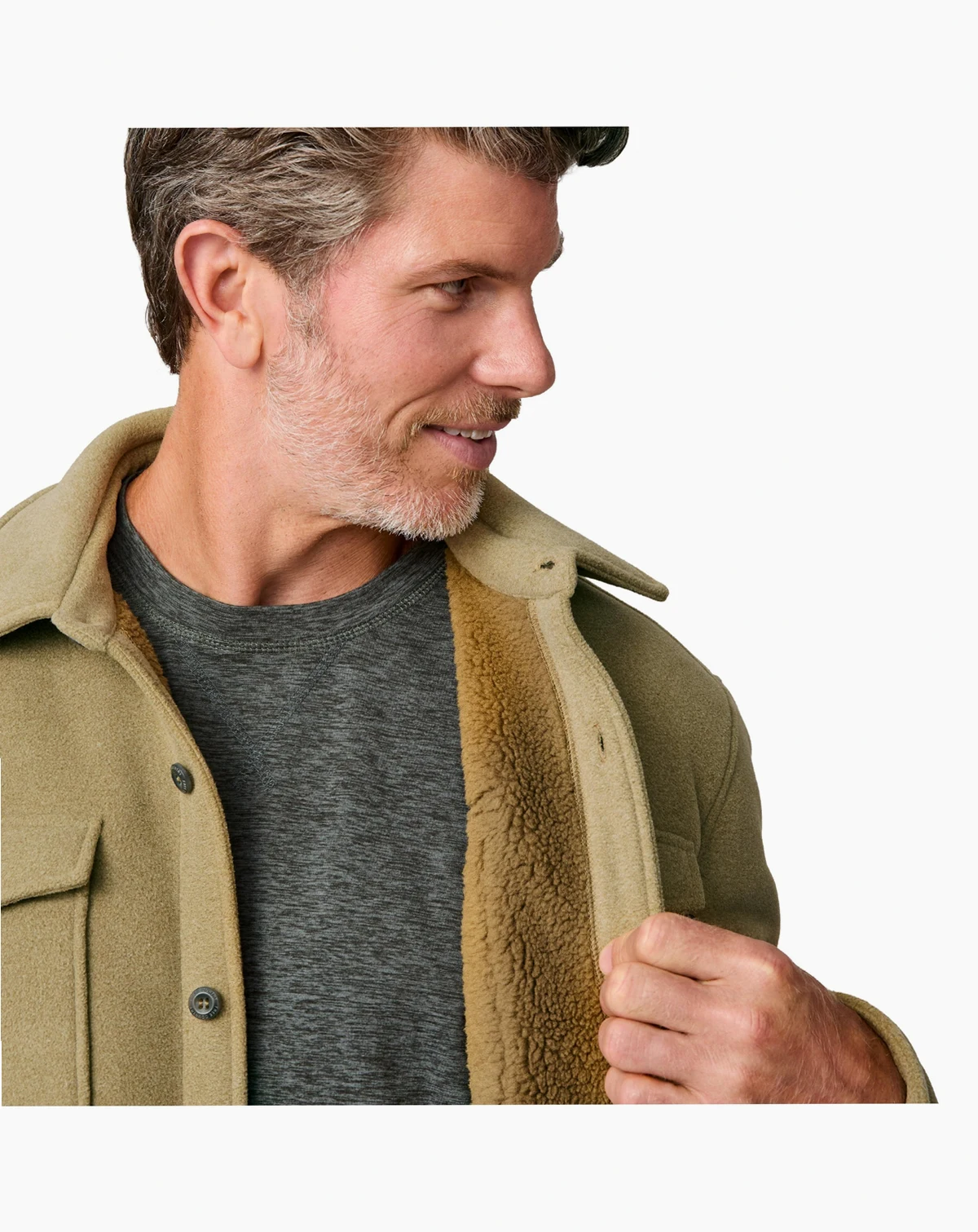 100% Polyester; Ultra-Soft Sherpa Comfort – Double-faced polyester bonded to plush sherpa delivers lightweight warmth with a sueded hand feel for all-day coziness.; Layer-Ready Versatility – Wear it solo over a thermal tee or layer beneath a shell for adaptable cold-weather comfort.