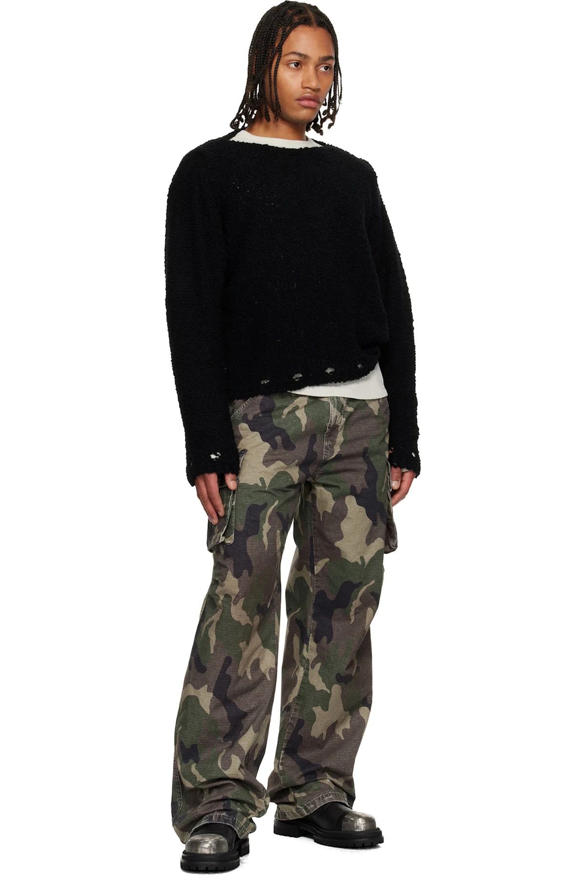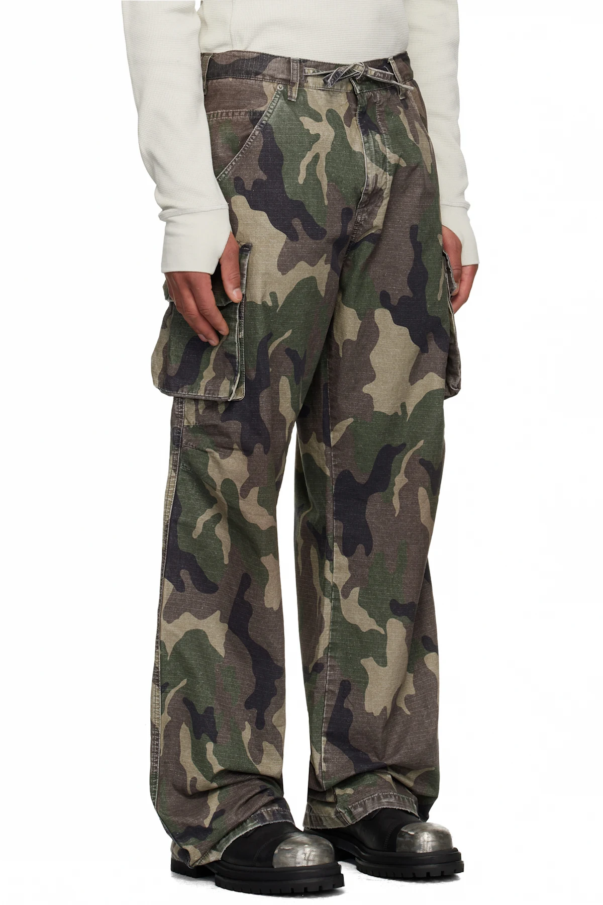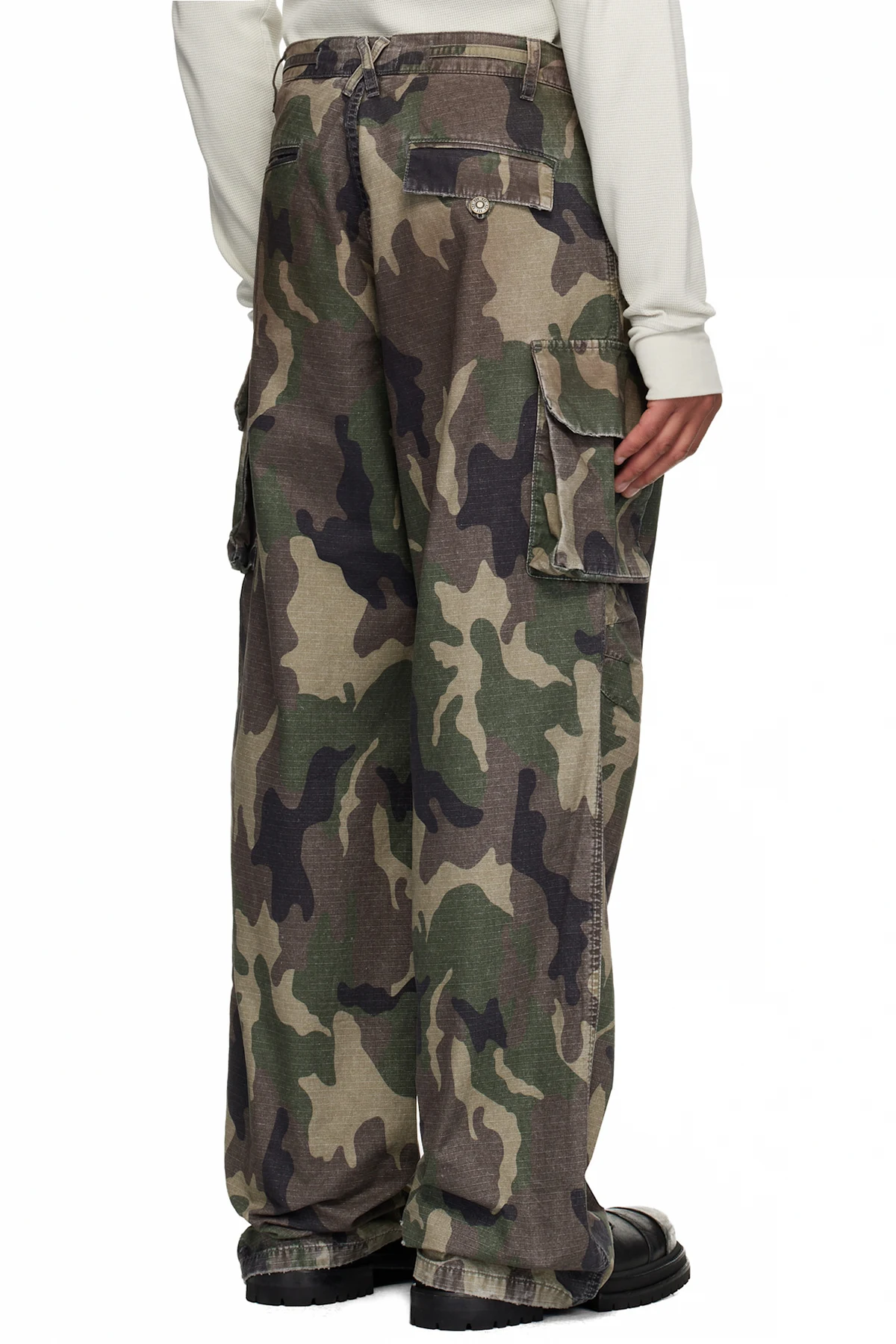 · Fading, distressing, and printed camouflage pattern throughout