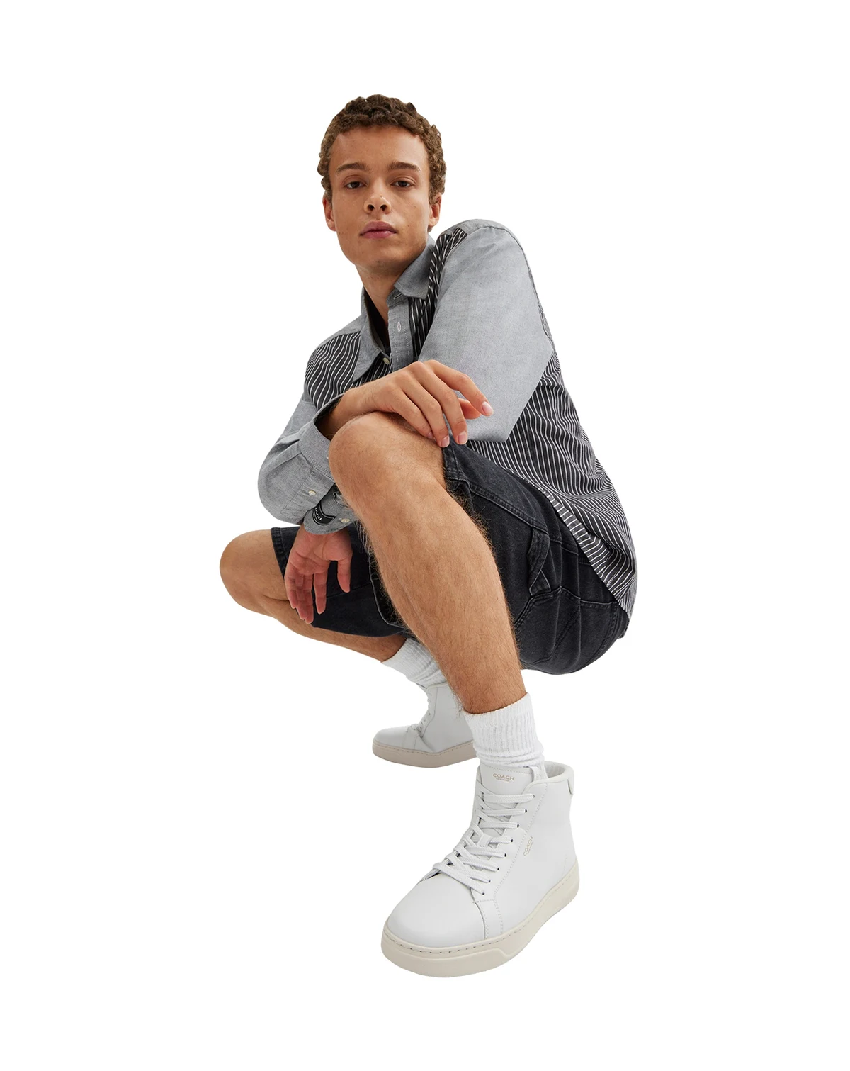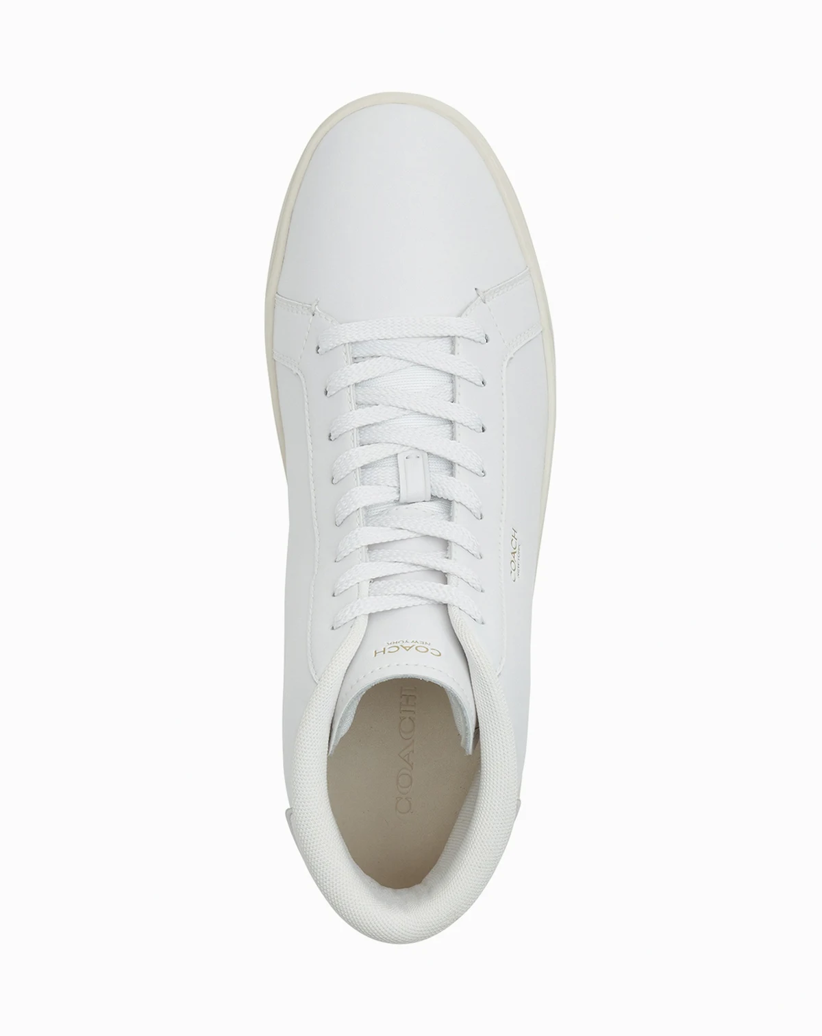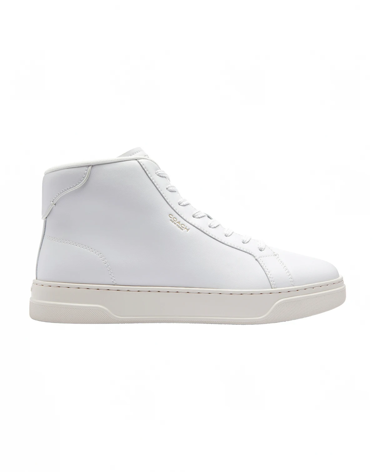 Elevate your casual look with these COACH high-top sneakers. Round toe construction provides comfortable fit and modern aesthetic. The high-top silhouette offers ankle coverage and contemporary style. These shoes blend athletic inspiration with sophisticated craftsmanship.