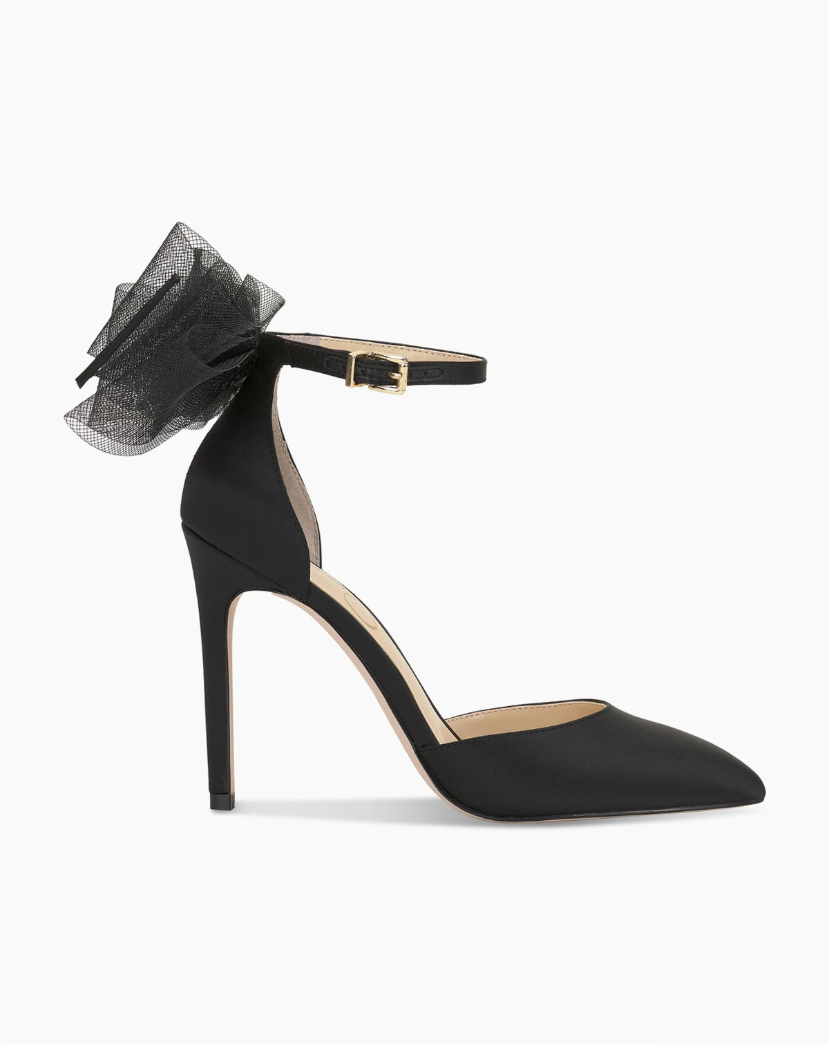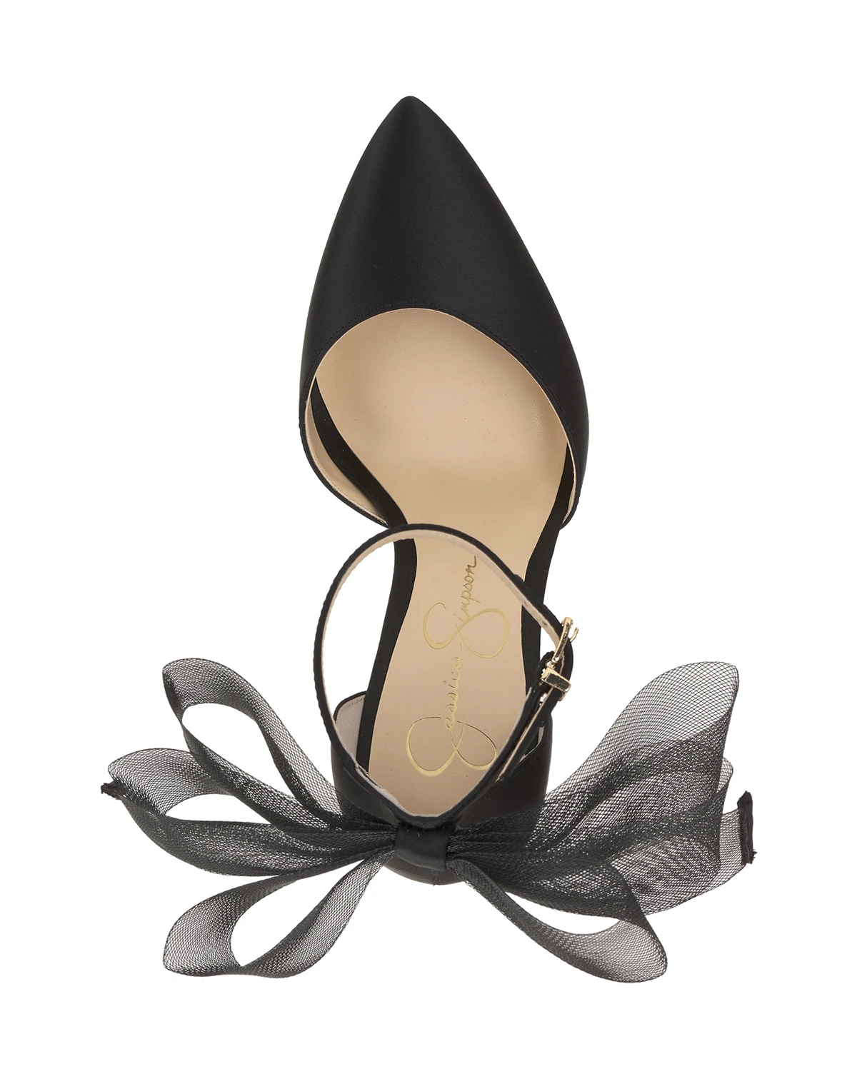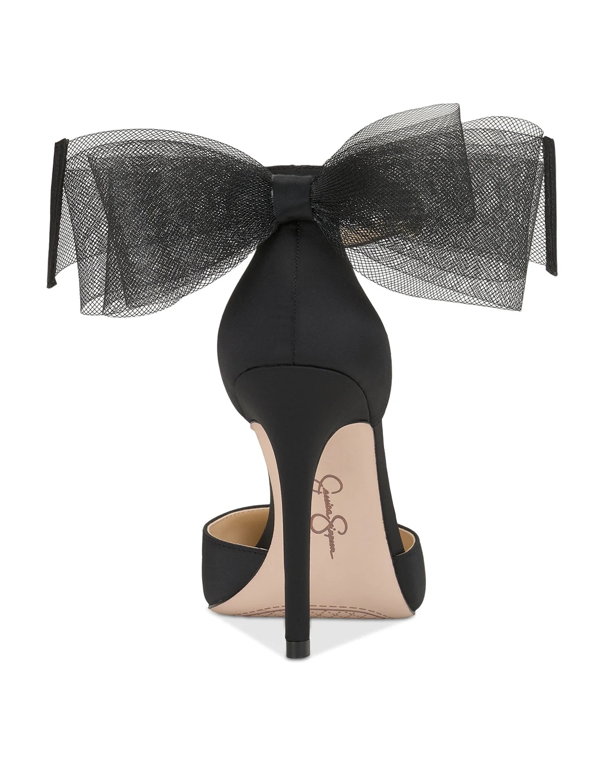 A two-piece design pairs with pointed toes and flouncy bows for a fun look over stiletto heels in the Phindies pumps from Jessica Simpson.