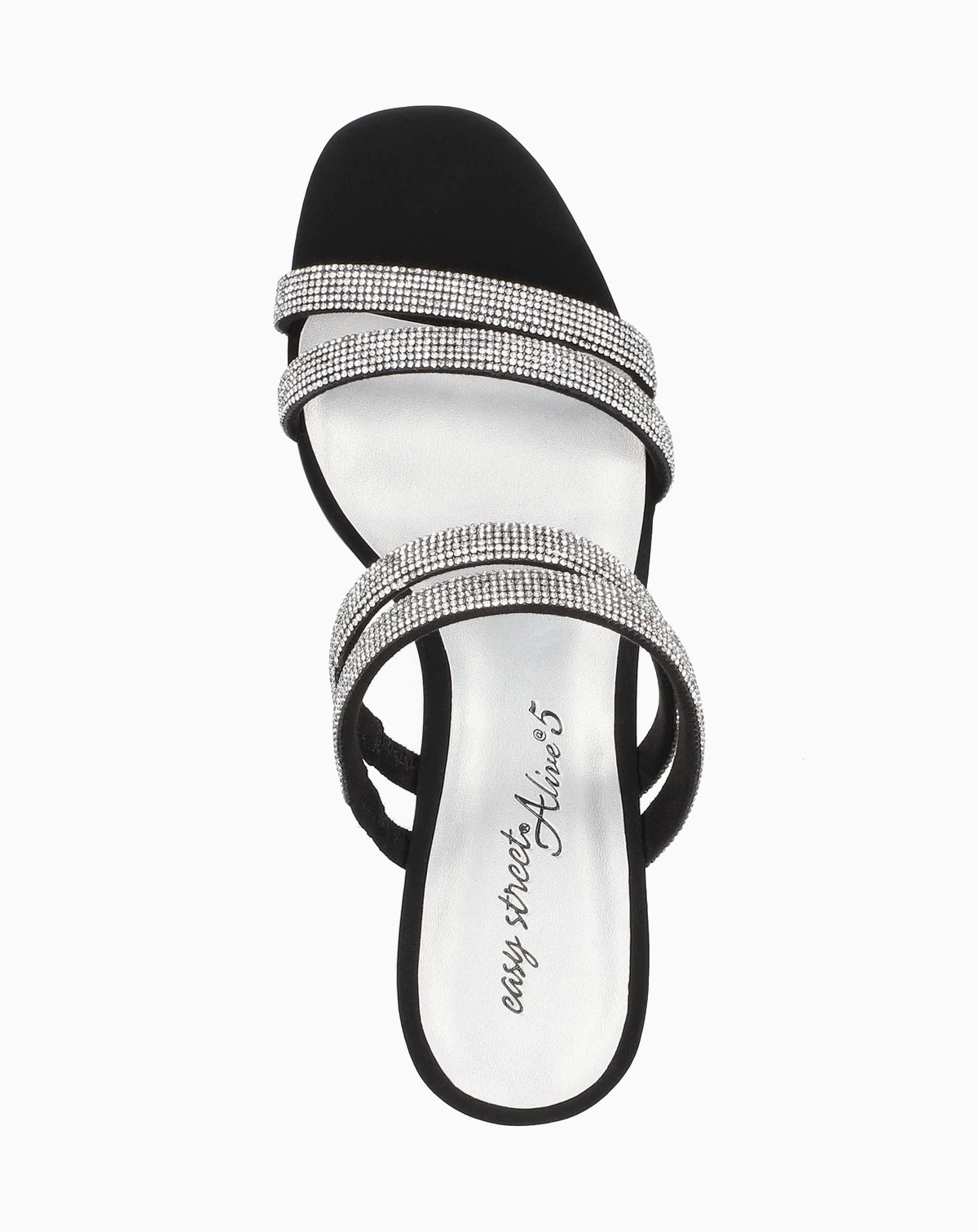 Turn up the style without sacrificing comfort in the Easy Street Jemma Sandal. The on-trend slim block heel designed with fashion in mind. The stretch-for-fit straps, the Easy Flex outsole and padded insole promote comfort. The four-band sleek open-toe versatile slide is perfect for all your spring and summer needs.