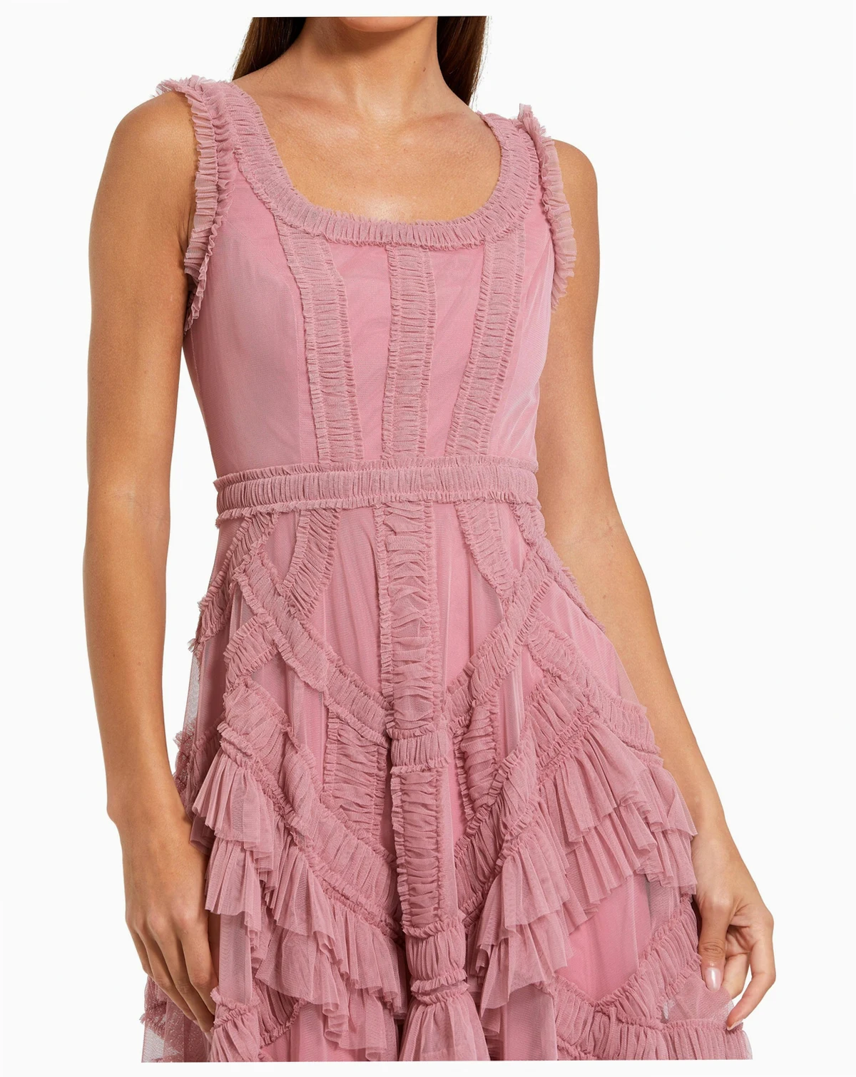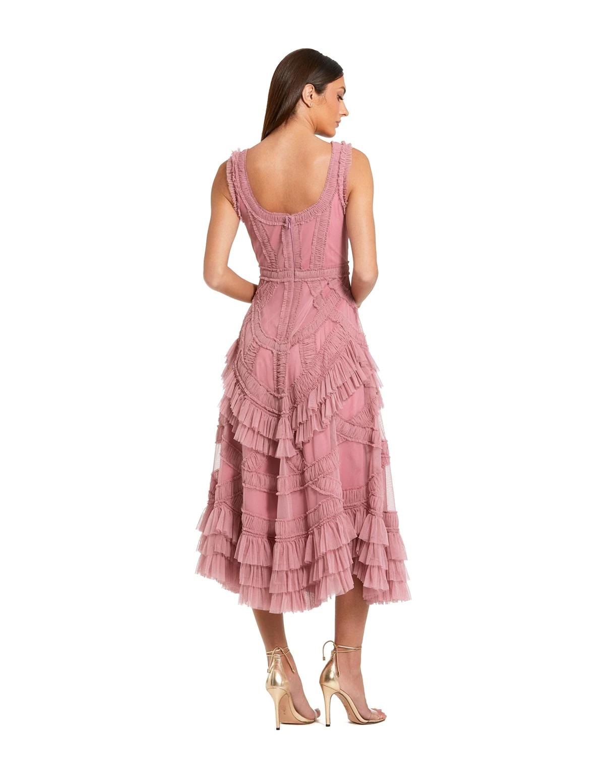 This sleeveless midi dress showcases delicate micro ruffles and cascading layers for graceful movement. With a scoop neckline and flattering A-line silhouette, it embodies chic, feminine style—perfect for an effortlessly polished daytime look.